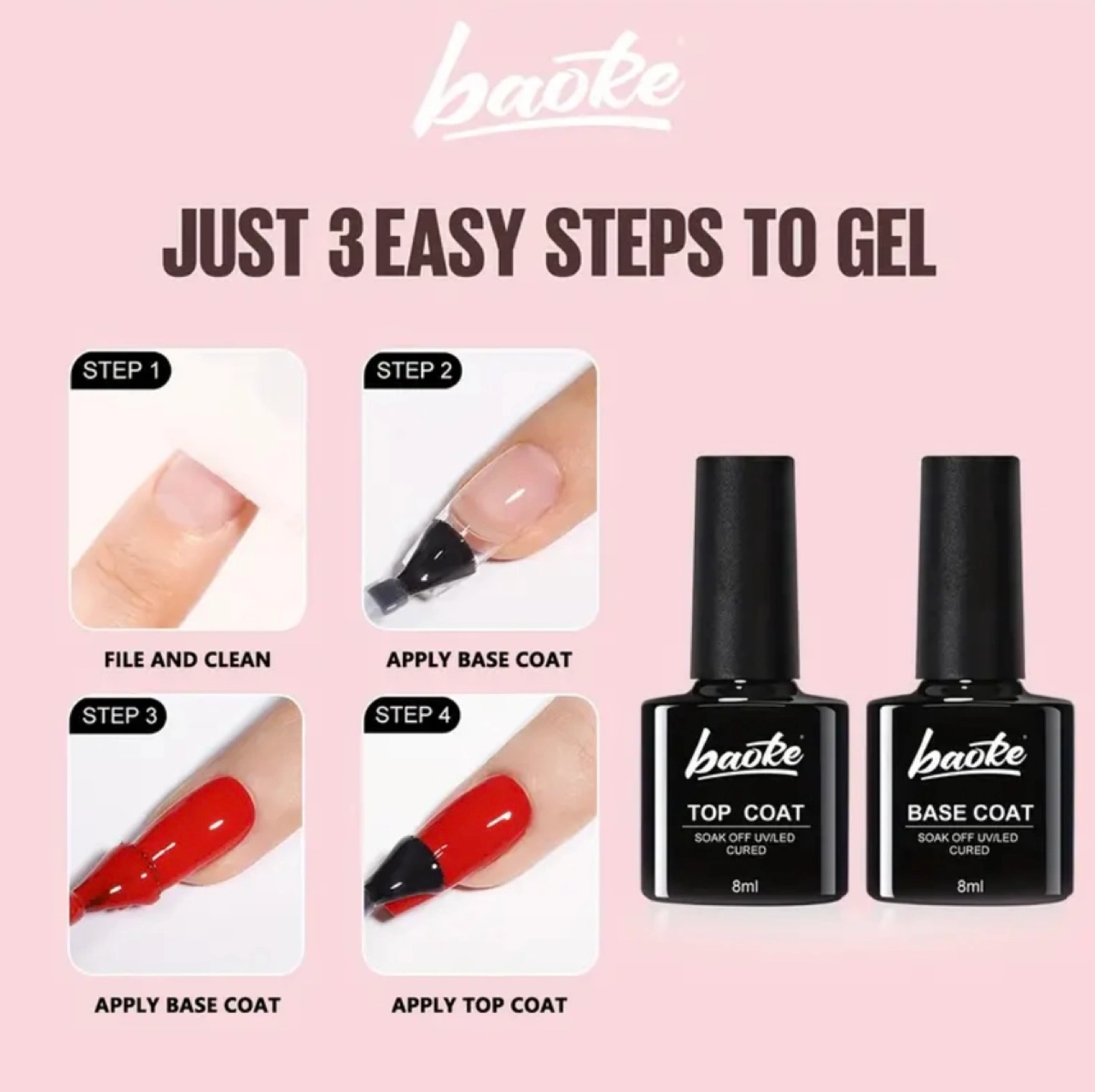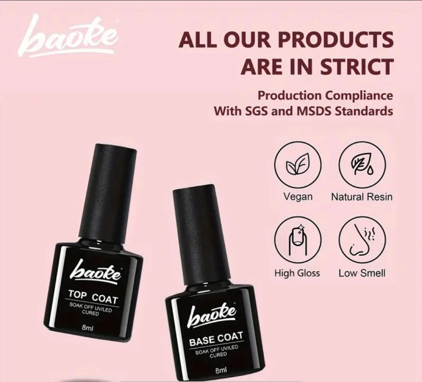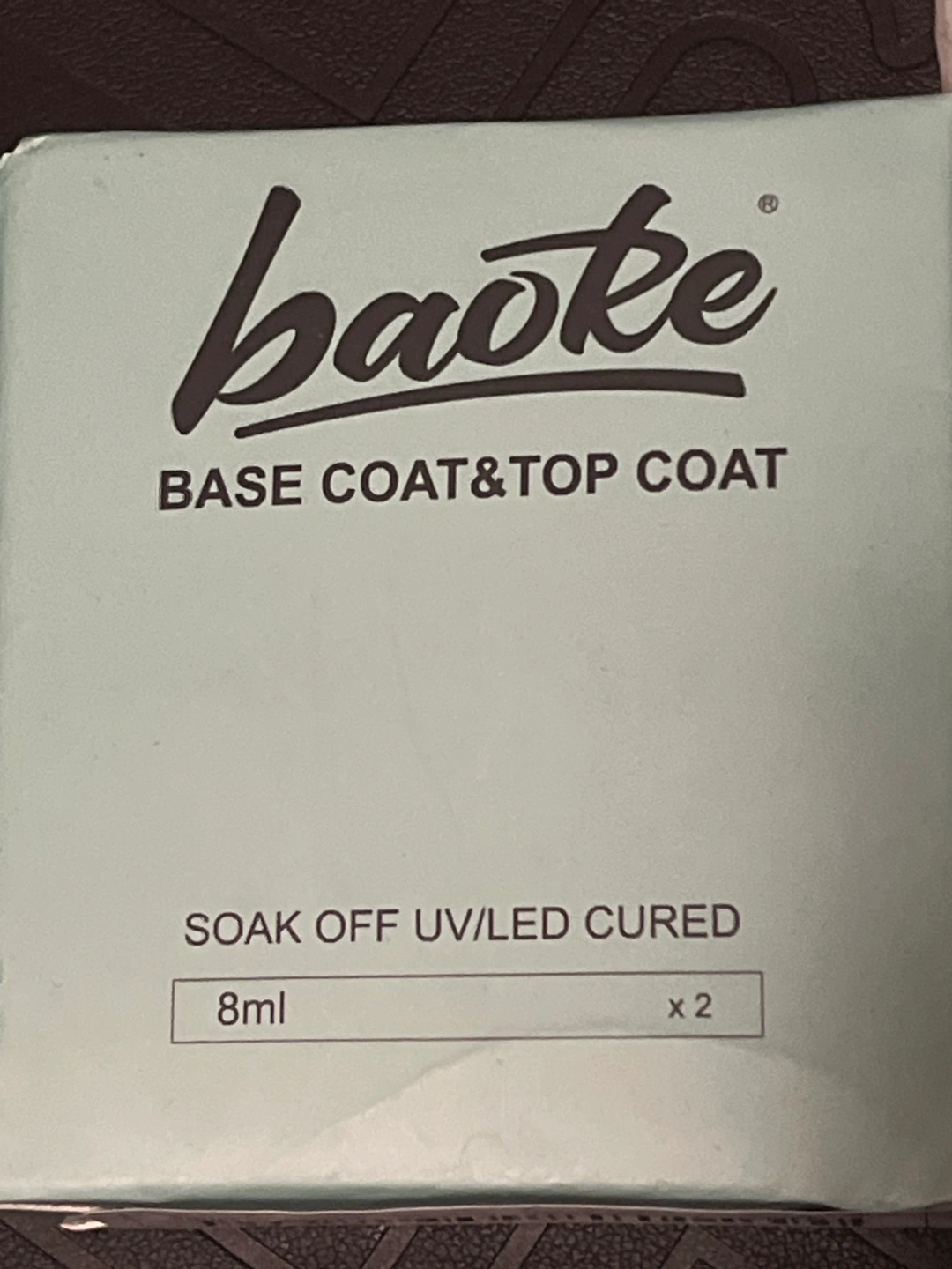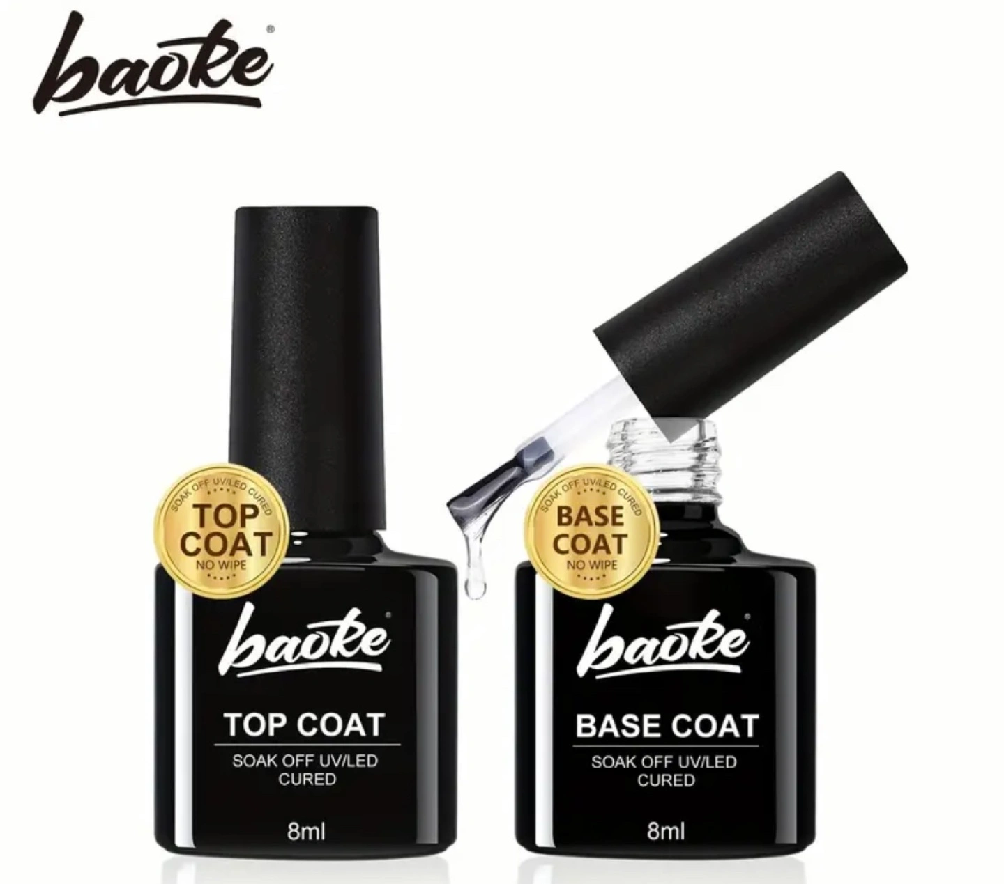 New Baioke gel nail polish set. Includes one base coat and one top coat. 8ml each. Soak off UV/LED cured. Vegan and natural resin. High gloss and low odour. MFG: 2025/01/02, EXP: 2028/01/01