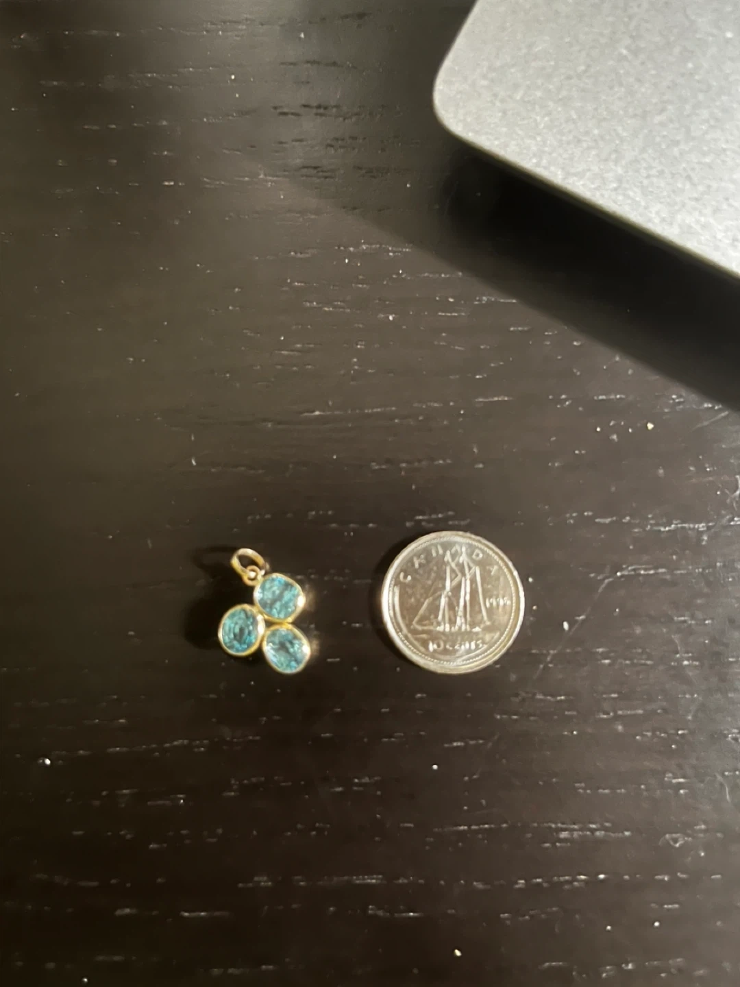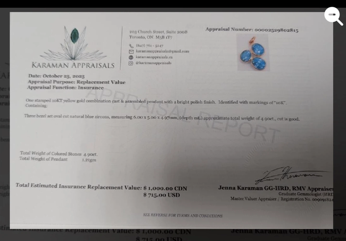 One stamped 10KT yellow gold pendant with a bright polish finish. Features three bezel set oval cut natural blue zircons, measuring 6.00 x 5.00 x 4.97mm. Total weight of colored stones is 4.90ct. This piece would be lovely for someone who appreciates fine gemstone jewellery. Appraisal value $1,000.