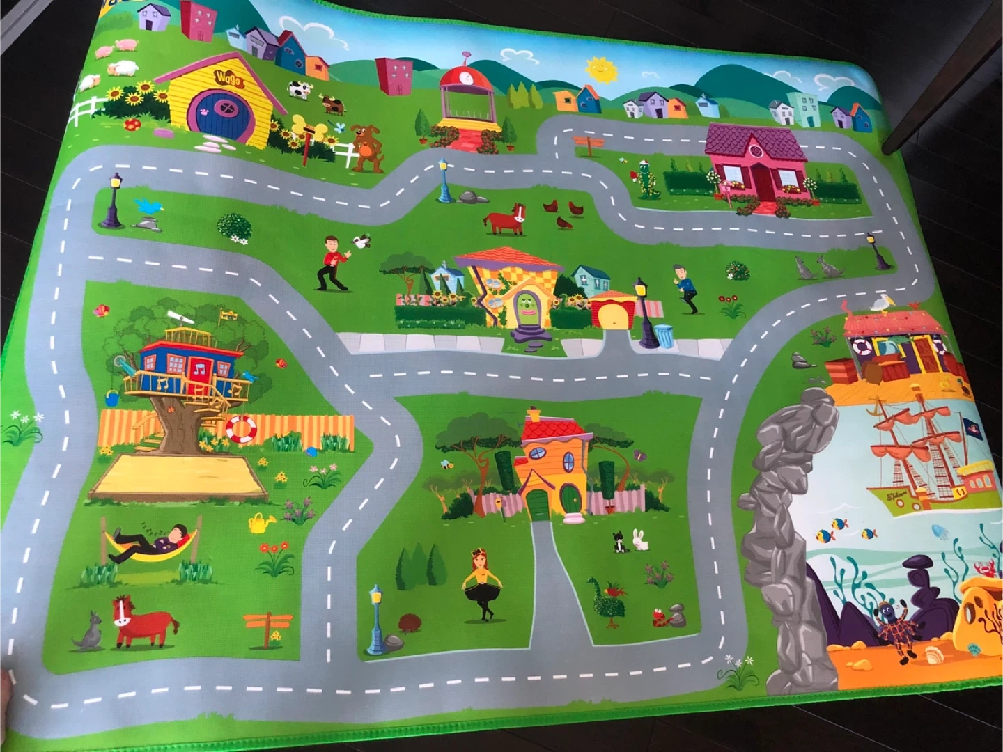 This Wiggles Megamat is made of soft, durable foam. It measures over 5 feet across for lots of play space. Great for toddlers and young children to play with toy cars or figurines!