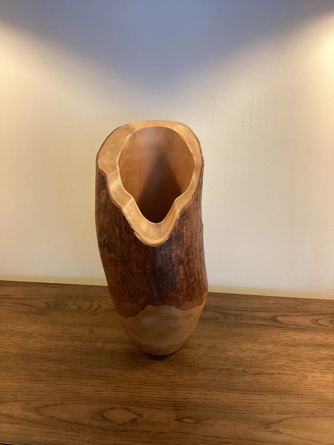 This unique wooden vase has a rough bark exterior and a smooth interior. It stands about 15 inches tall. Made from natural wood, it's perfect for dried flowers or as a standalone decorative piece.