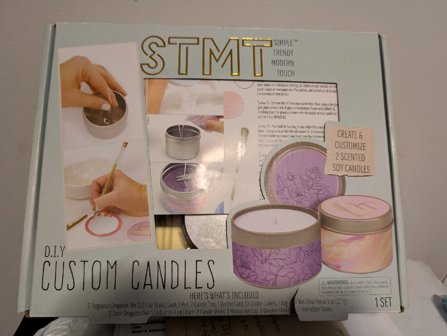 Get creative with this STMT DIY Custom Soy Candles kit! It includes everything you need to create 2 scented soy candles. Perfect for a fun project or a unique gift. The box includes fragrance droppers, a pen, candle tins, a recipe card, sticker labels, color droppers, candle wicks, a measuring cup, wooden sticks, and instruction sheets