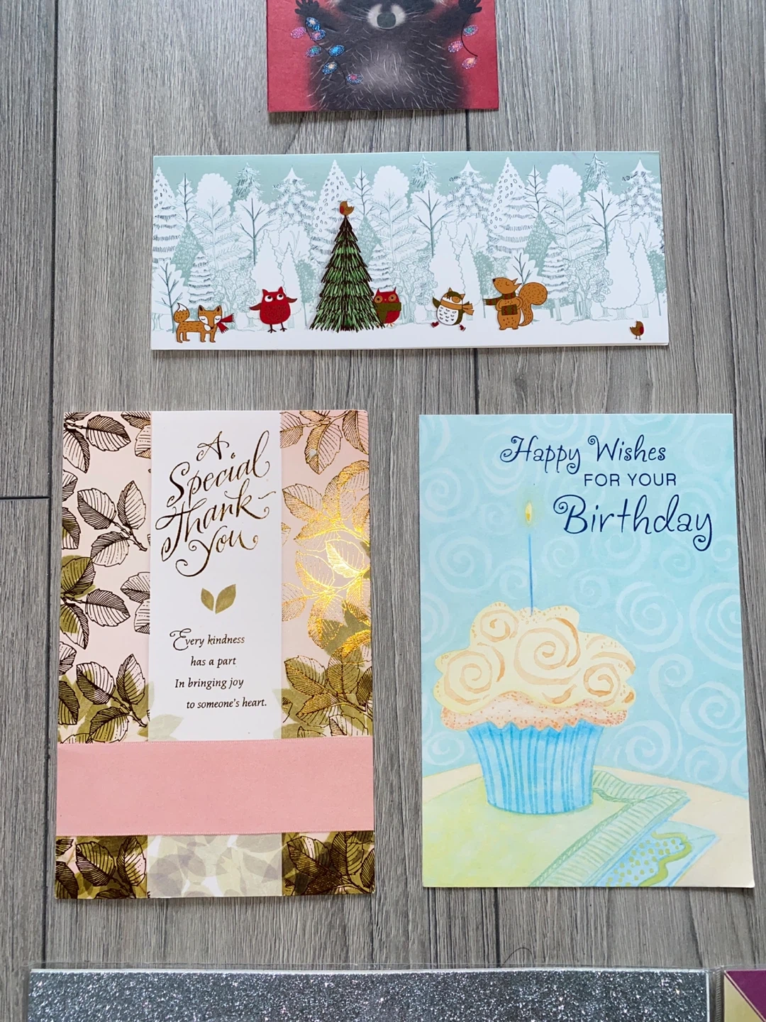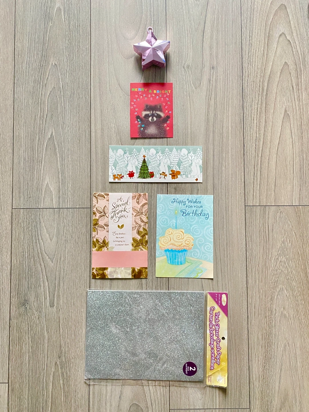 A collection of assorted greeting cards, perfect for various occasions, cute pink paper or helium balloon weight, 2 sheets of silver glitter paper! Raccoon card is single sheet card.