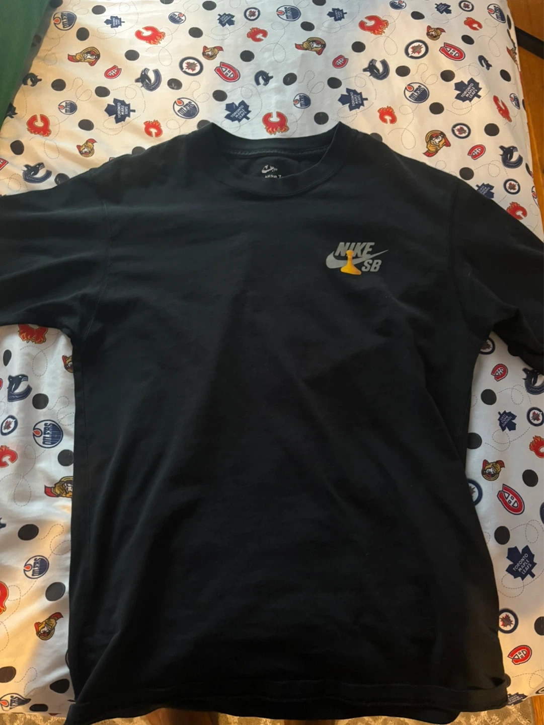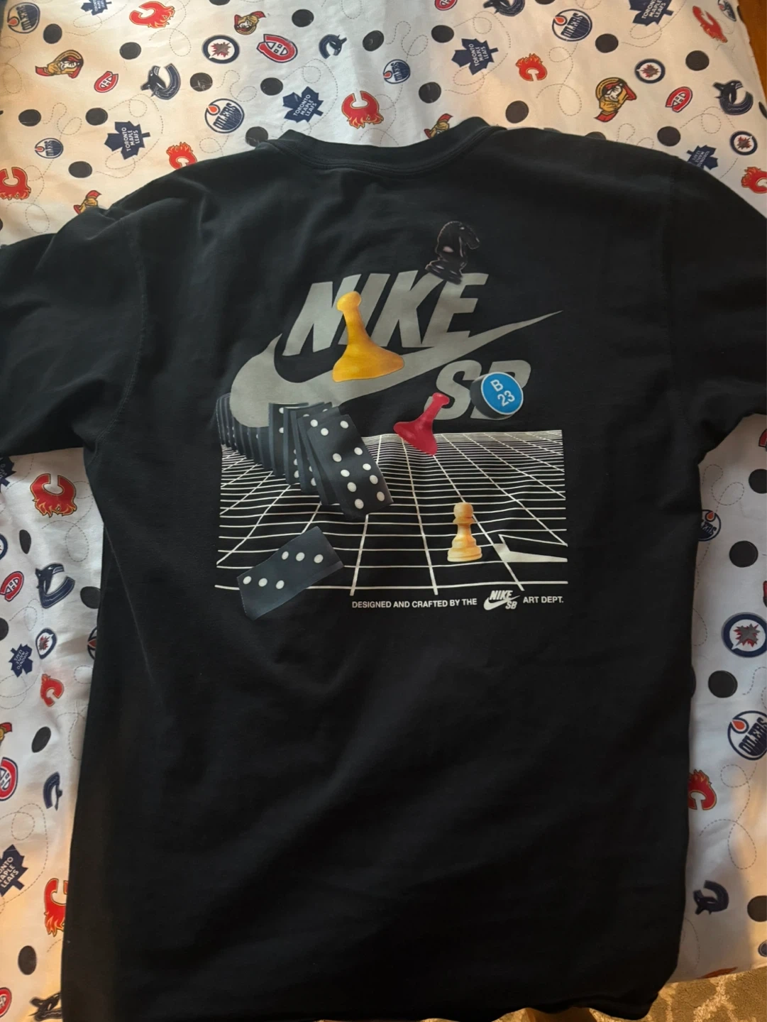 Black Nike SB t-shirt with a graphic print on the back. It's made of comfortable fabric. This tee is great for casual wear or skateboarding.