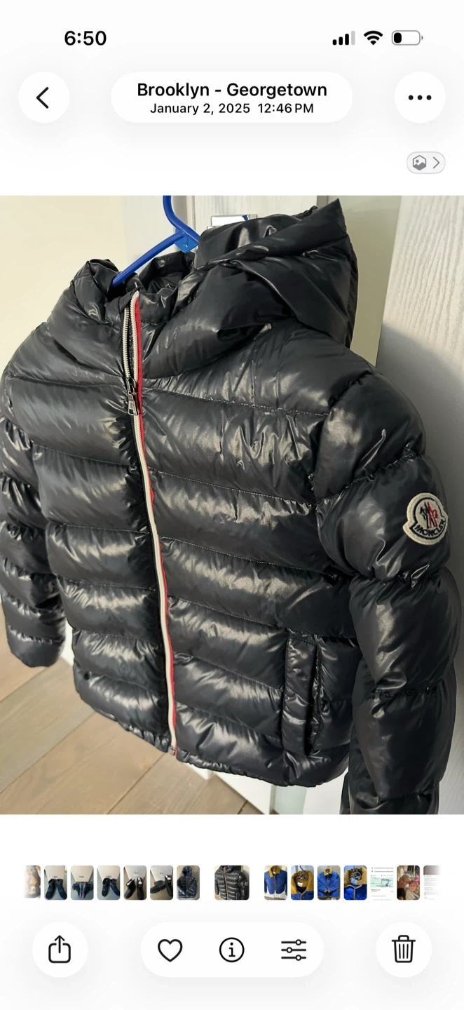 Glossy black Moncler puffer jacket with a hood. Features the iconic Moncler logo patch on the sleeve. Made for warmth and style!