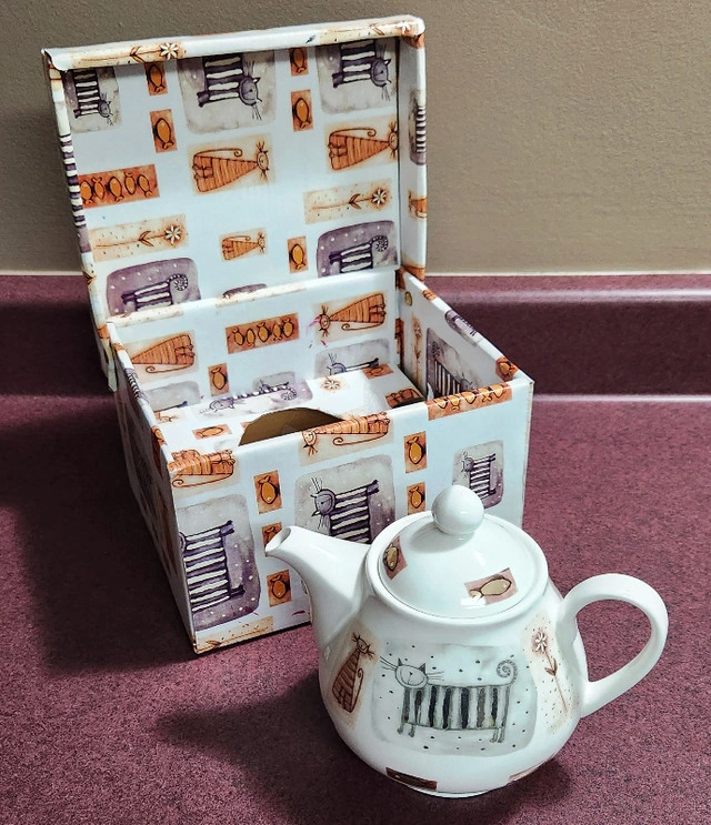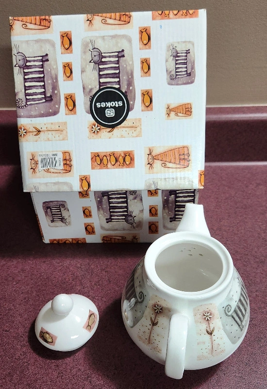 Stokes "Metallic Cat" Teapot New, never used - Has it's own decorative storage box, patterned with same images on the teapot - Not microwave or dishwasher safe - Metallic gold & silver embellishments in the images on the teapot - Decorative and functional Cat themed small teapot, perfect for two cups. Lovely details on teapot--cute cats fish and flowers. Makes a lovely gift for the cat lover on your list or for yourself. Asking $40.00