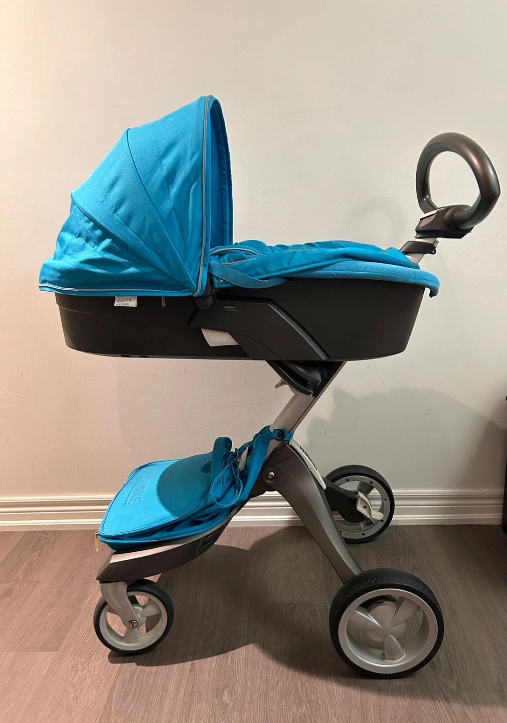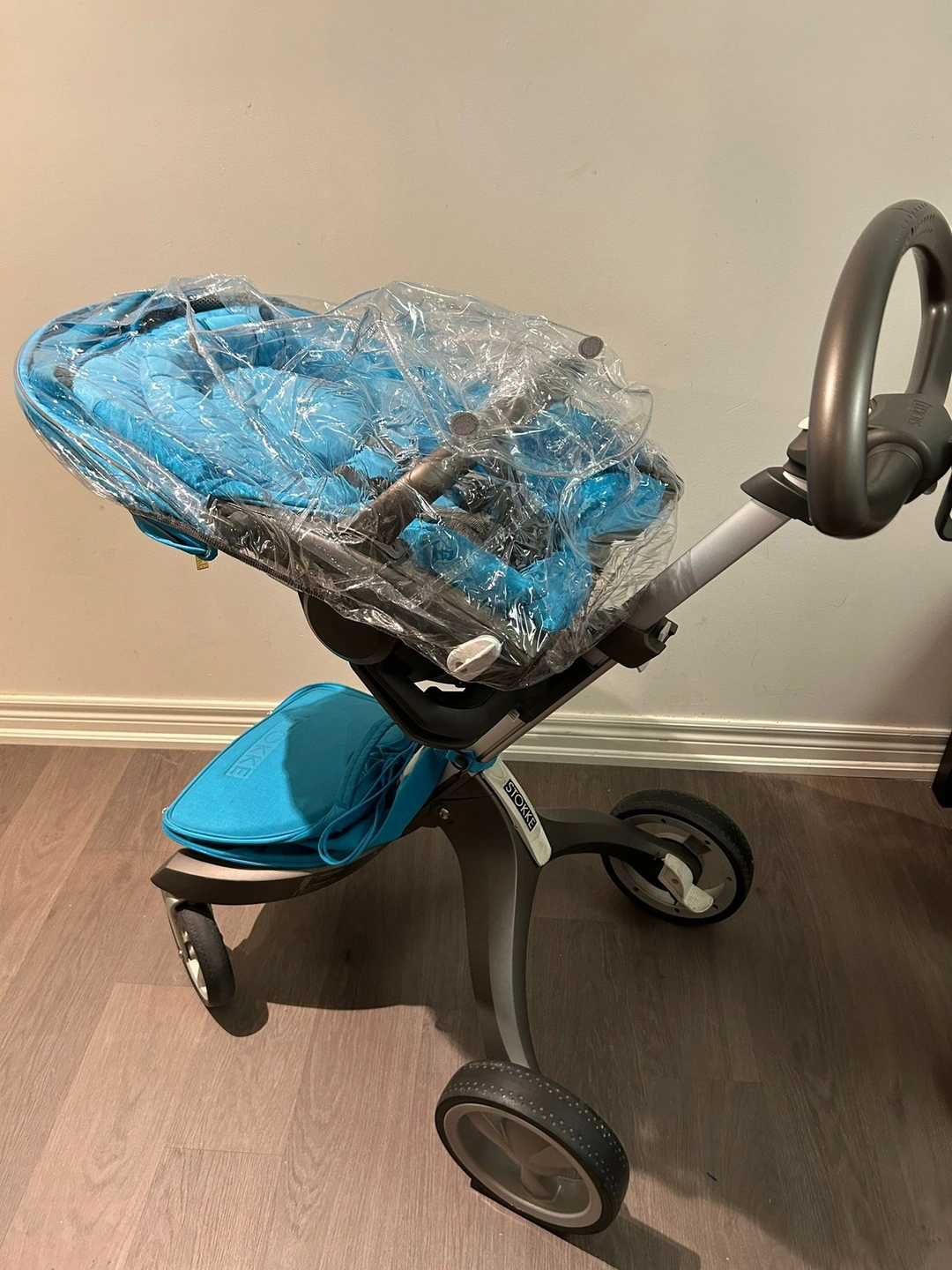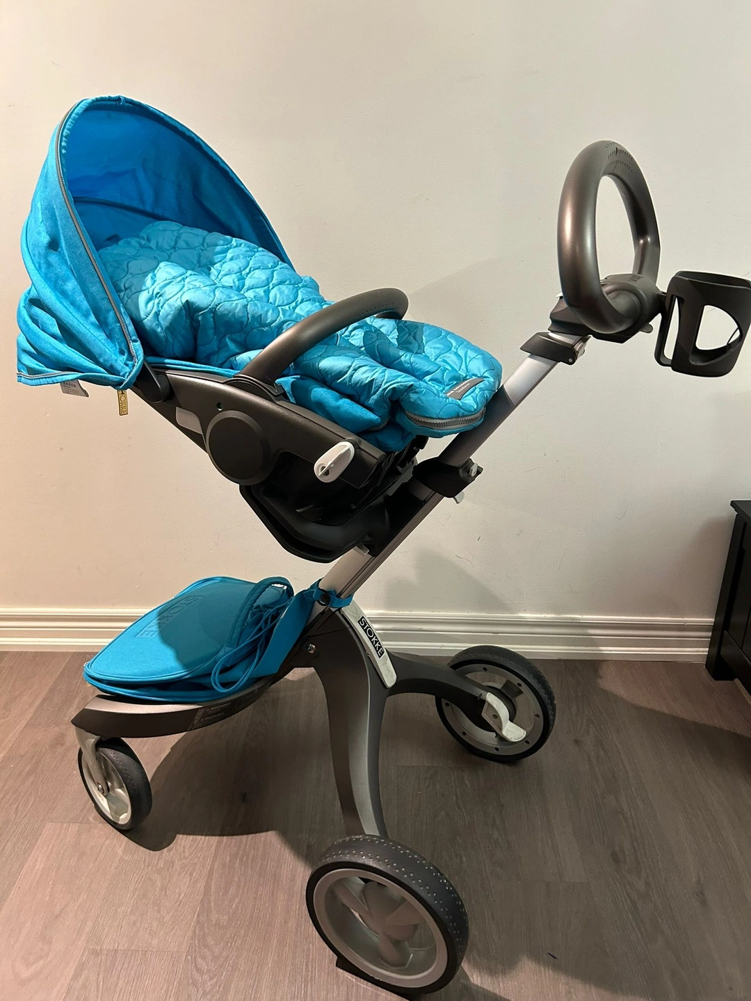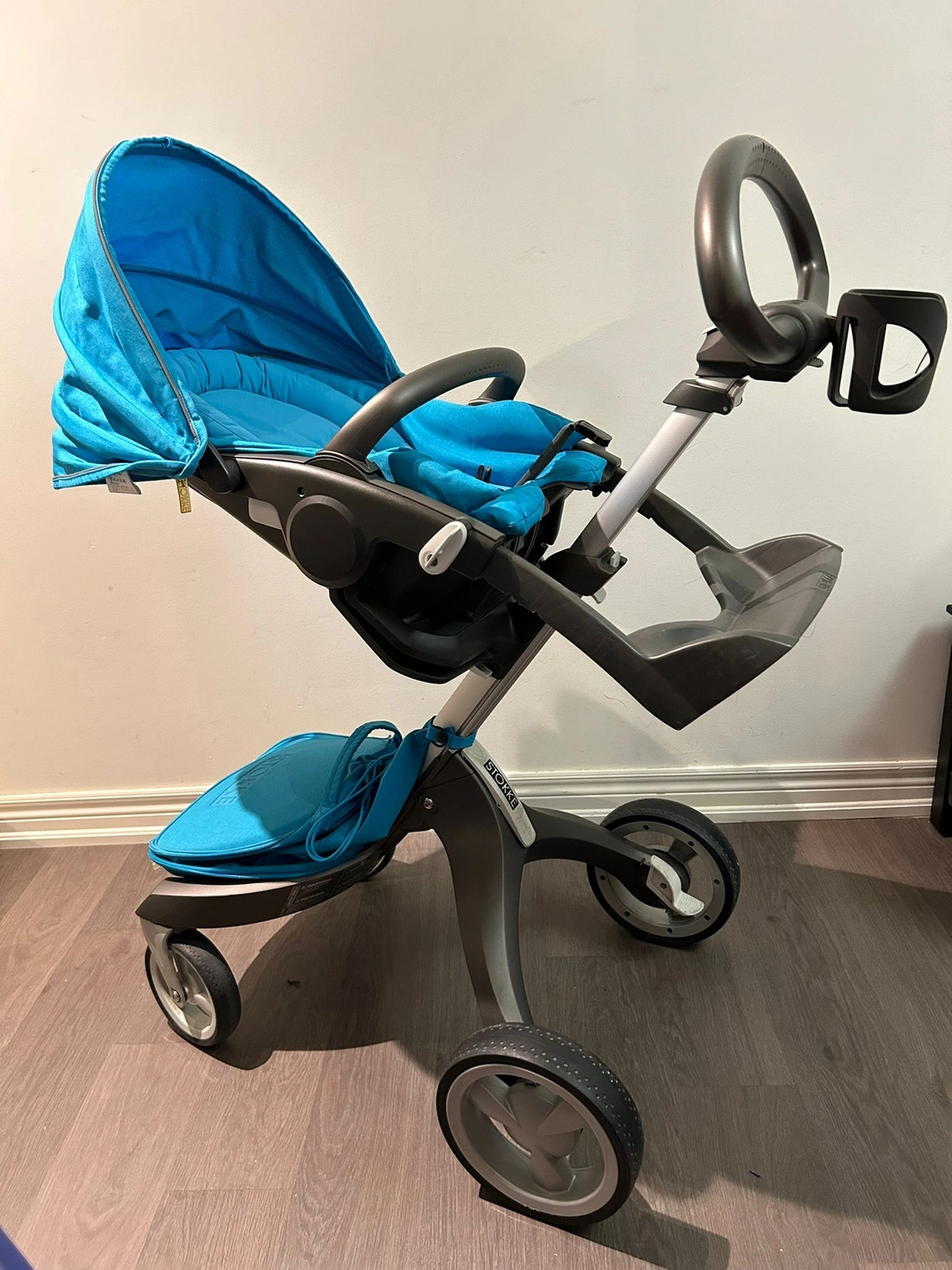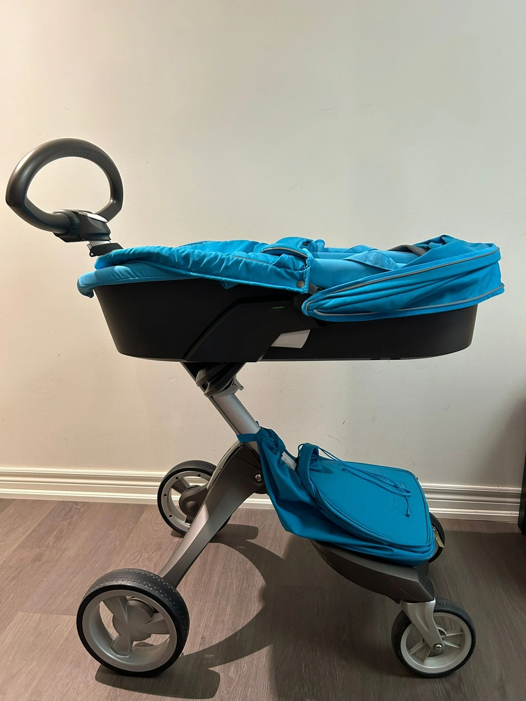 16STOKKE Xplory Stroller (removable infant insert) + Carry cot (Turquoise) This premium Scandanavian stroller is the preferred choice for parents who wish to connect closer with their child. - Eye contact fosters closeness and feelings of emotional security during the early months. - Face-to-face interaction encourages babies to communicate and engage long before they are able to talk. - There's been countless times where I've pushed this stroller right up to the restaurant table instead of transferring my little one to a high chair or booster Features (too many to list!): * The stroller seat's high profile helps connect baby with parents, giving babies a sense of security. * 3 seat recline to quickly transition active baby to napping position. * One-push brake system for quick response. * Hard shell bucket seat for increased safety and a snug fit. * High seat helps avoid bending, making it easier on your back when interacting with your baby. * Effortless to maneuver with one hand with 360° swivel wheels. Dimensions: (Opened) H:70cm–115cm W:57cm L:130cm (Folded) H:99cm W:57cm L:42cm Weight 12.5kg BONUS ACCESSORIES: - Padded Carry cot with retractable canopy (vented peekaboo window) and apron. - Expandable shopping bag. Reclining and height adjustable - Stroller Seat can be parent or forward facing. - Padded infant insert, adjustable foot rests. - Cup holder, Mosquito net and rain cover, JJ Cole quilted BundleMe with thermaplush liner for those chilly days (in matching turquoise) - Car Adaptors: (May not be compatible with all car seat year/models) Peg Perego, Maxi-Cosi, Nuna Pipa, Cybex (Compare at RETAIL PRICE $1,568.99 + $299 Cot + HST) **Can meet/drop off at mutual location**