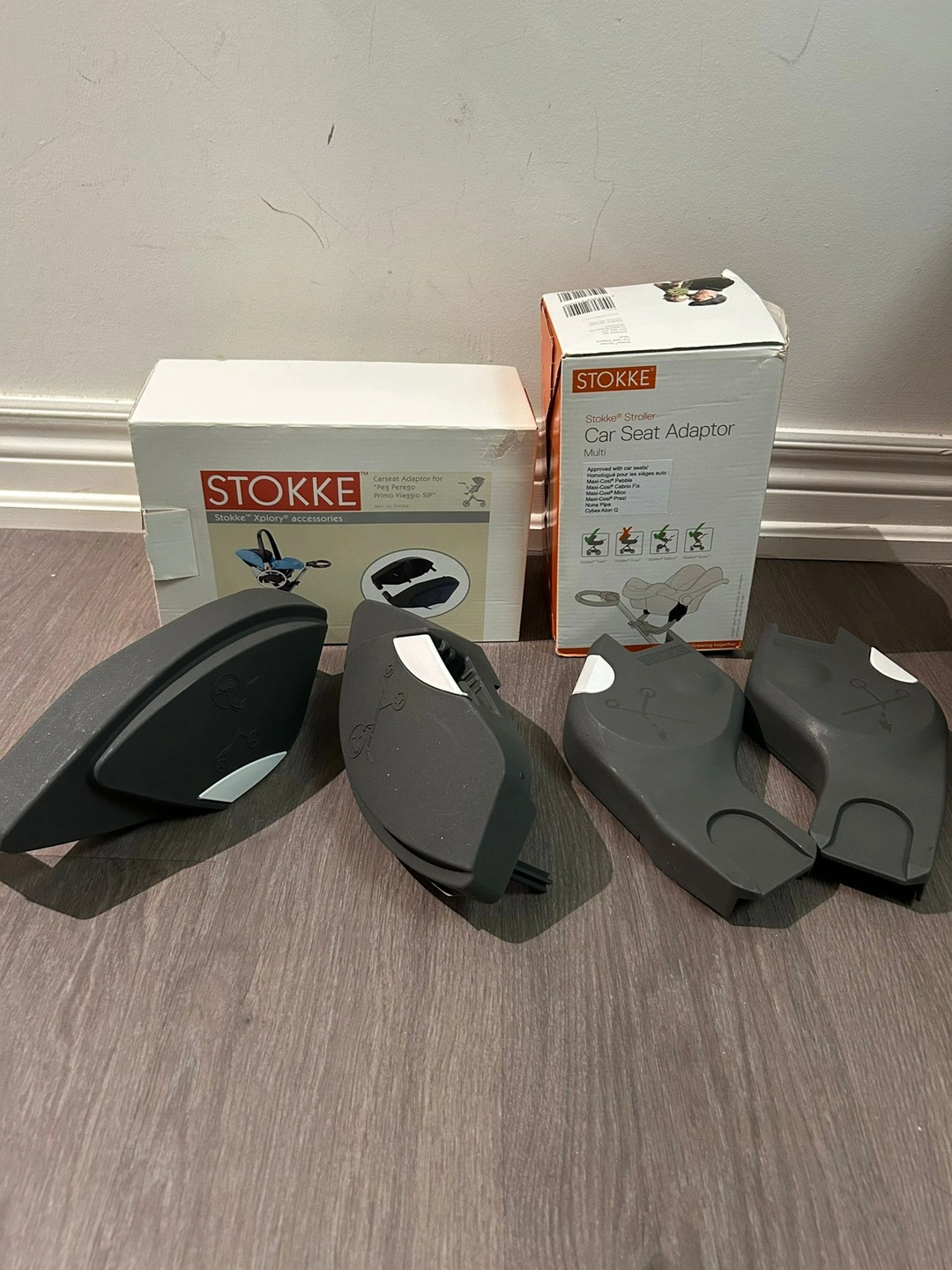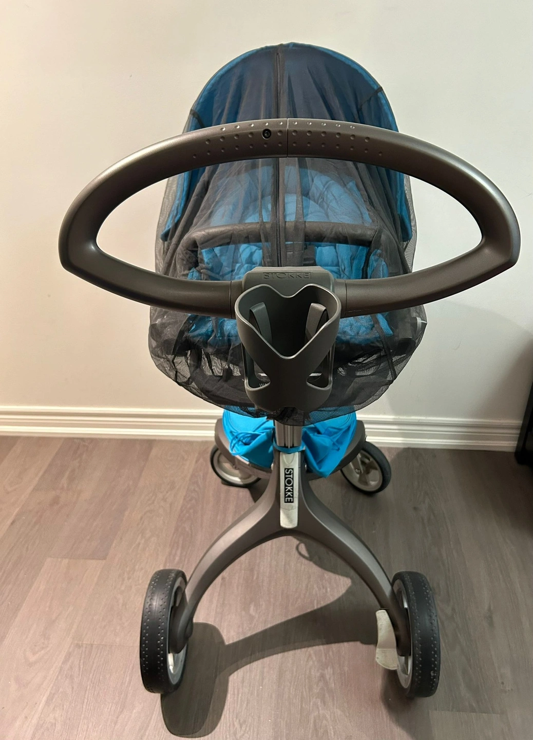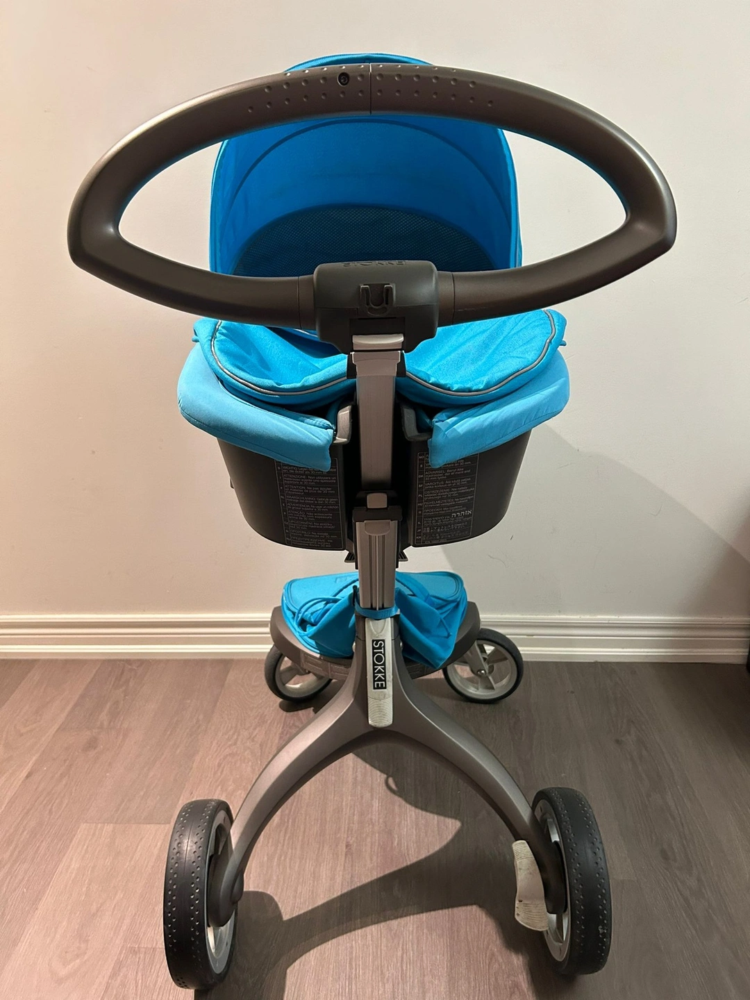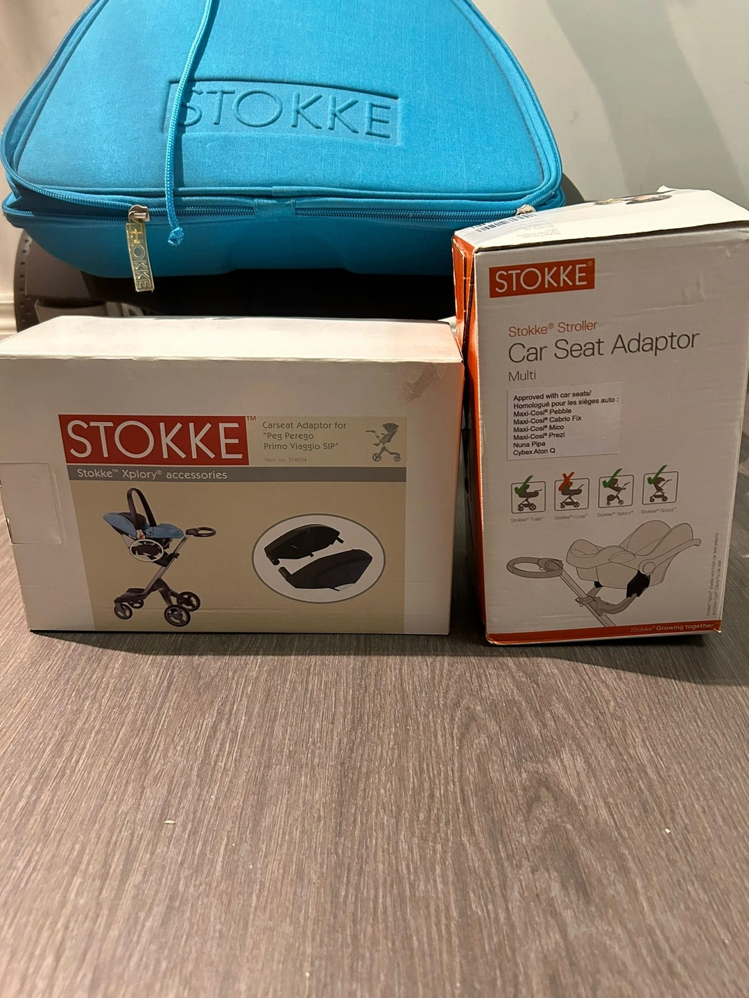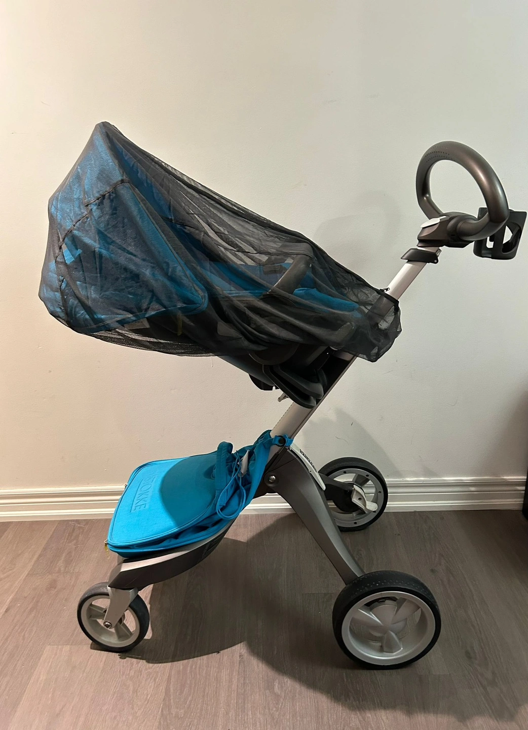 16STOKKE Xplory Stroller (removable infant insert) + Carry cot (Turquoise) This premium Scandanavian stroller is the preferred choice for parents who wish to connect closer with their child. - Eye contact fosters closeness and feelings of emotional security during the early months. - Face-to-face interaction encourages babies to communicate and engage long before they are able to talk. - There's been countless times where I've pushed this stroller right up to the restaurant table instead of transferring my little one to a high chair or booster Features (too many to list!): * The stroller seat's high profile helps connect baby with parents, giving babies a sense of security. * 3 seat recline to quickly transition active baby to napping position. * One-push brake system for quick response. * Hard shell bucket seat for increased safety and a snug fit. * High seat helps avoid bending, making it easier on your back when interacting with your baby. * Effortless to maneuver with one hand with 360° swivel wheels. Dimensions: (Opened) H:70cm–115cm W:57cm L:130cm (Folded) H:99cm W:57cm L:42cm Weight 12.5kg BONUS ACCESSORIES: - Padded Carry cot with retractable canopy (vented peekaboo window) and apron. - Expandable shopping bag. Reclining and height adjustable - Stroller Seat can be parent or forward facing. - Padded infant insert, adjustable foot rests. - Cup holder, Mosquito net and rain cover, JJ Cole quilted BundleMe with thermaplush liner for those chilly days (in matching turquoise) - Car Adaptors: (May not be compatible with all car seat year/models) Peg Perego, Maxi-Cosi, Nuna Pipa, Cybex (Compare at RETAIL PRICE $1,568.99 + $299 Cot + HST) **Can meet/drop off at mutual location**