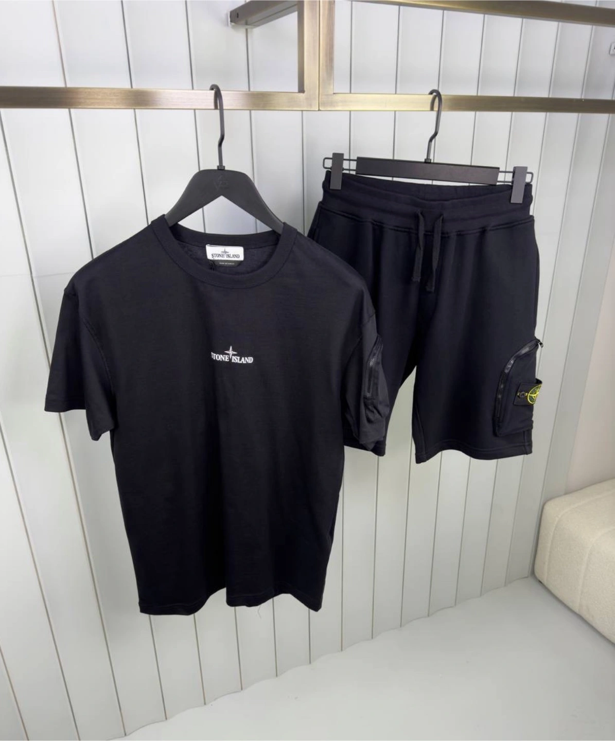 Selling a Stone Island set, which includes a black t-shirt and matching shorts. Both pieces feature the iconic Stone Island logo. Perfect for a casual and stylish look!