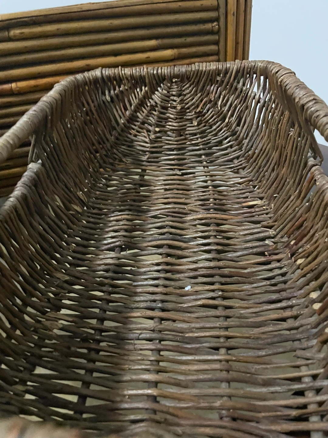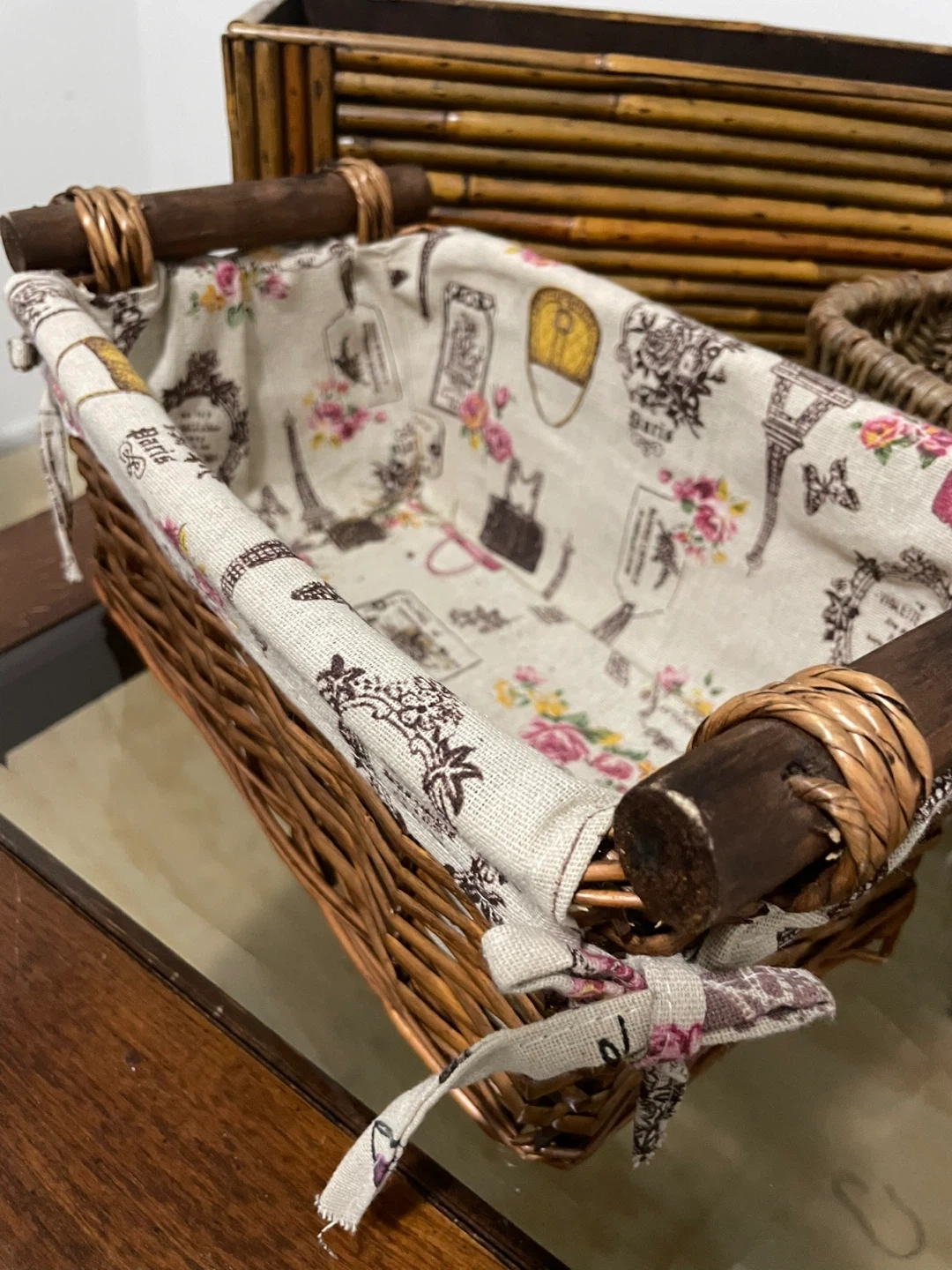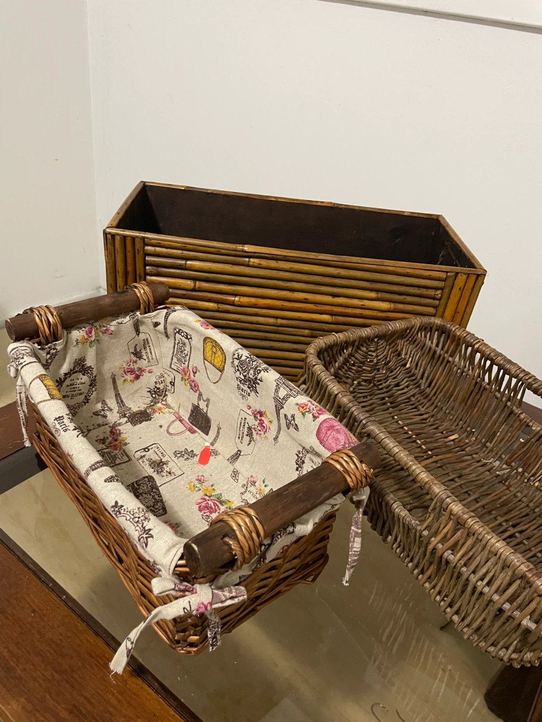 466Selling a set of three storage baskets in good condition. Bamboo/rattan style: L 17” W 8” H 7.5” Wicker with Parisian fabric liner design: L 11.5” W 7” H 5.5” Plain wicker: L 14” W 8.5” H 5” Take all for $15! 🧺