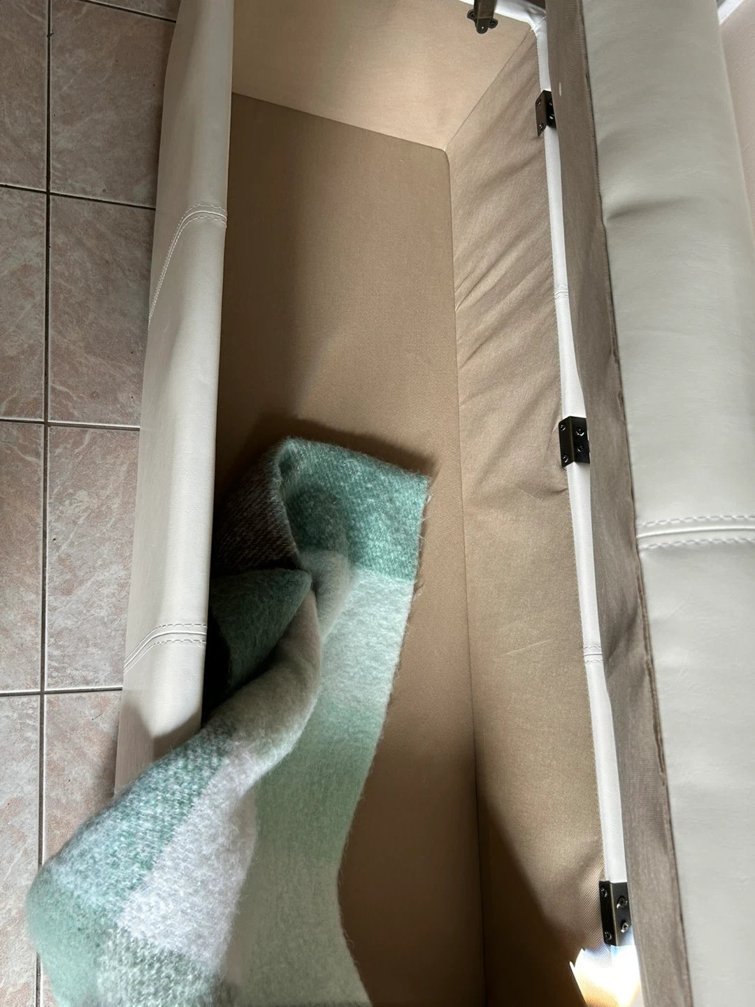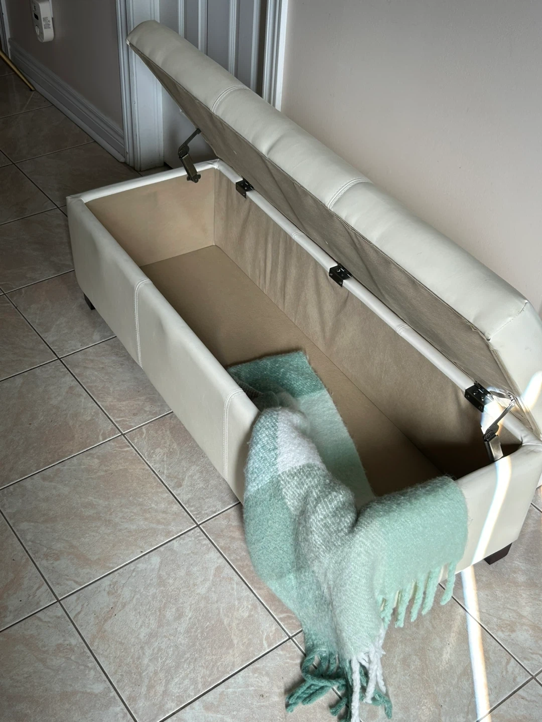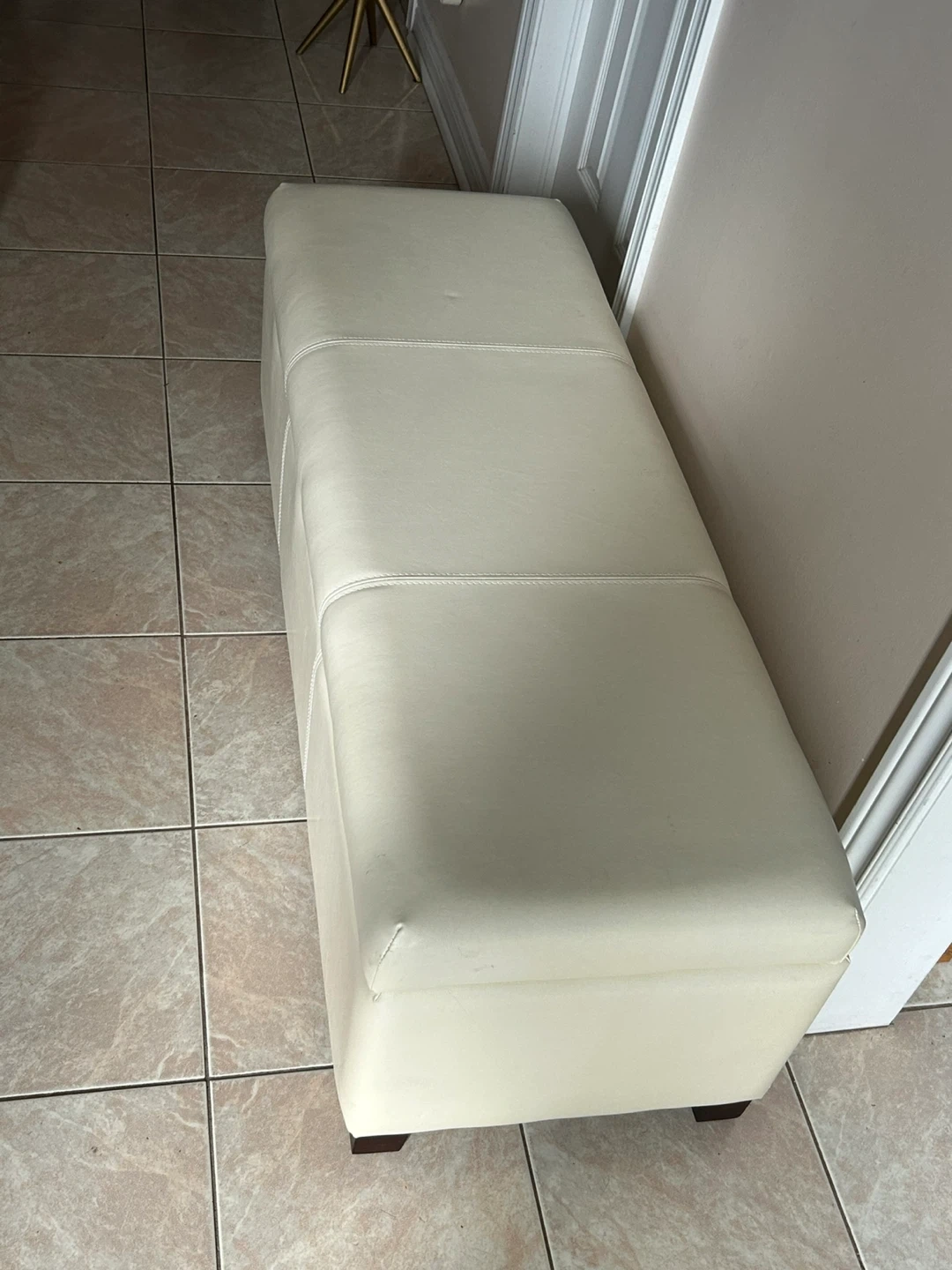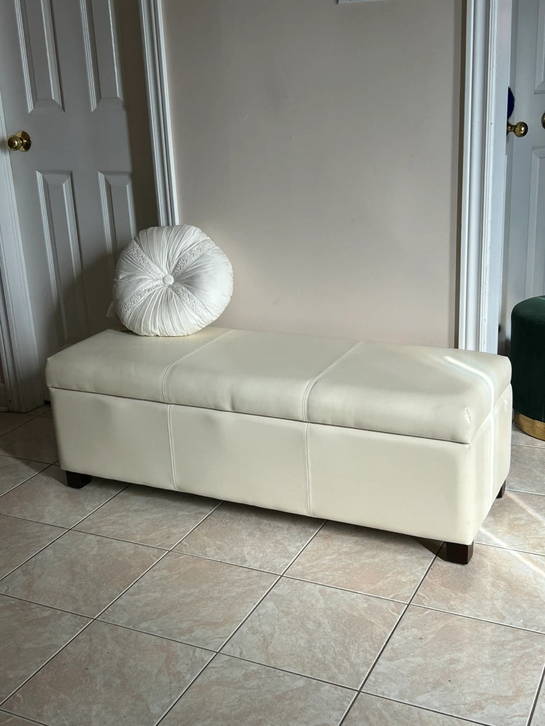 53Selling a storage ottoman bench in ivory colour. It's in great condition and perfect for extra seating and storage. It would look great in any space!