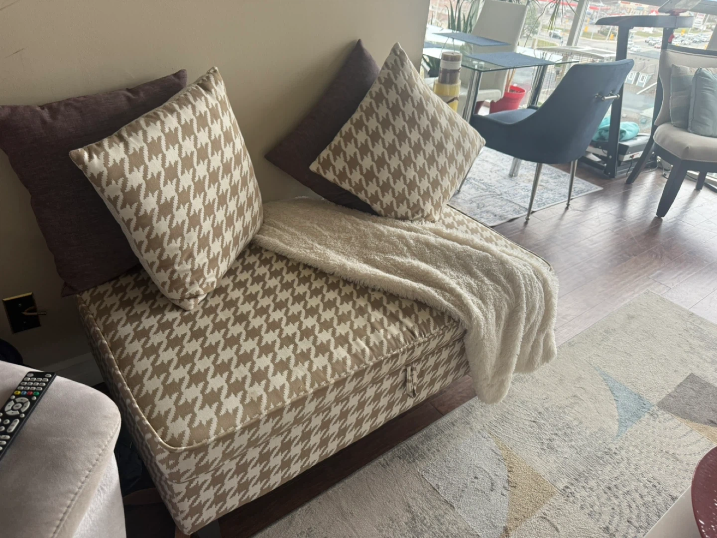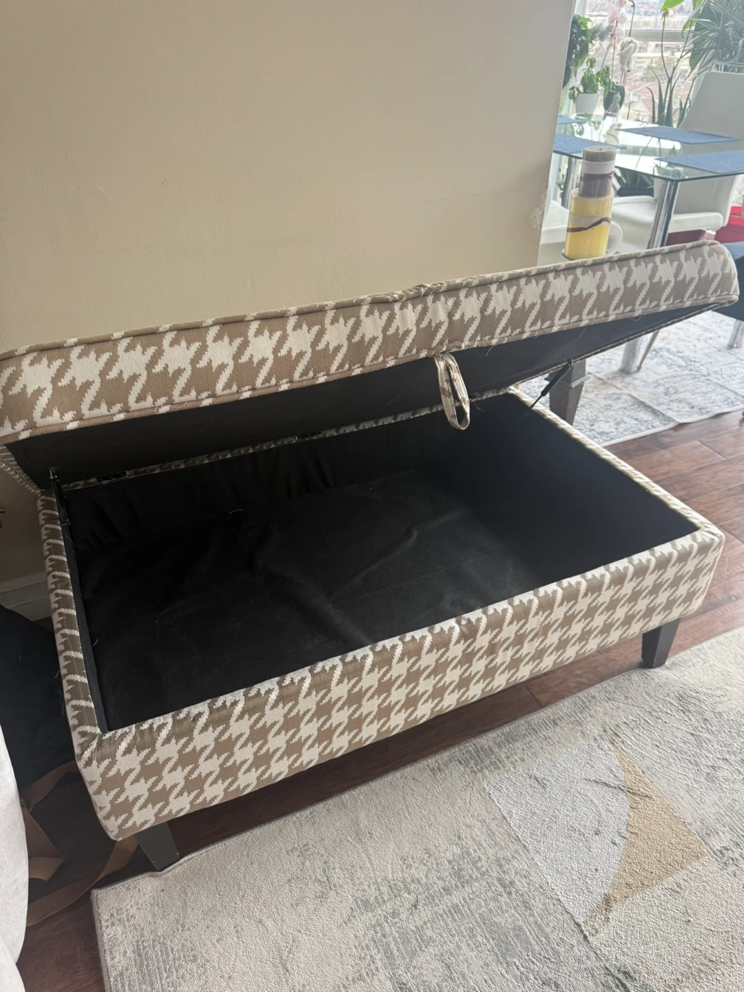 10Storage ottoman bench with a stylish houndstooth pattern. It's in great shape and offers a good amount of storage space inside. Perfect for adding extra seating and keeping your living area tidy!