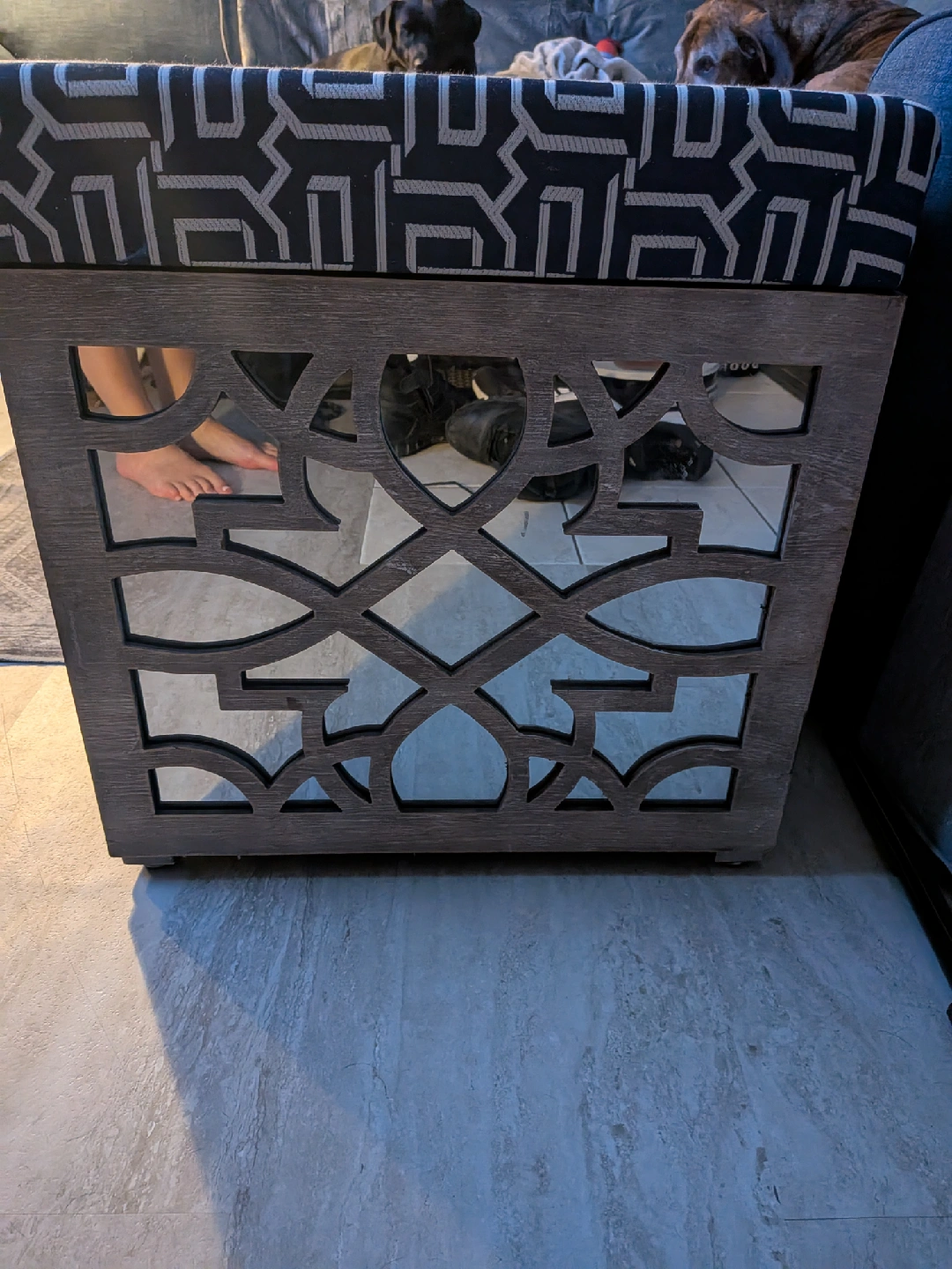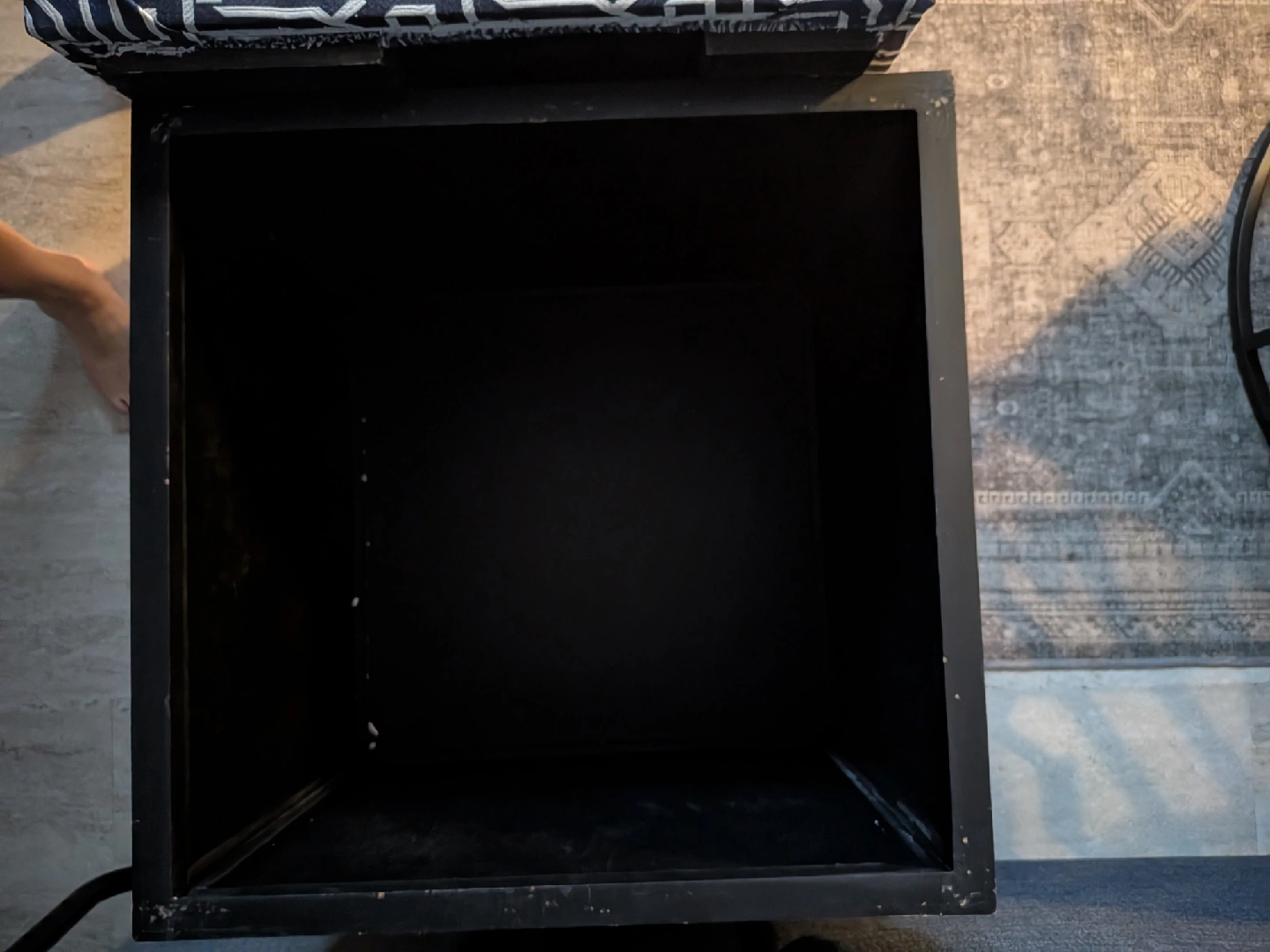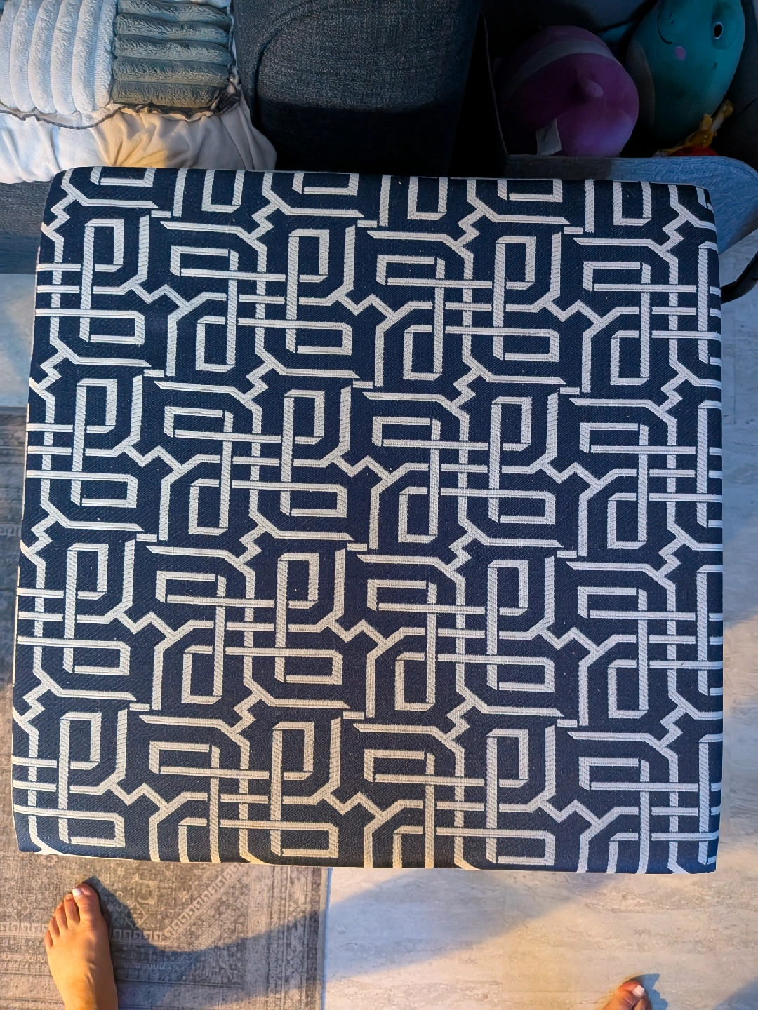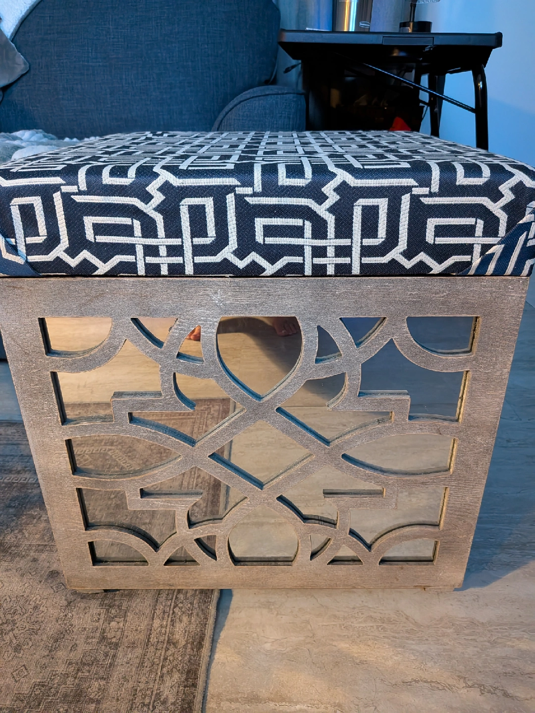 This storage ottoman is perfect for adding extra seating and storage to any room! It features a stylish patterned cushion top and a unique cut-out design on the sides. The interior provides ample space for storing blankets, pillows, or other household items. A great addition to any living space!