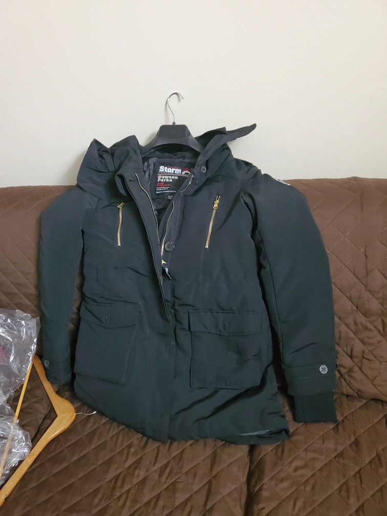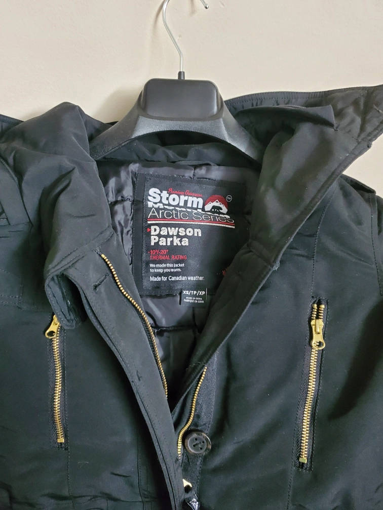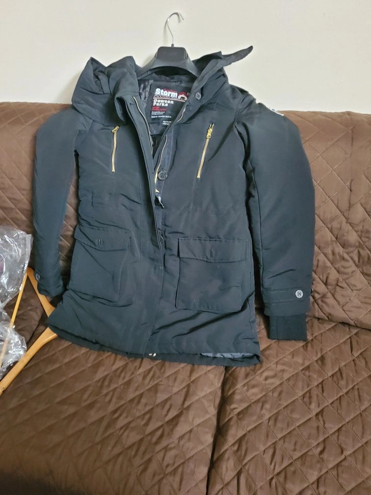 Women's black parka. Gold zippers. Hood. Excellent for Canadian weather. Size XS/P. New with tags