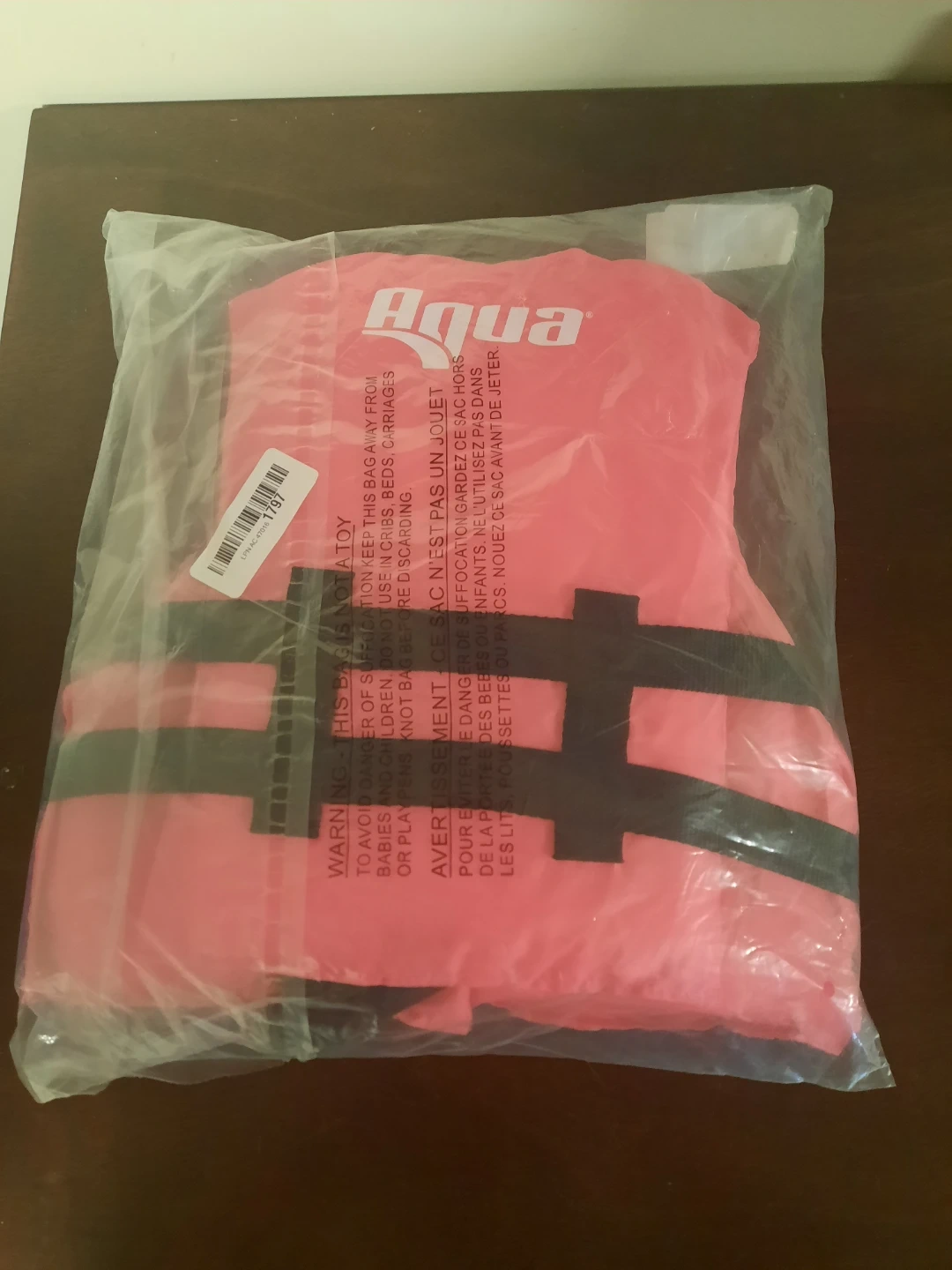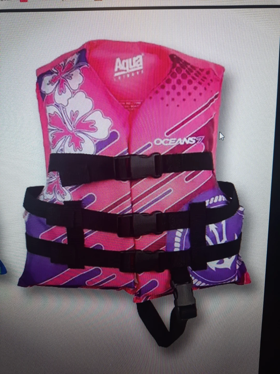 This is a new Aqua youth life jacket. It's bright pink with a floral and geometric design. Features adjustable straps and buckles for a secure fit. 35 to. 55. Lbs