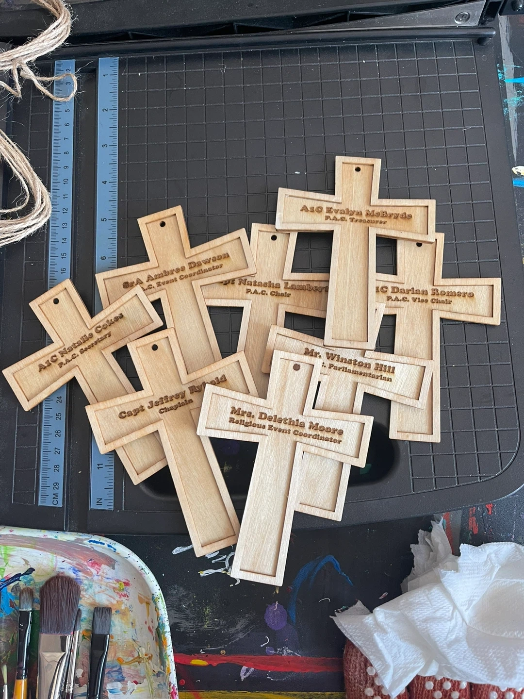 Selling wooden cross ornaments. They can be customized with names and titles, etc events or organization. Great for crafting or decoration