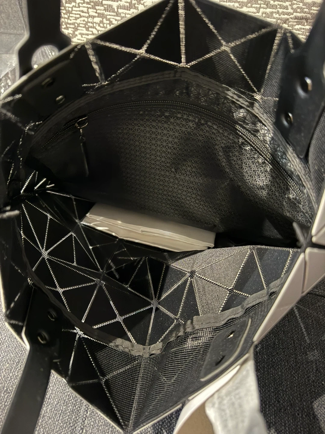 Selling a BAO BAO ISSEY MIYAKE Lucent Tote Bag in silver! This stylish bag features a unique geometric design that's sure to turn heads. It's in great condition and ready for a new owner. Perfect for adding a modern touch to any outfit!