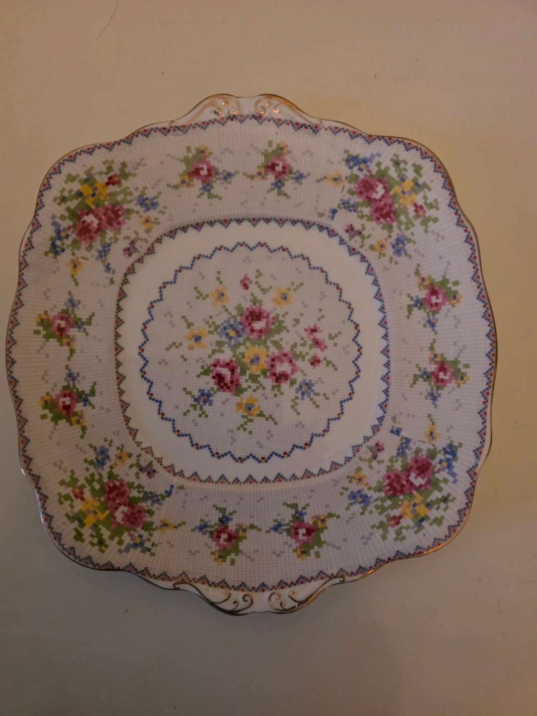 A pair of charming vintage salt and pepper shakers and playe (10inches). They feature a delicate floral pattern with gold trim. Made of ceramic.