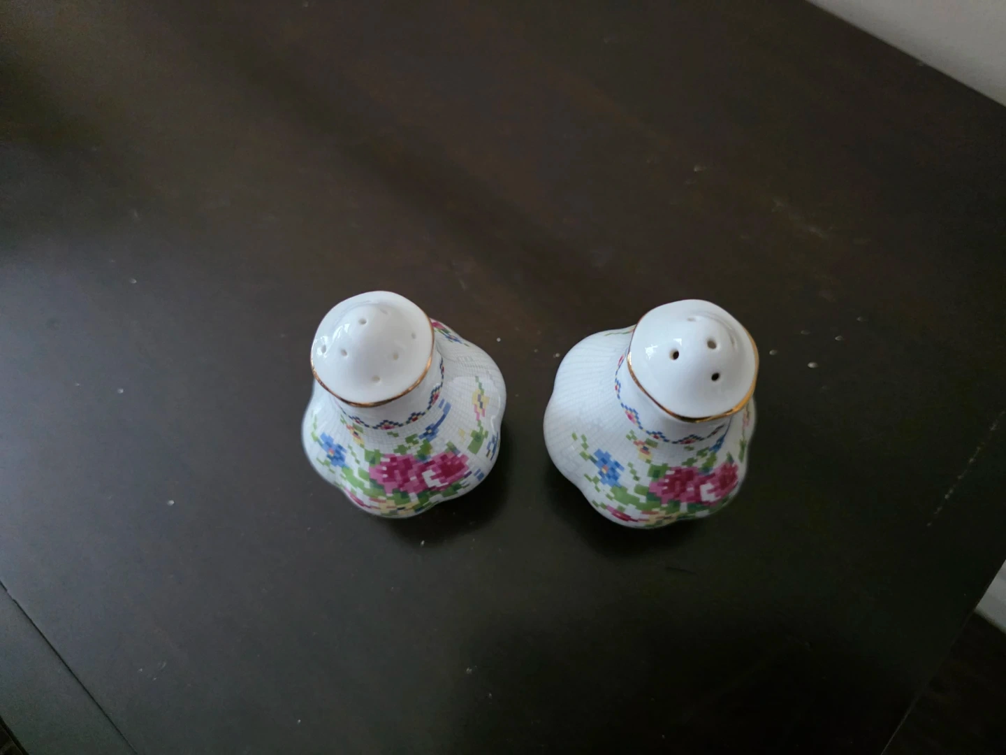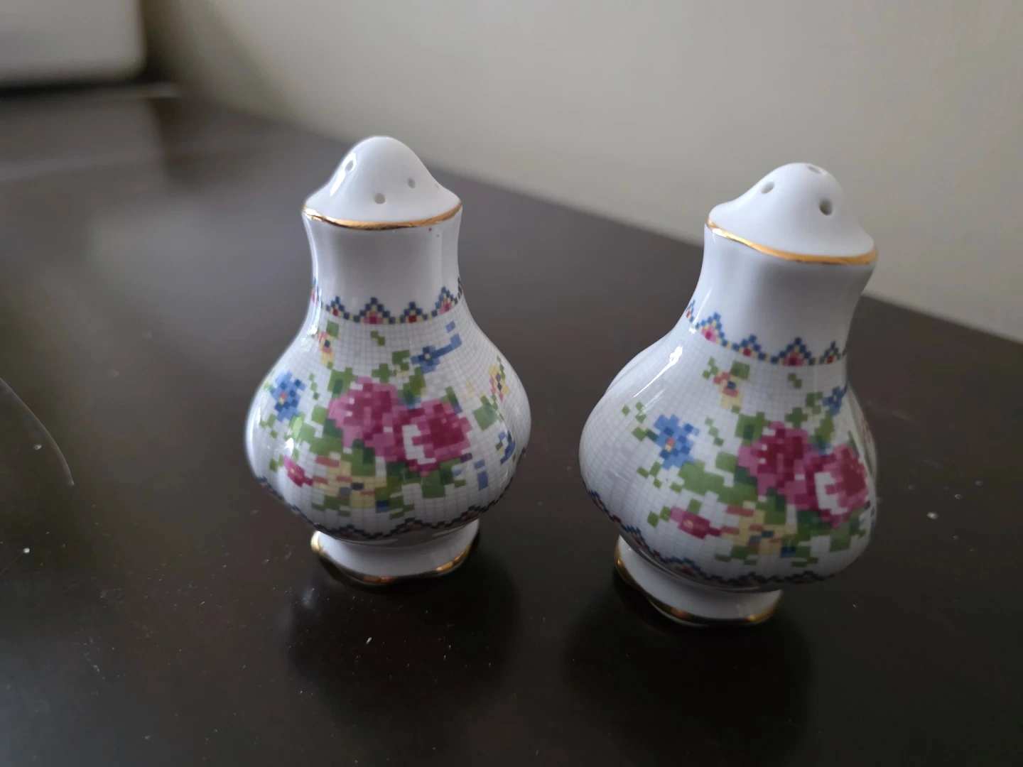 A pair of charming vintage salt and pepper shakers. They feature a delicate floral pattern with gold trim. Made of ceramic.