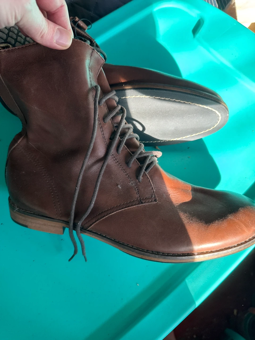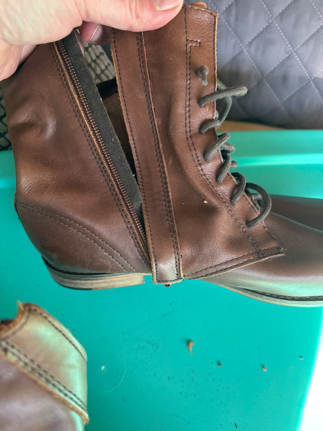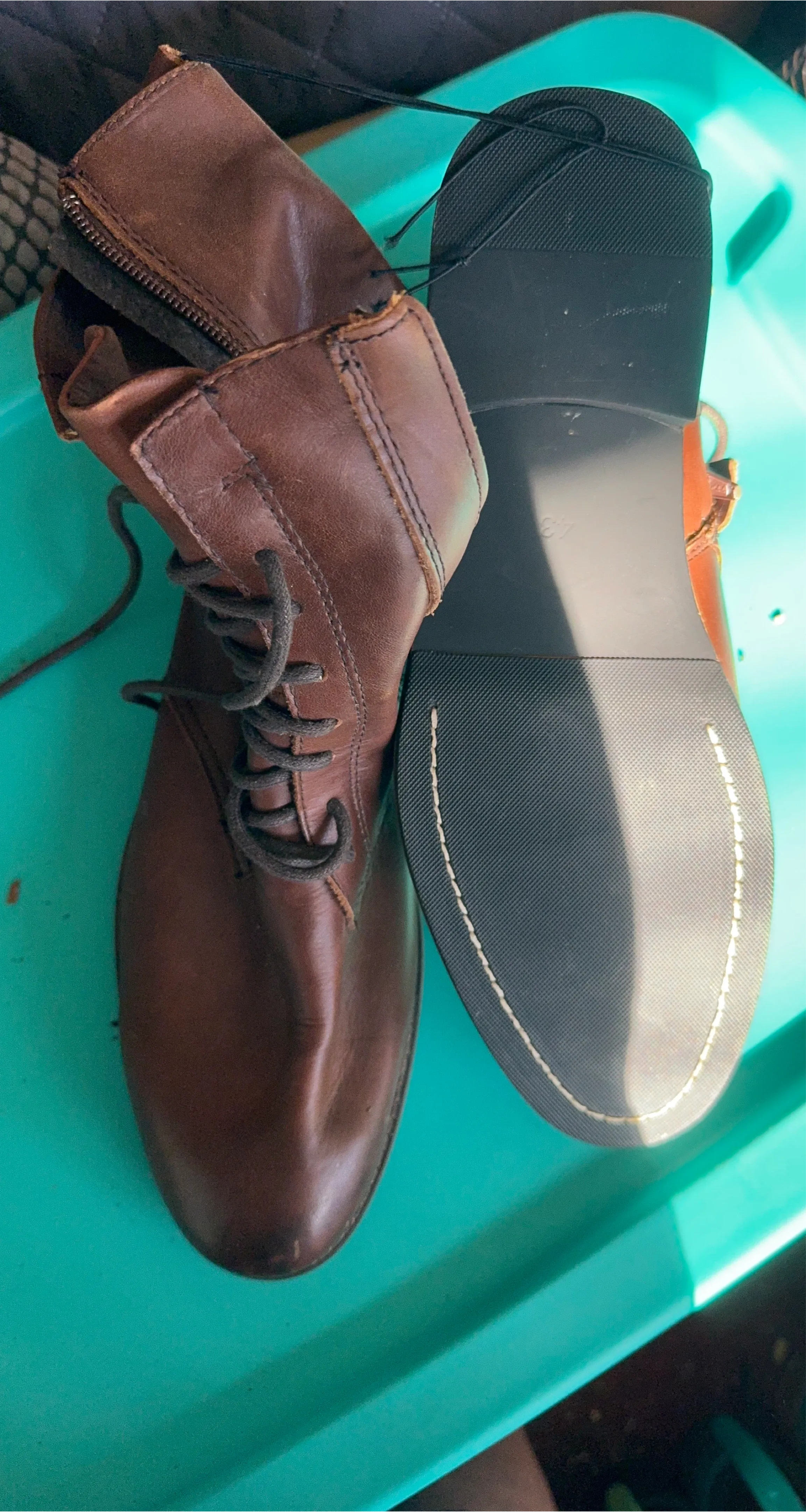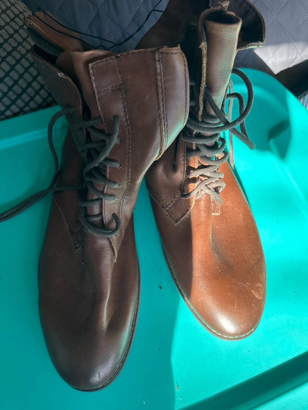 These are brown leather ankle boots with a side zipper and lace-up closure. They feature a durable sole and a comfortable design. Perfect for all weather!