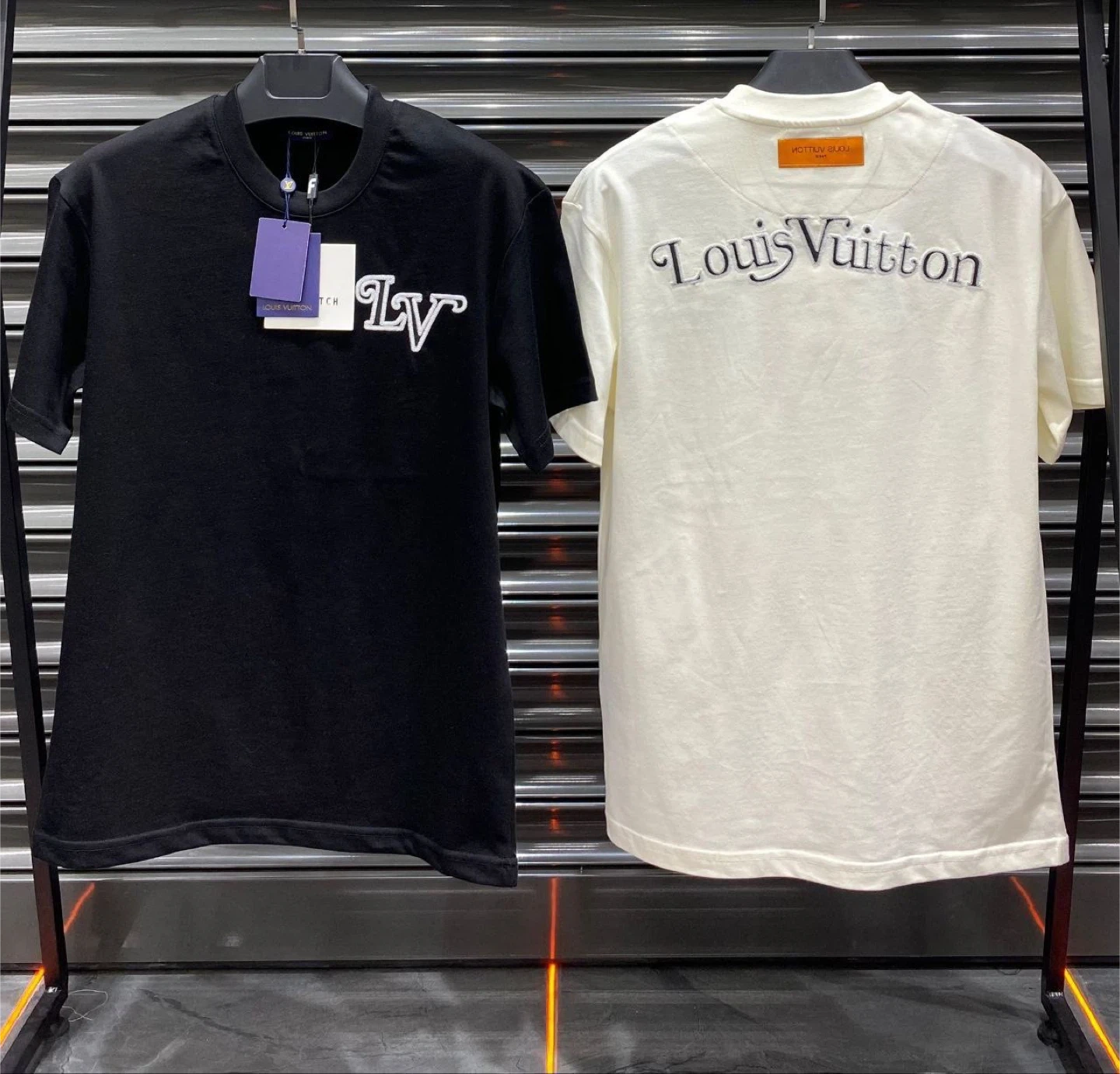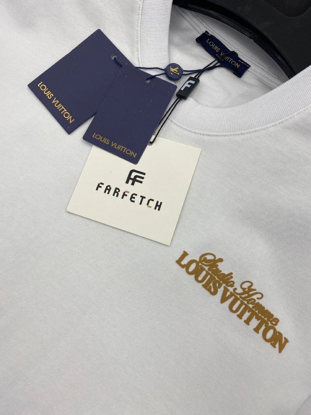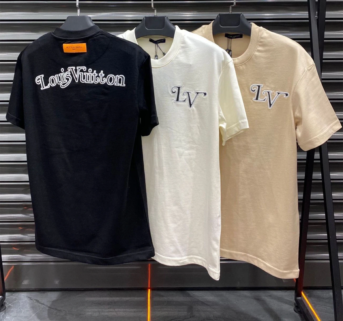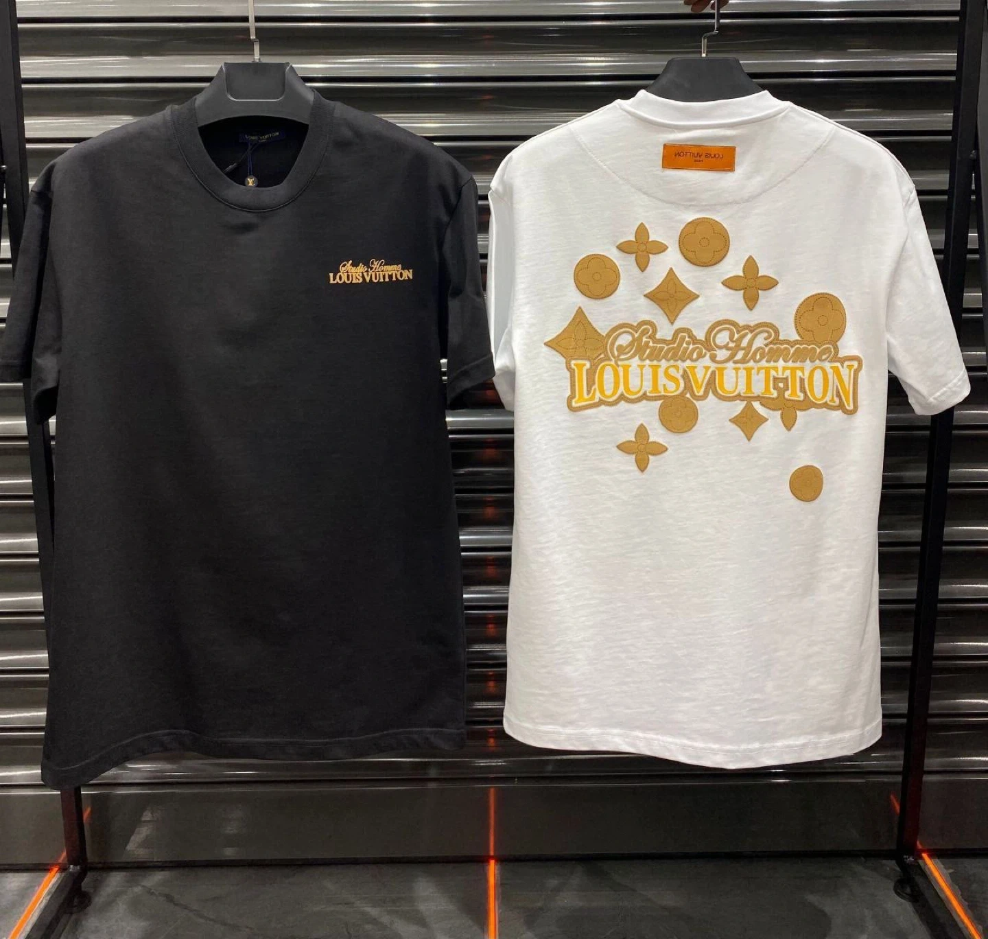 Louis Vuitton t-shirts in black, white, and beige. The black shirt features a large "Studio Homme Louis Vuitton" graphic with LV floral emblems. The white and beige shirts have "Studio Homme Louis Vuitton" embroidered on the chest. Cotton material. Available designs and sizes