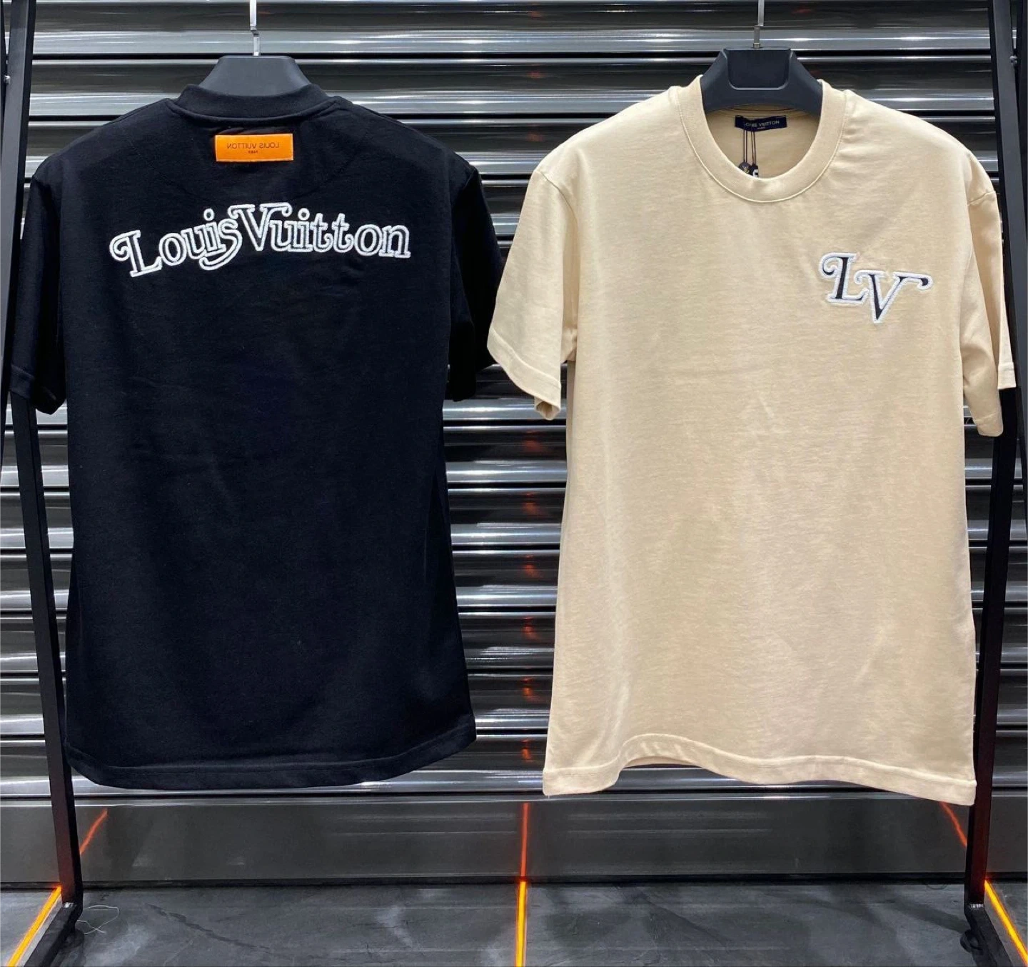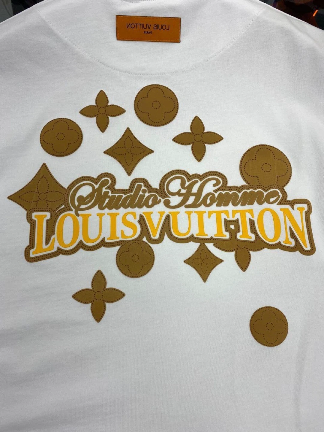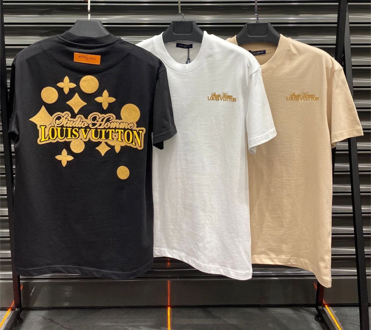 Louis Vuitton t-shirts in black, white, and beige. The black shirt features a large "Studio Homme Louis Vuitton" graphic with LV floral emblems. The white and beige shirts have "Studio Homme Louis Vuitton" embroidered on the chest. Cotton material. Available designs and sizes