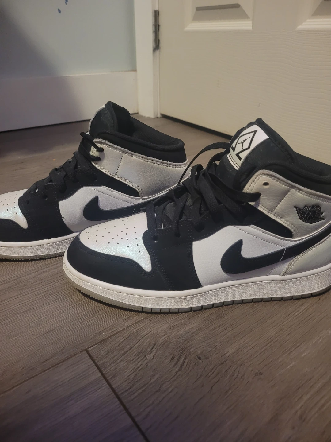 These are a pair of Air Jordan 1 Mid SE sneakers in a black and white colourway. They feature a classic silhouette with durable construction. Suitable for everyday wear or athletic activities.