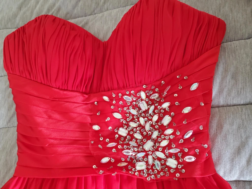 Gorgeous red floor-length dress. Sweetheart neckline. Rhinestone embellishment at the bodice. Back zipper closure. Excellent condition. size 4 Dimensions in picture worn by 5 foot lady