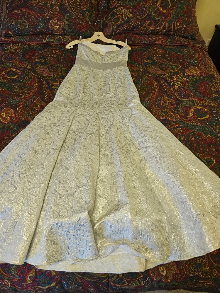 10Selling a beautiful strapless wedding dress in a lovely silver colour. It has a fitted bodice and a flared skirt. It's in great condition and ready for its next special day!