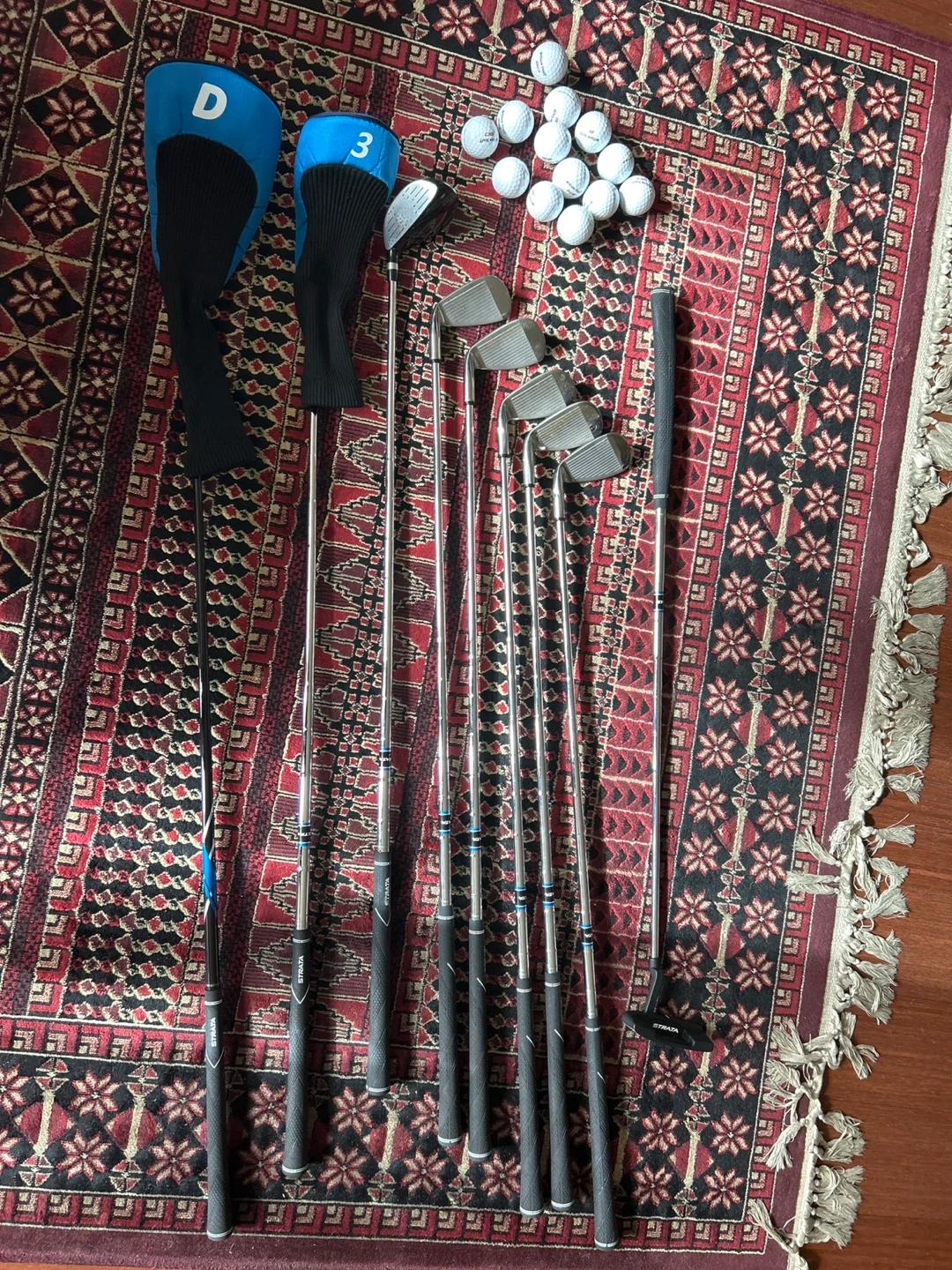 Selling a golf set! Includes a Strata golf bag, 13 Wilson Staff golf balls, and a set of golf clubs. Item like new - only used a few times at the driving range. Perfect for someone looking to start golfing or upgrade 9 Piece (Intro) Golf club flex Regular Hand orientation Right Golf club loft 10.5 Degrees Material Alloy Steel Complete Set: Includes: Driver 3 Wood 5 Hybrid 6-9 Irons Putter Stand Bag 2 Headcovers for comprehensive golfing Driver: Lightweight 460cc Forged Design with Large Sweet Spot and Titanium Head for Maximum Distance Oversized Fairway Wood for Long, High-Flying Shots with Ease Hybrid for Difficult Long Irons, Providing Versatility and Control Stainless Steel Irons for a Combination of Forgiveness and Control, Mallet Putter with Alignment for Accuracy Perfect for anyone looking to get into golf or upgrade their current equipment.