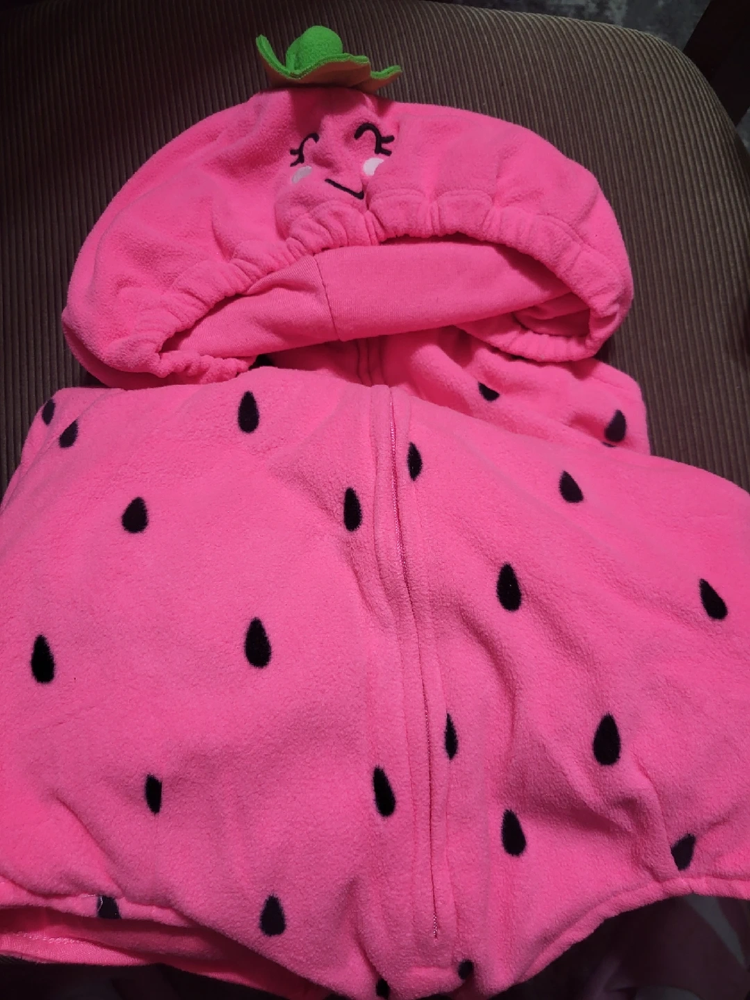 91Super cute strawberry costume for a baby or toddler! The costume is pink with black seed details and a cute strawberry hood. Perfect for dress-up or Halloween!