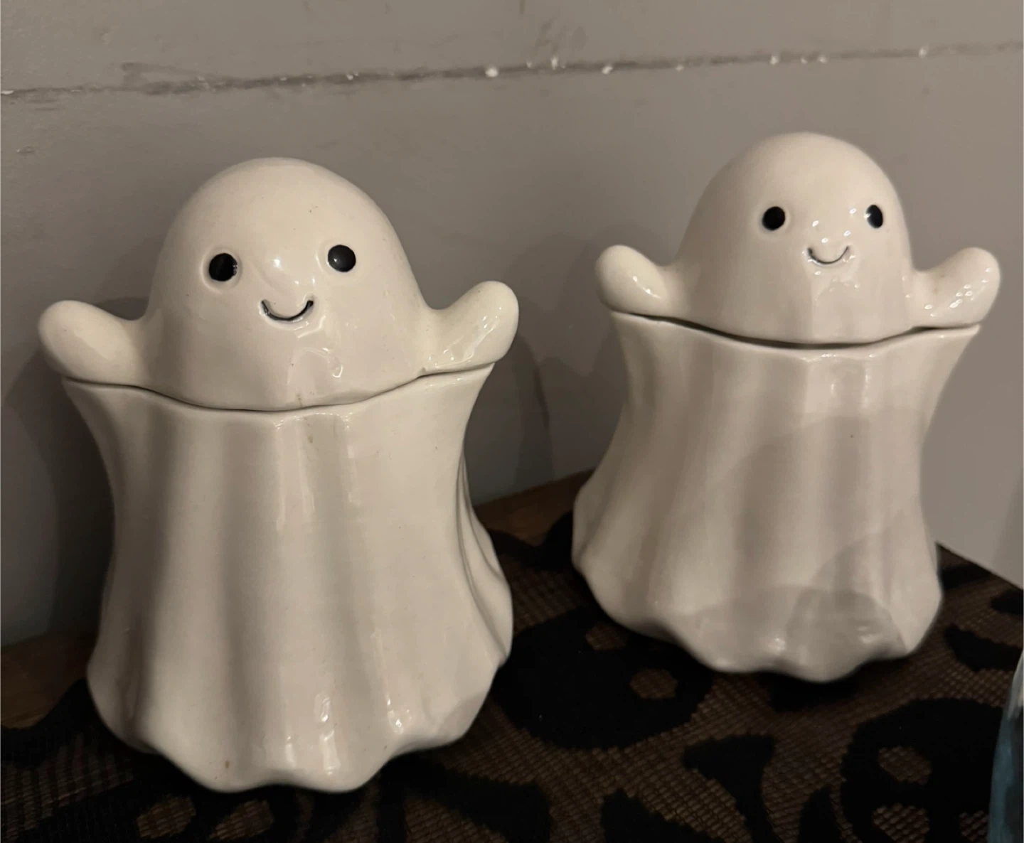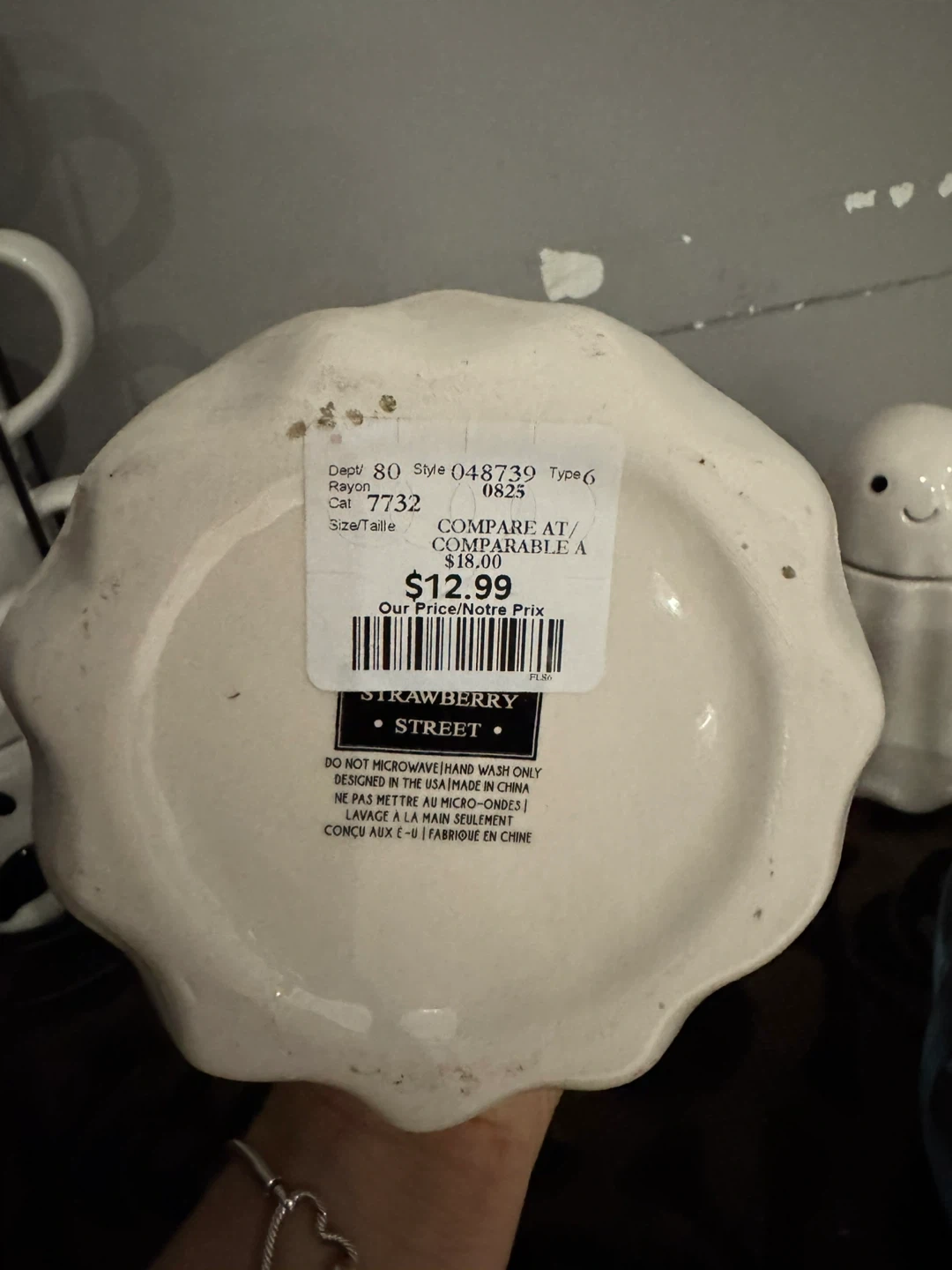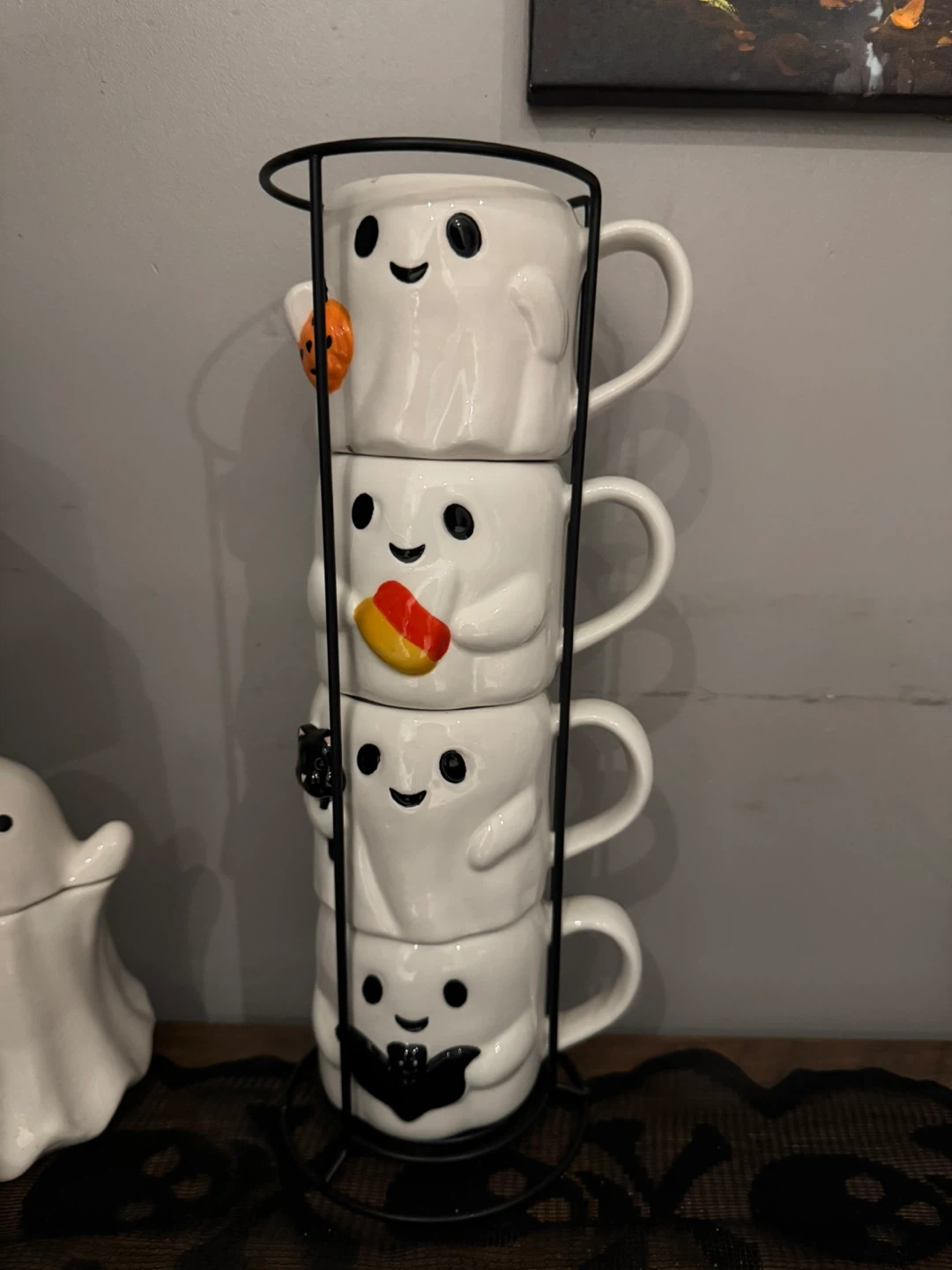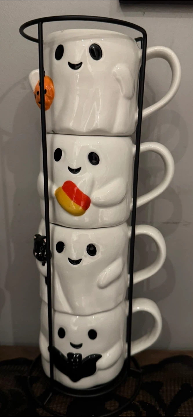 67Super cute ghost themed mugs and canister from Strawberry Street! Perfect for Halloween or just for fun! The mugs come with a stand and the canister has a lid. The original price was $12.99 each little ghost 19.99 for the mugs each picture were 7.99 each plus tax selling all together for
