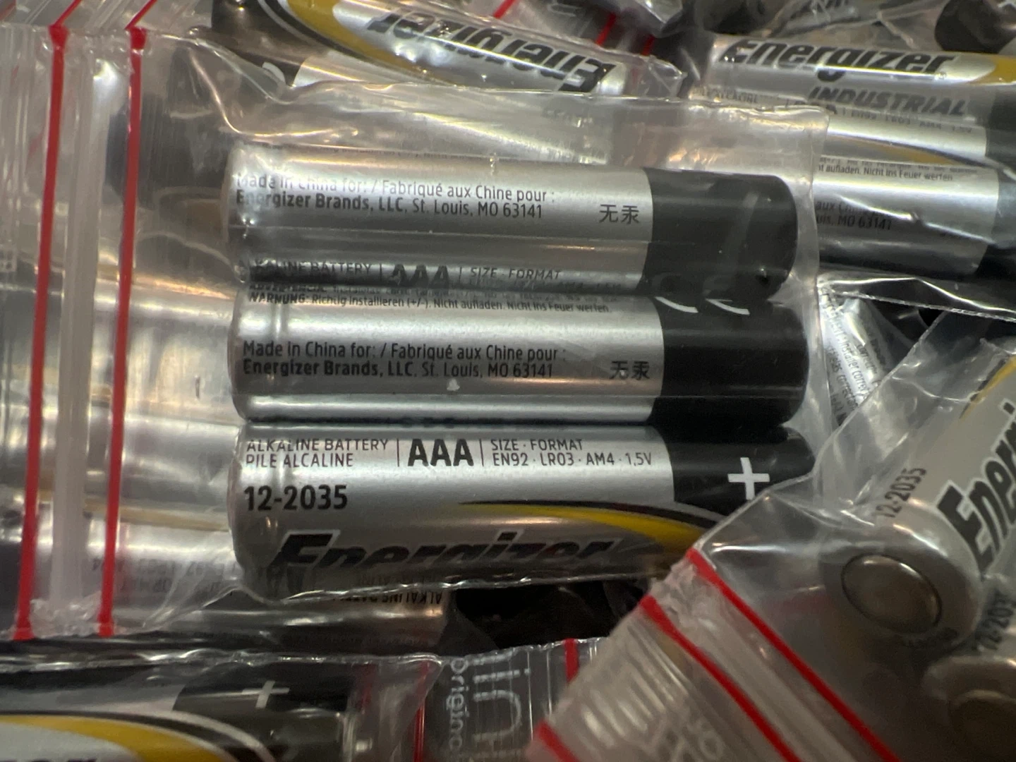 Bulk lot of Energizer Industrial AAA alkaline batteries. These are new batteries, individually packaged in small bags. Each battery is labeled with "12-2035", indicating an expiry date of December 2035. The batteries are also marked as "AAA" size format.
