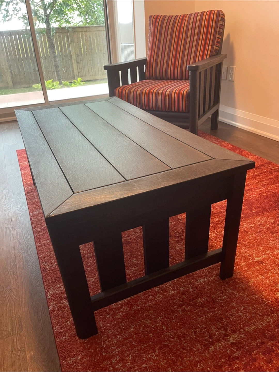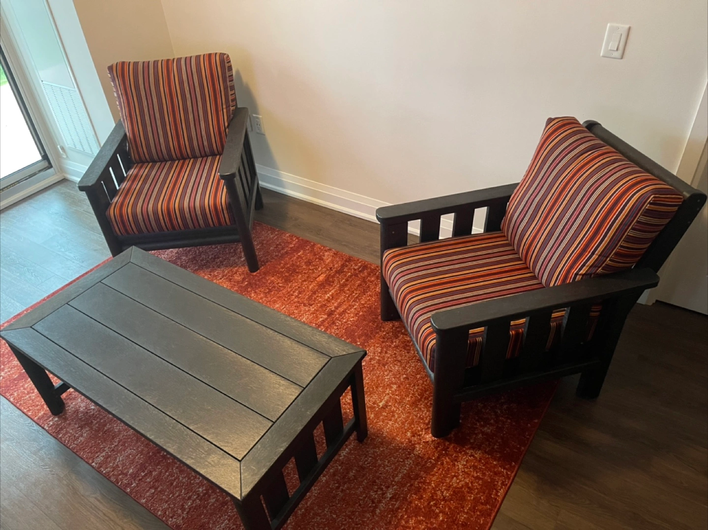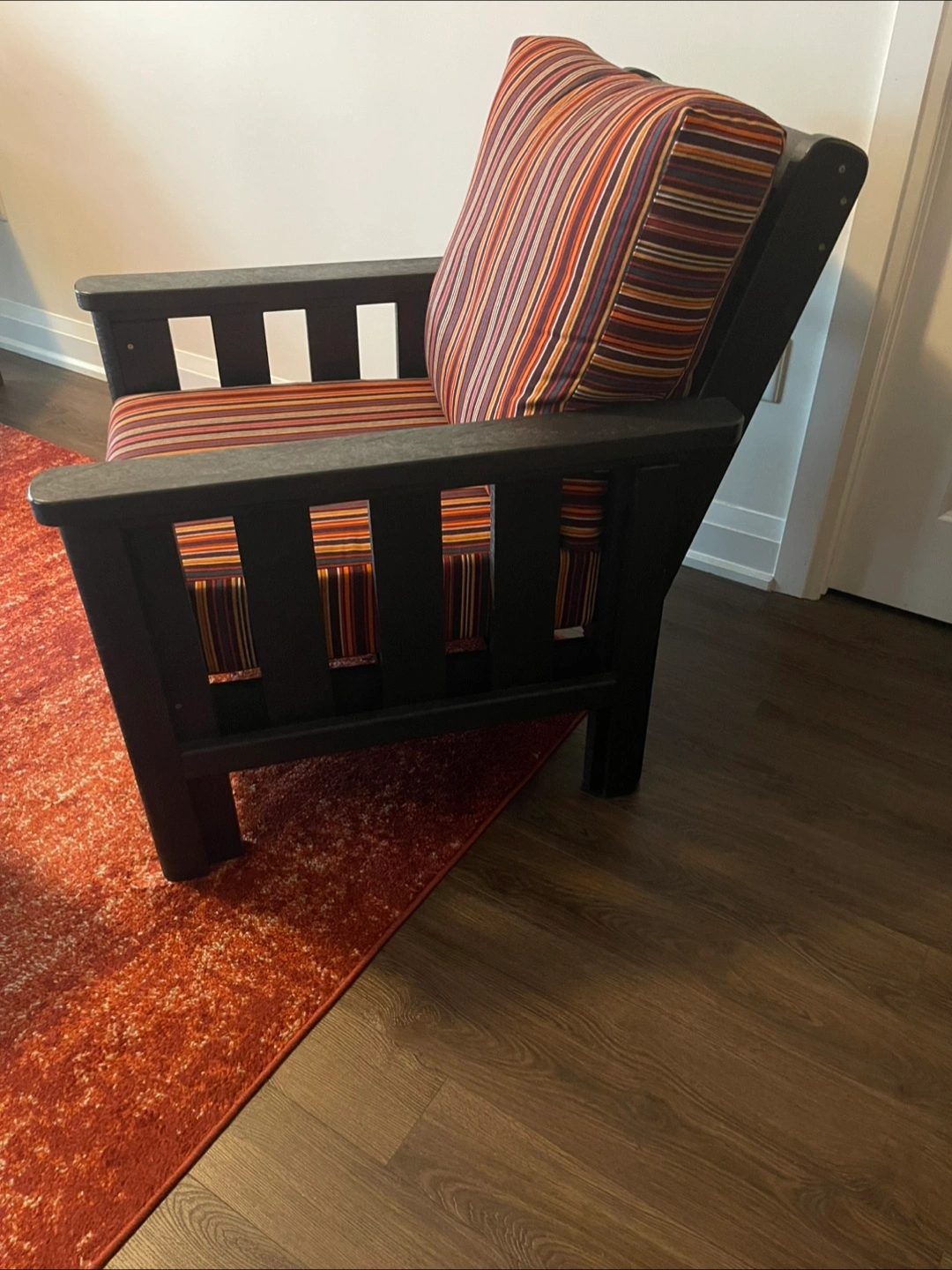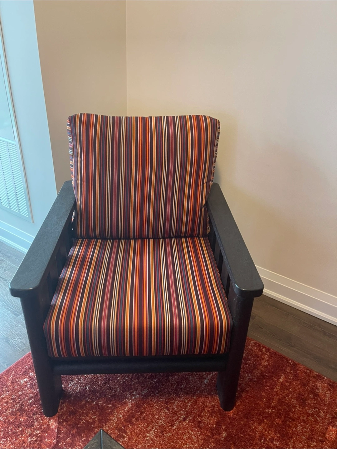 Looking to sell this Stratford collection comfy armchair and coffee table set. The armchair has a unique striped pattern. Great for adding a pop of colour to your living room or patio