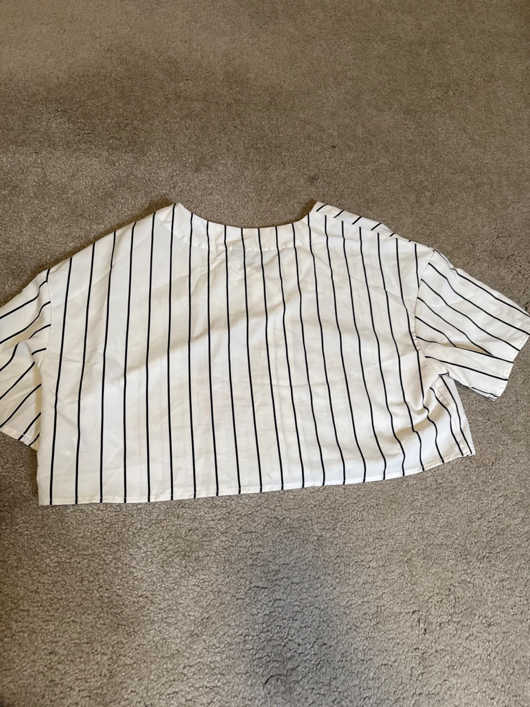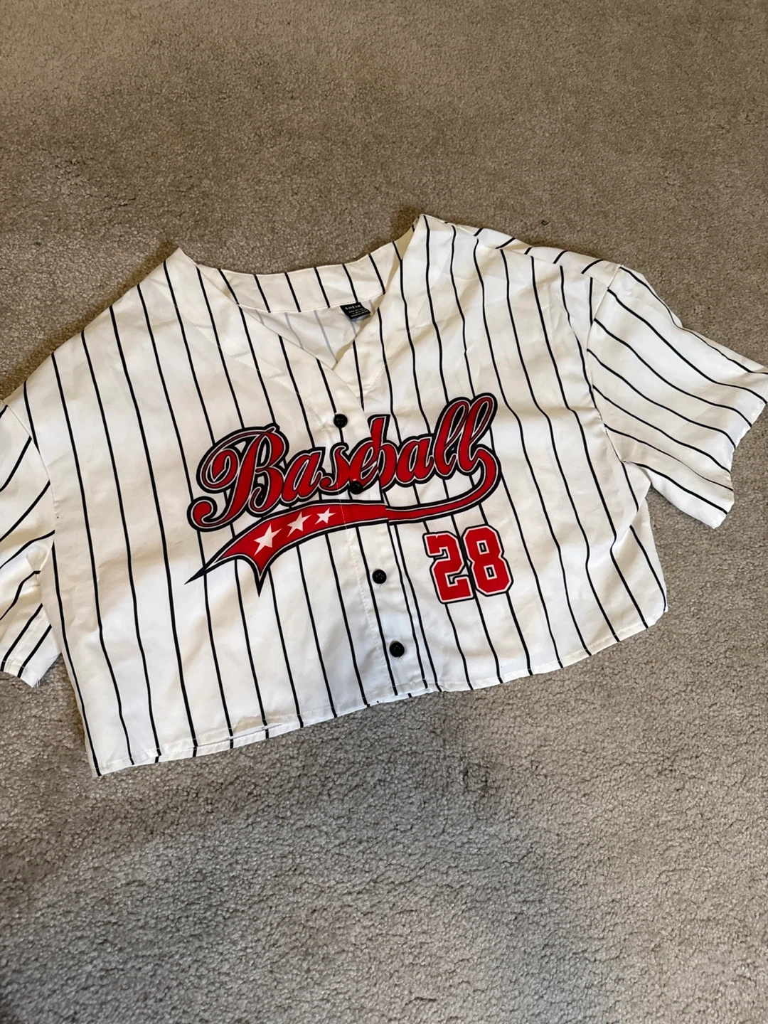 5Selling a cute striped baseball crop top! It features black stripes on a white background, with a red "Baseball" graphic and the number 28. Perfect for a sporty and stylish look!