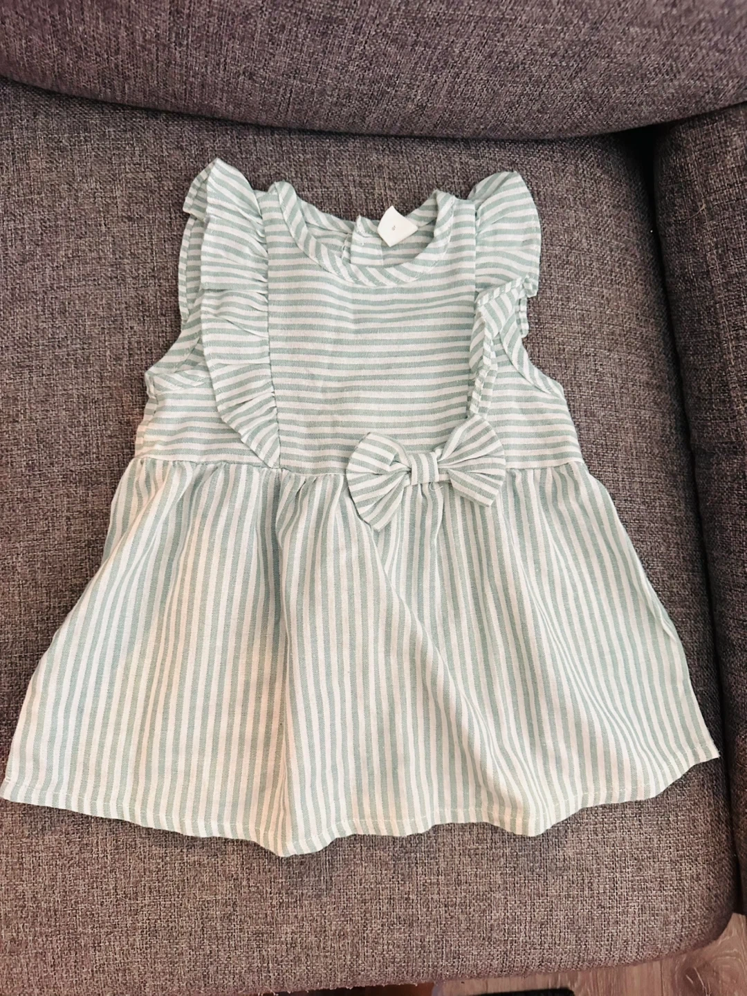 60A cute baby dress with a striped pattern! It features ruffle details on the shoulders and a sweet little bow on the front. The dress is size 74.