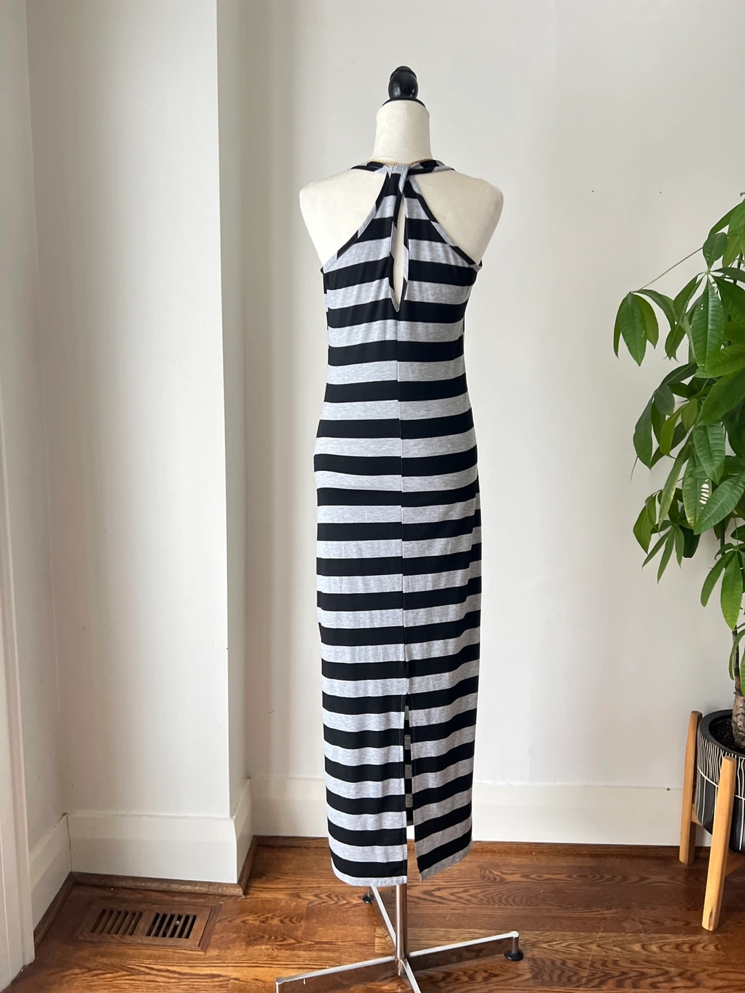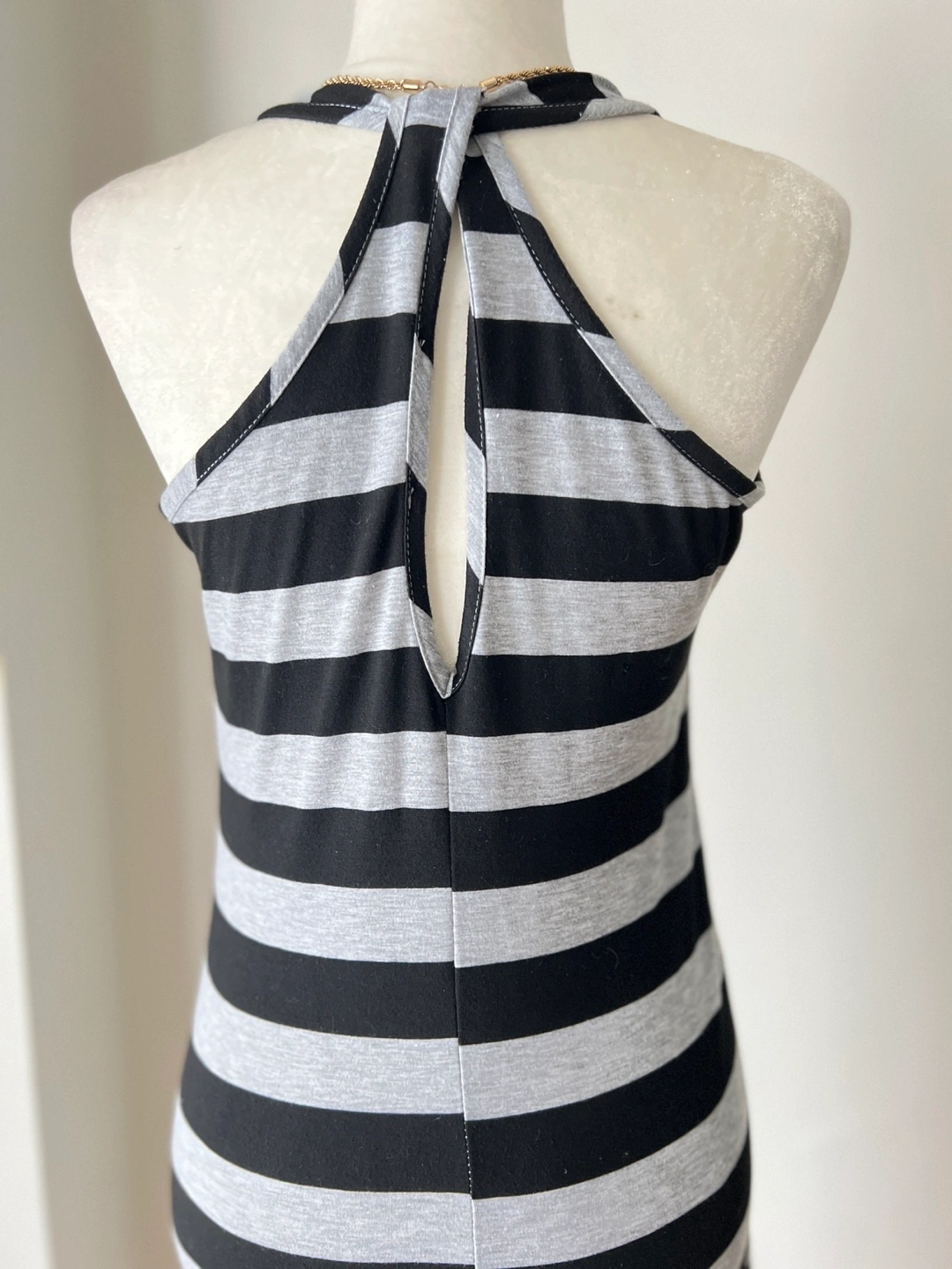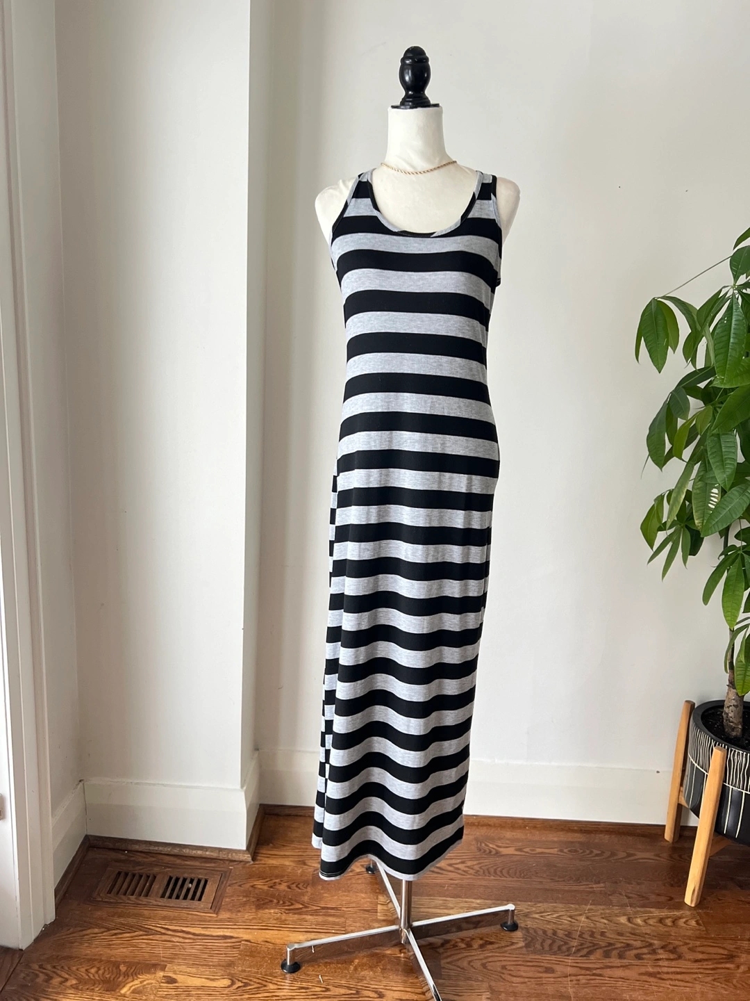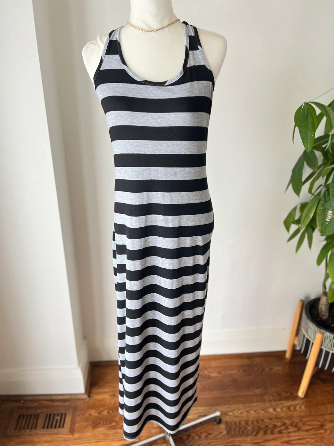 768Grey and black striped maxi dress. Sleeveless. Key hole opening in back. Racer back. Relaxed fit. Great for summer. Never Worn.