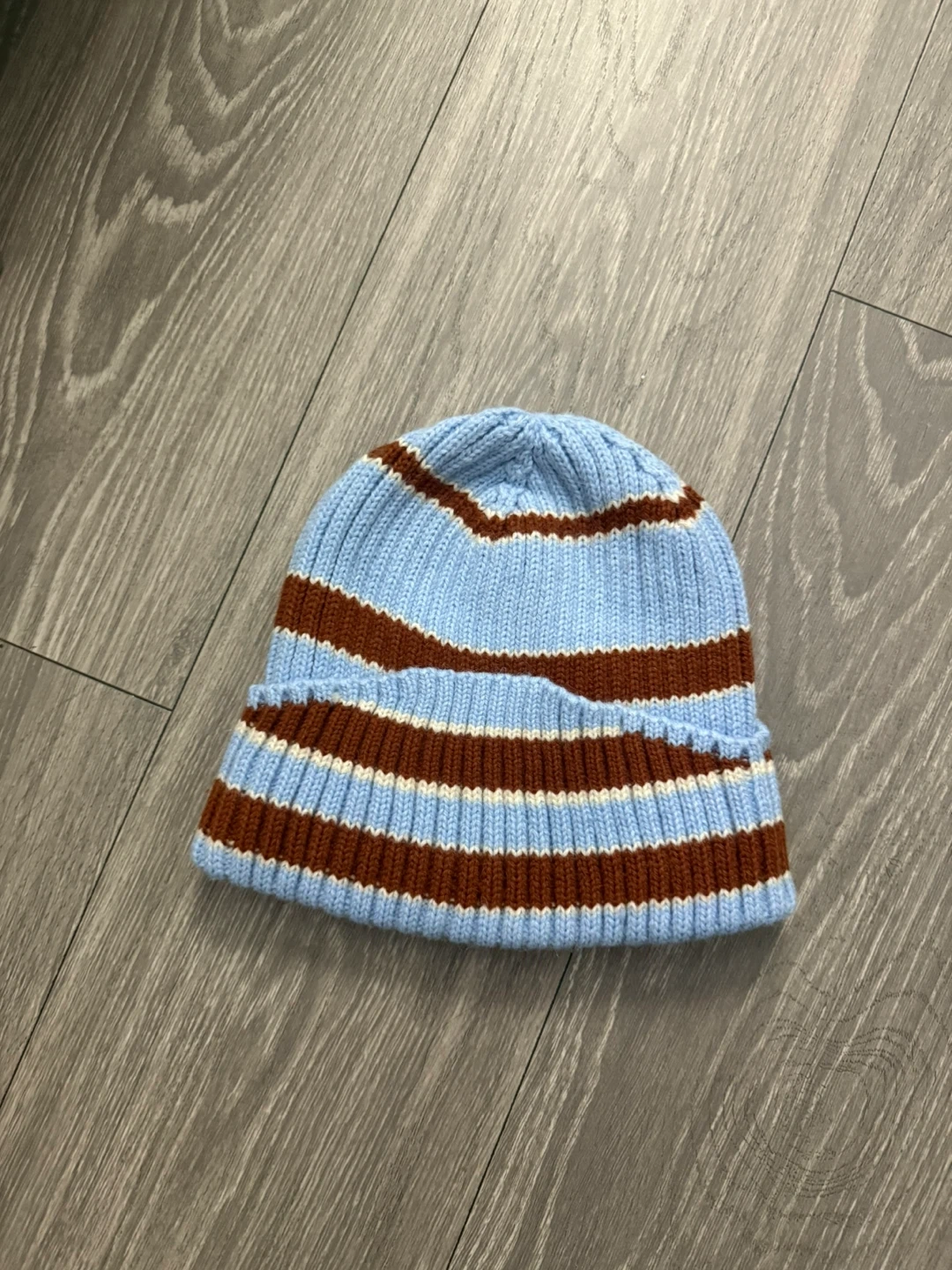 Here's a cozy striped knit beanie! It features a light blue base with brown and white stripes. Perfect for keeping warm on chilly days
