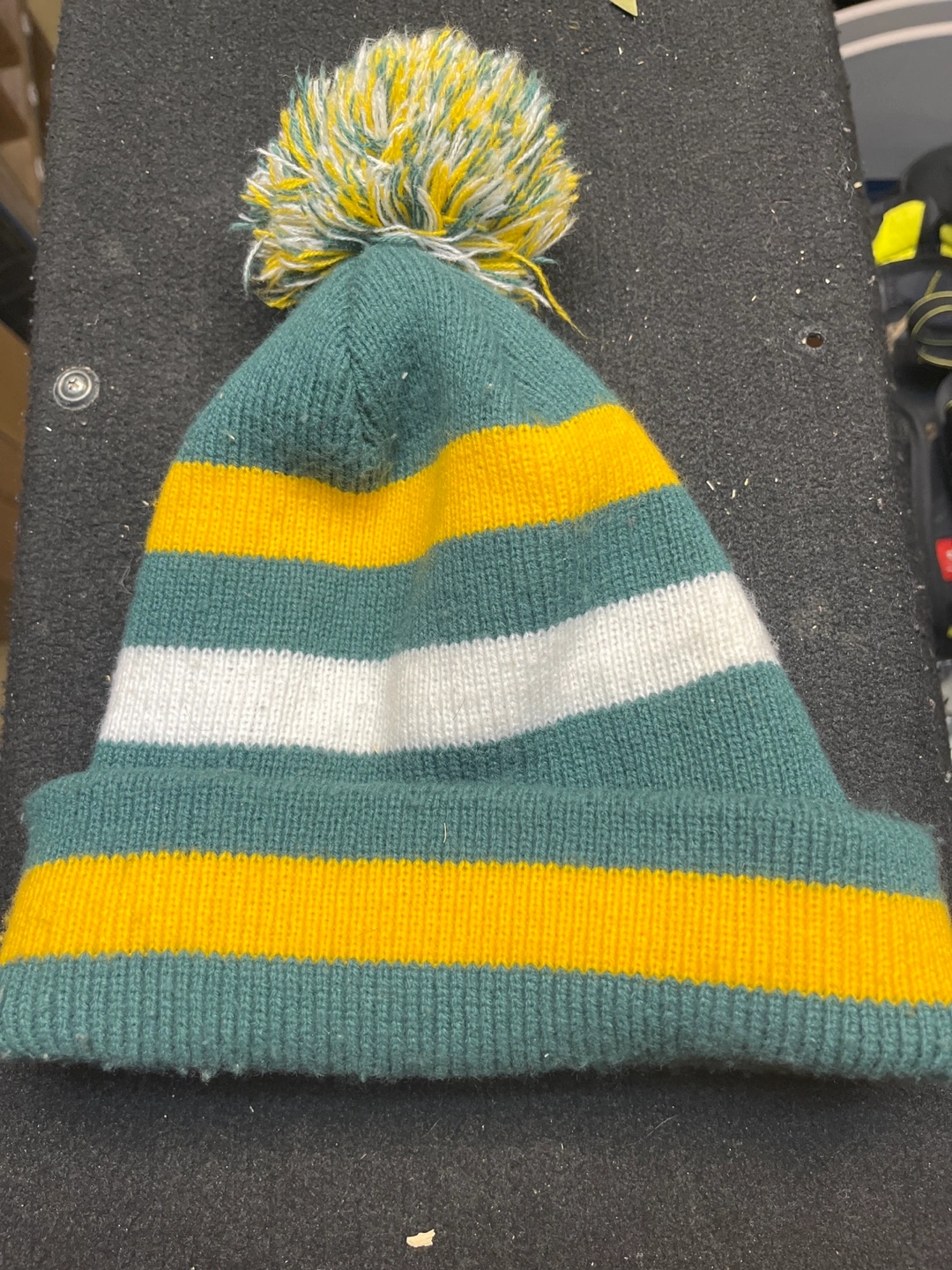88Here's a cozy toque, perfect for chilly days! It features a fun striped pattern in green, yellow, and white, topped with a cute pompom. It's in great condition and ready to keep you warm this winter