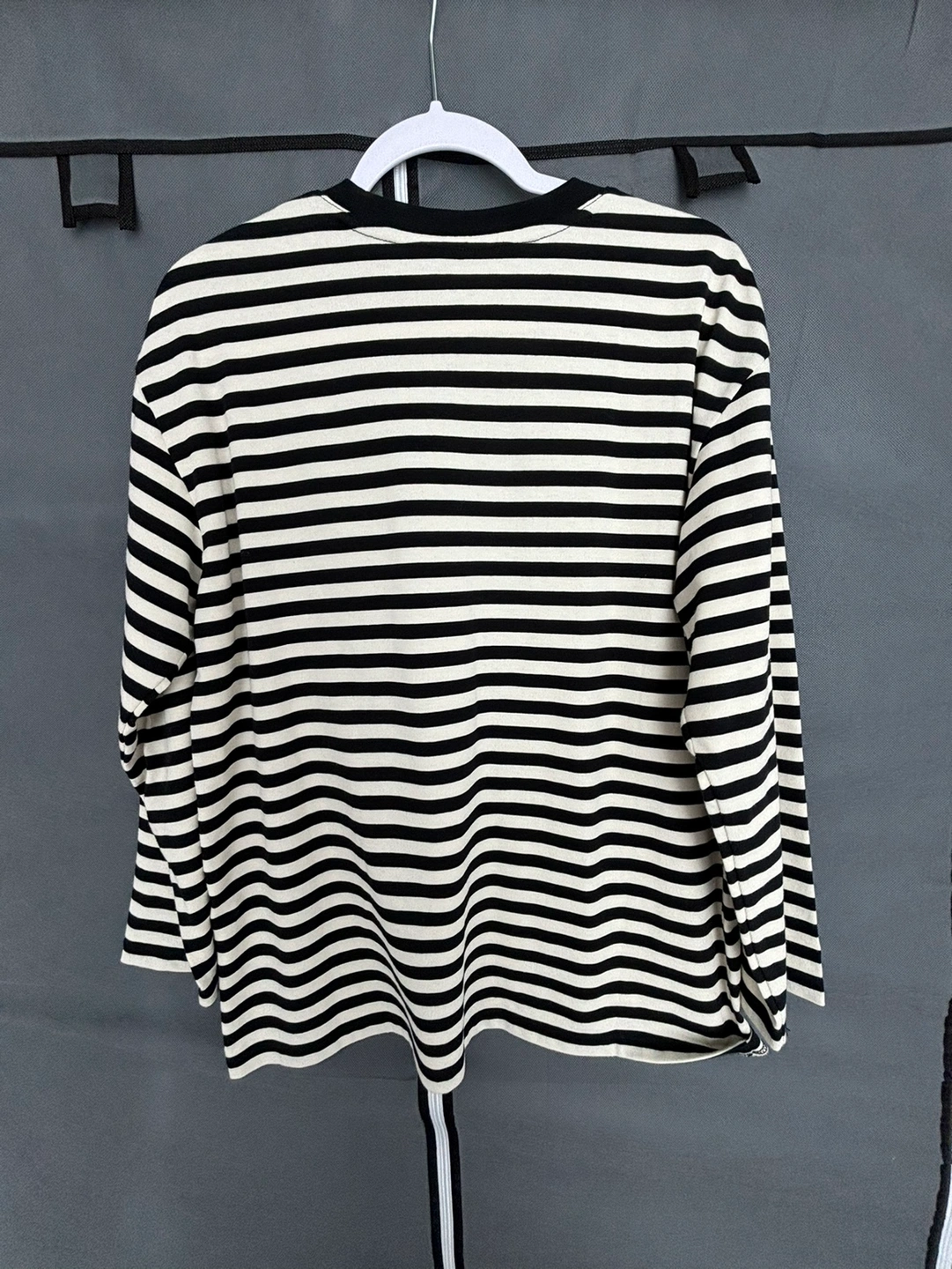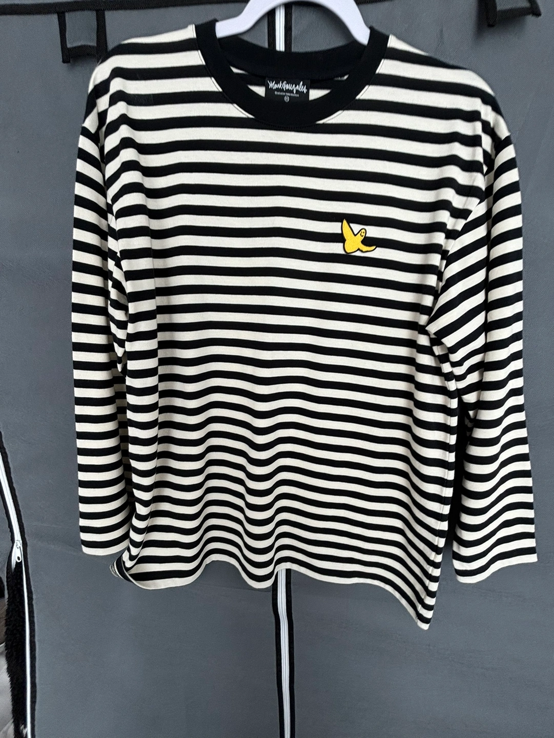- Oversized! - Can fit XS-M Black and white striped long sleeve t-shirt with yellow bird logo. Size S