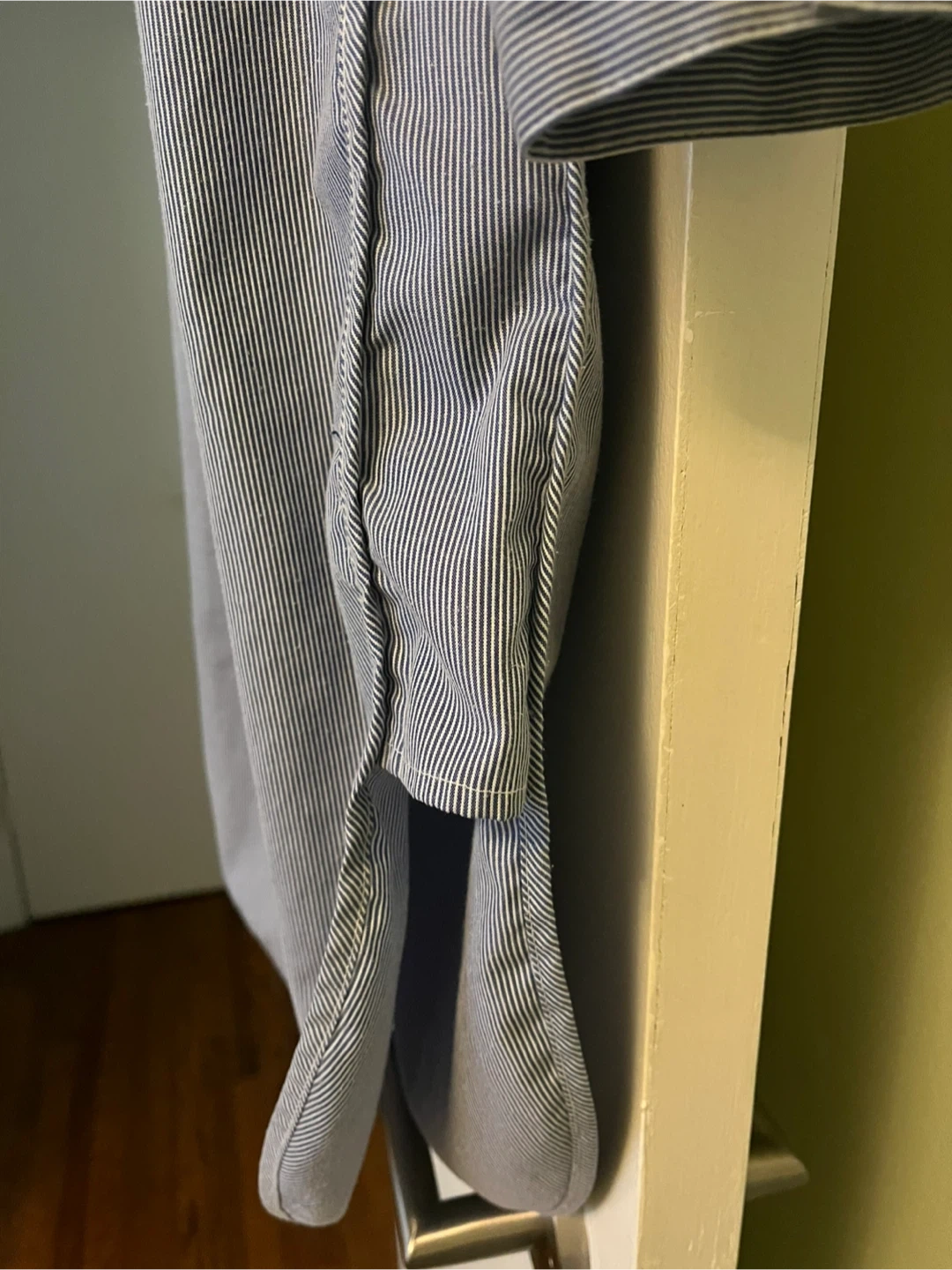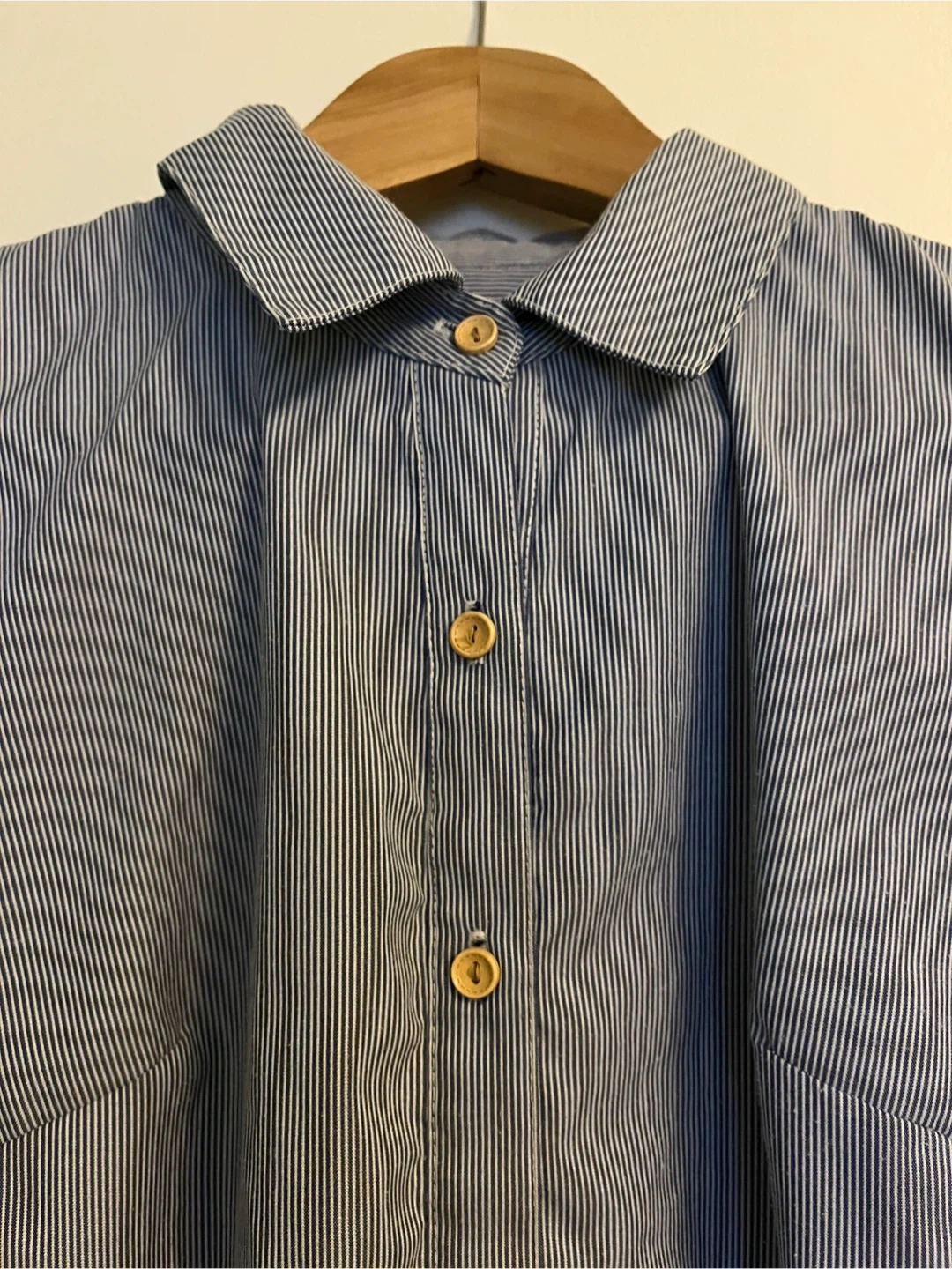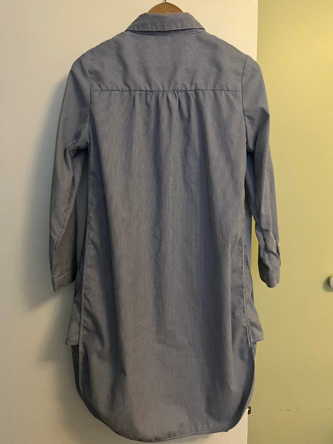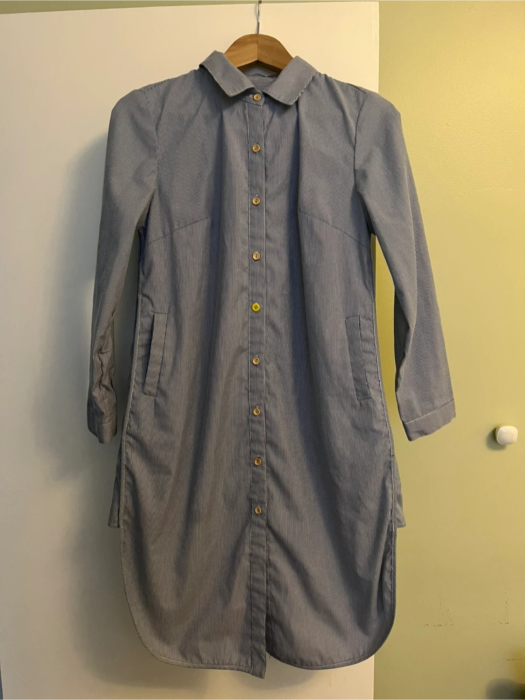 Here's a cute shirt dress with a blue and white striped pattern! It has a collar and button-down front, perfect for a casual day out. The dress has a unique rounded hemline and a comfortable fit. Pickup only. Parklawn & Queensway