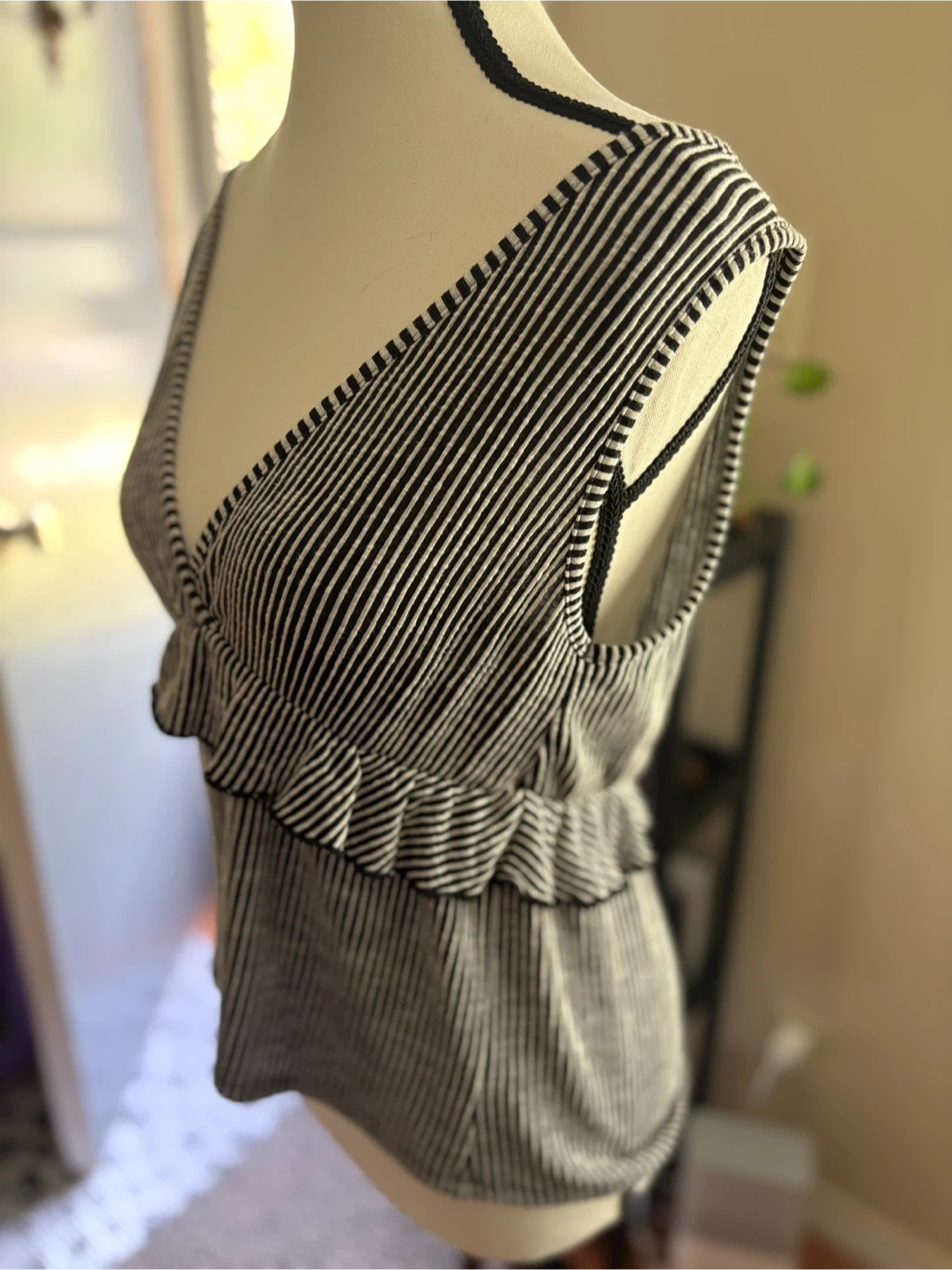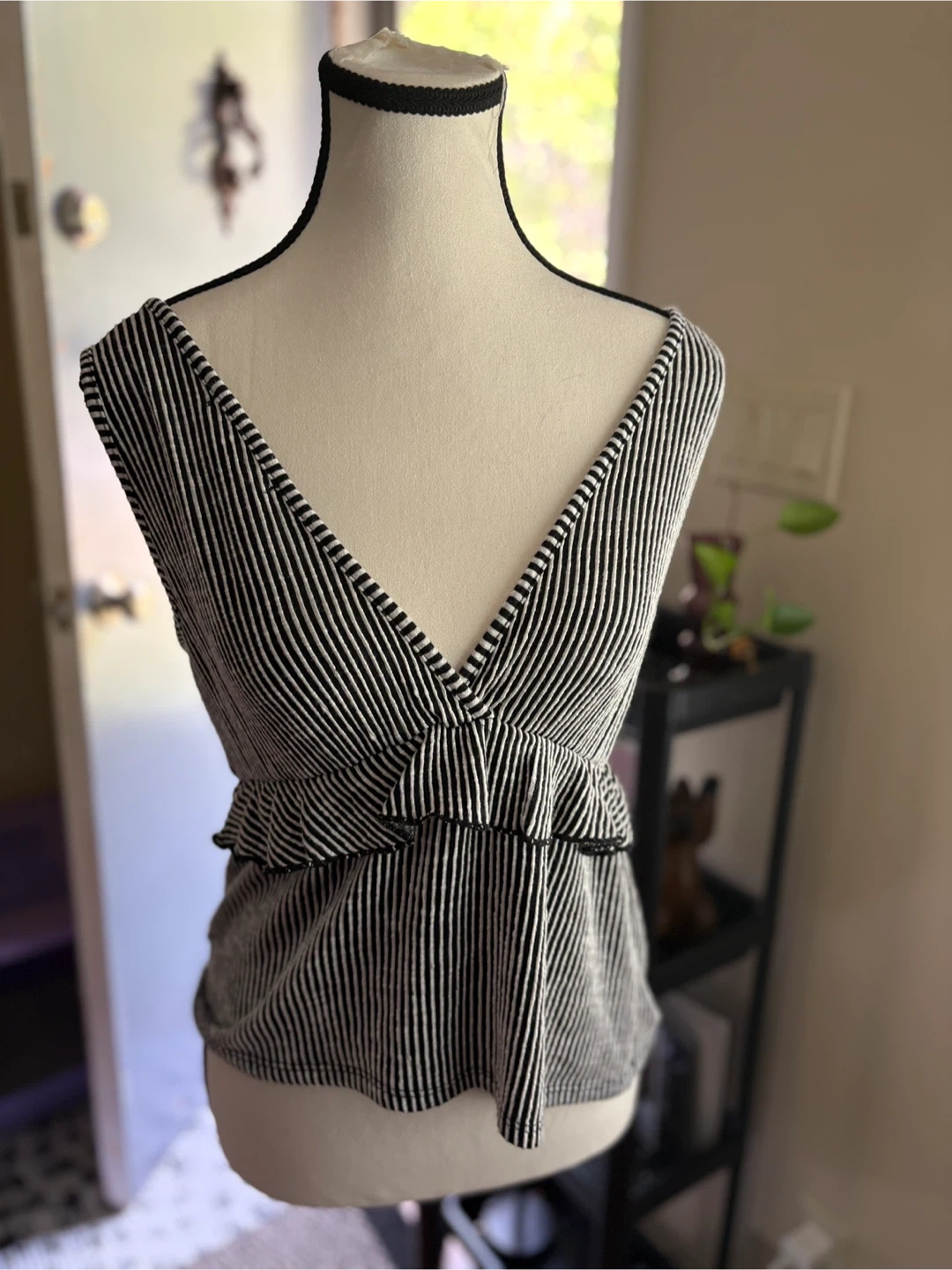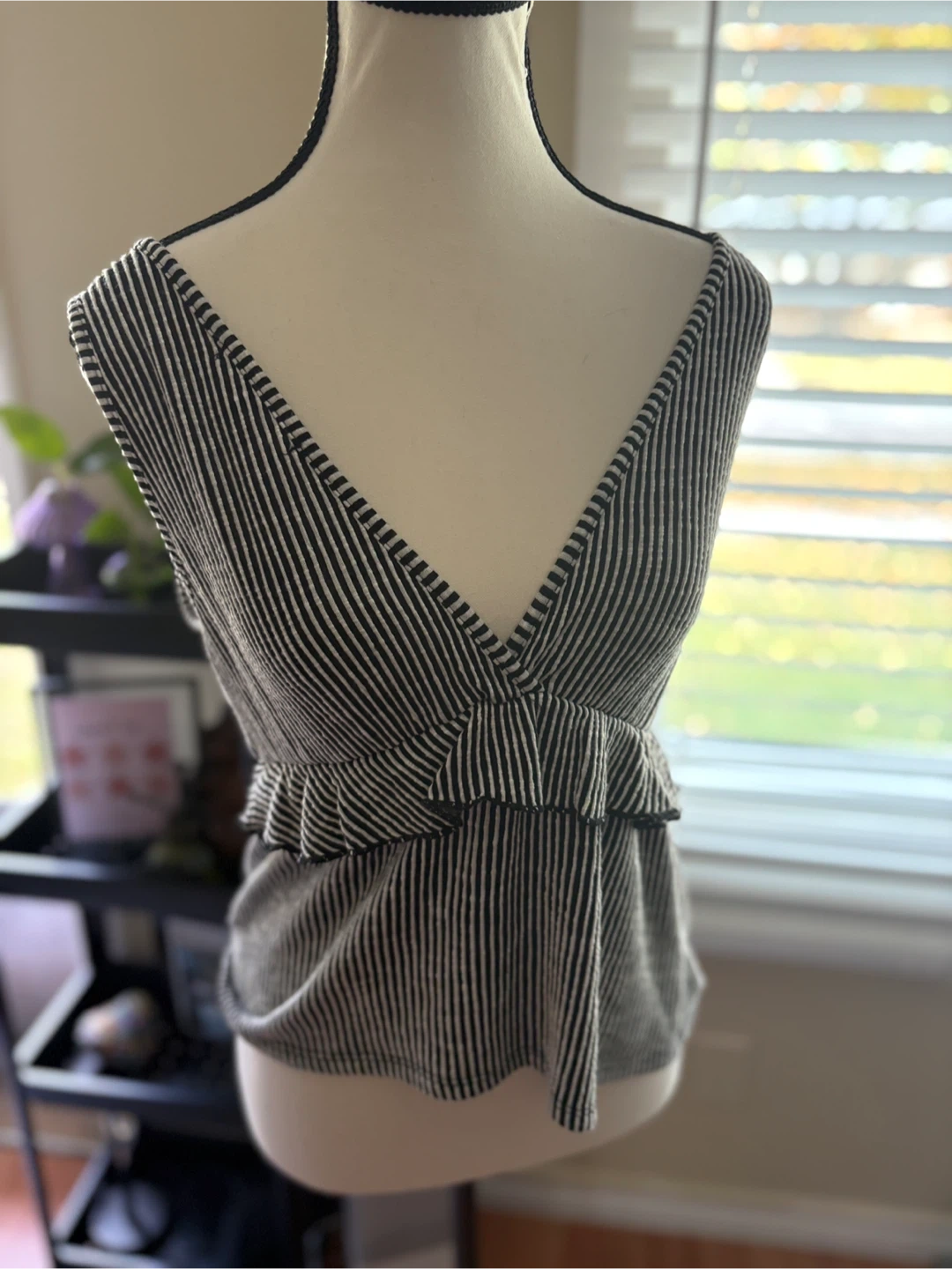 Selling this chic striped V-neck top. Featuring a flattering ruffle detail, this black and white top is perfect for any occasion. Material is soft and comfortable. Size S