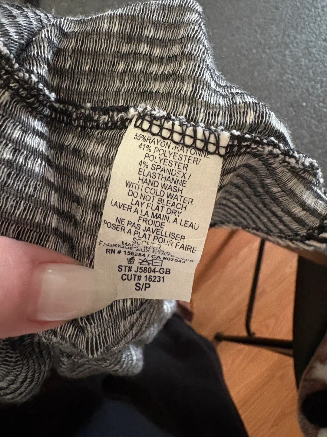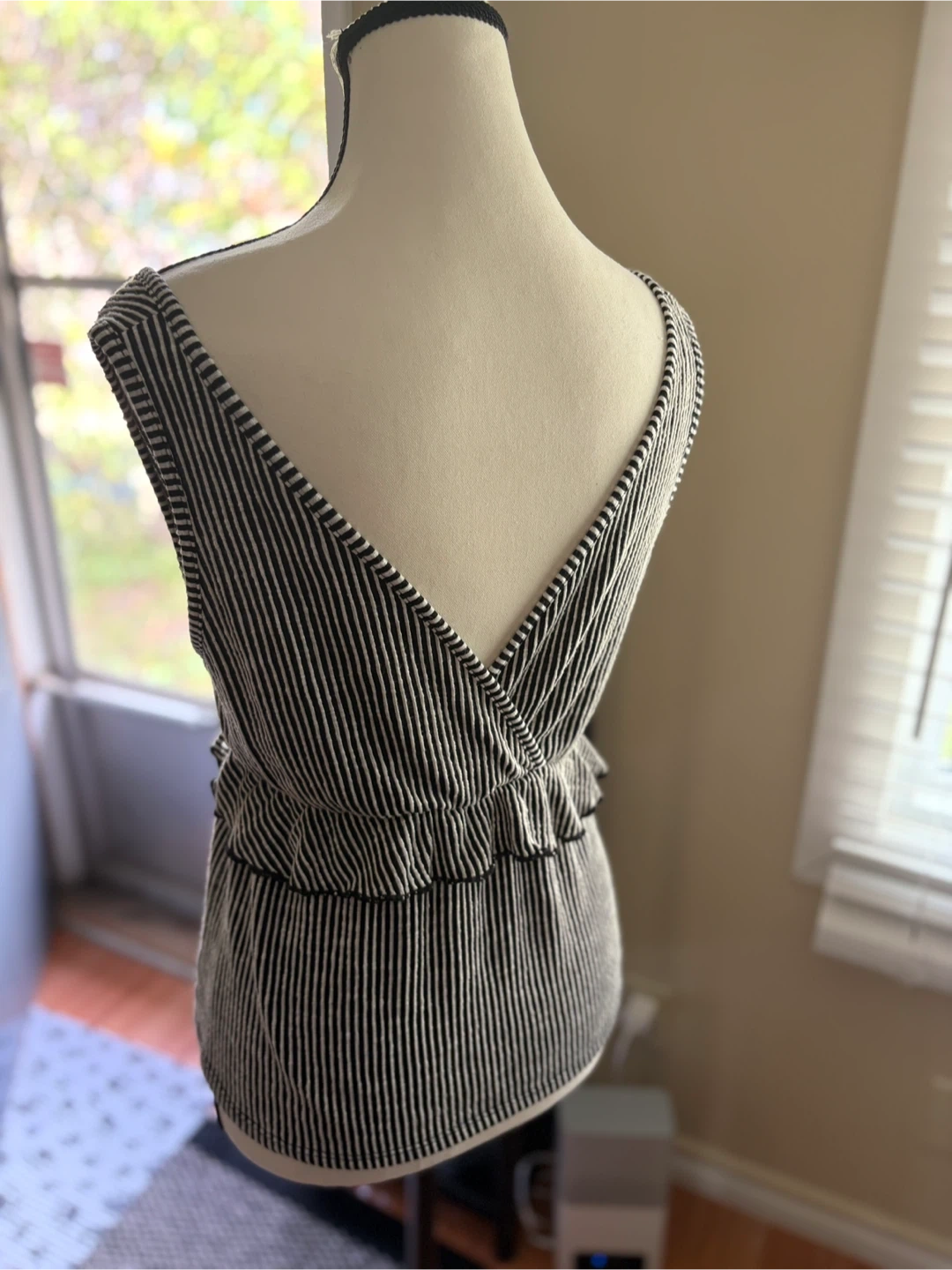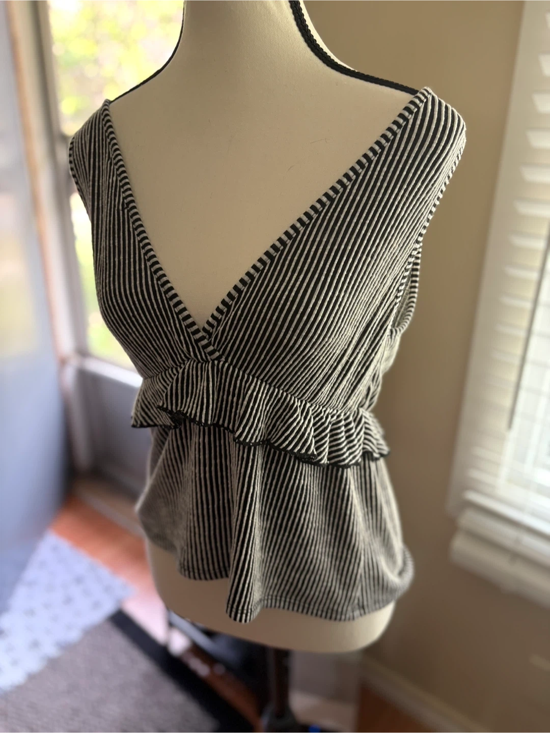 Selling this chic striped V-neck top. Featuring a flattering ruffle detail, this black and white top is perfect for any occasion. Material is soft and comfortable. Size S