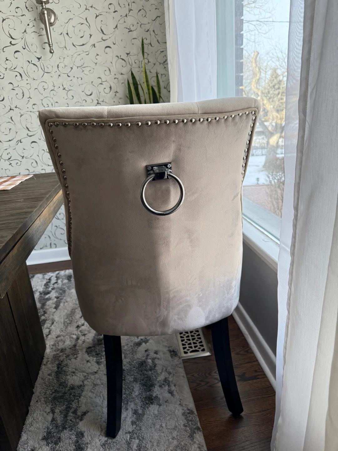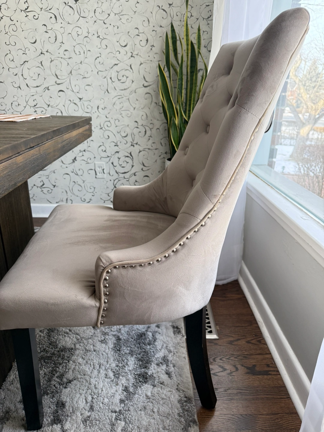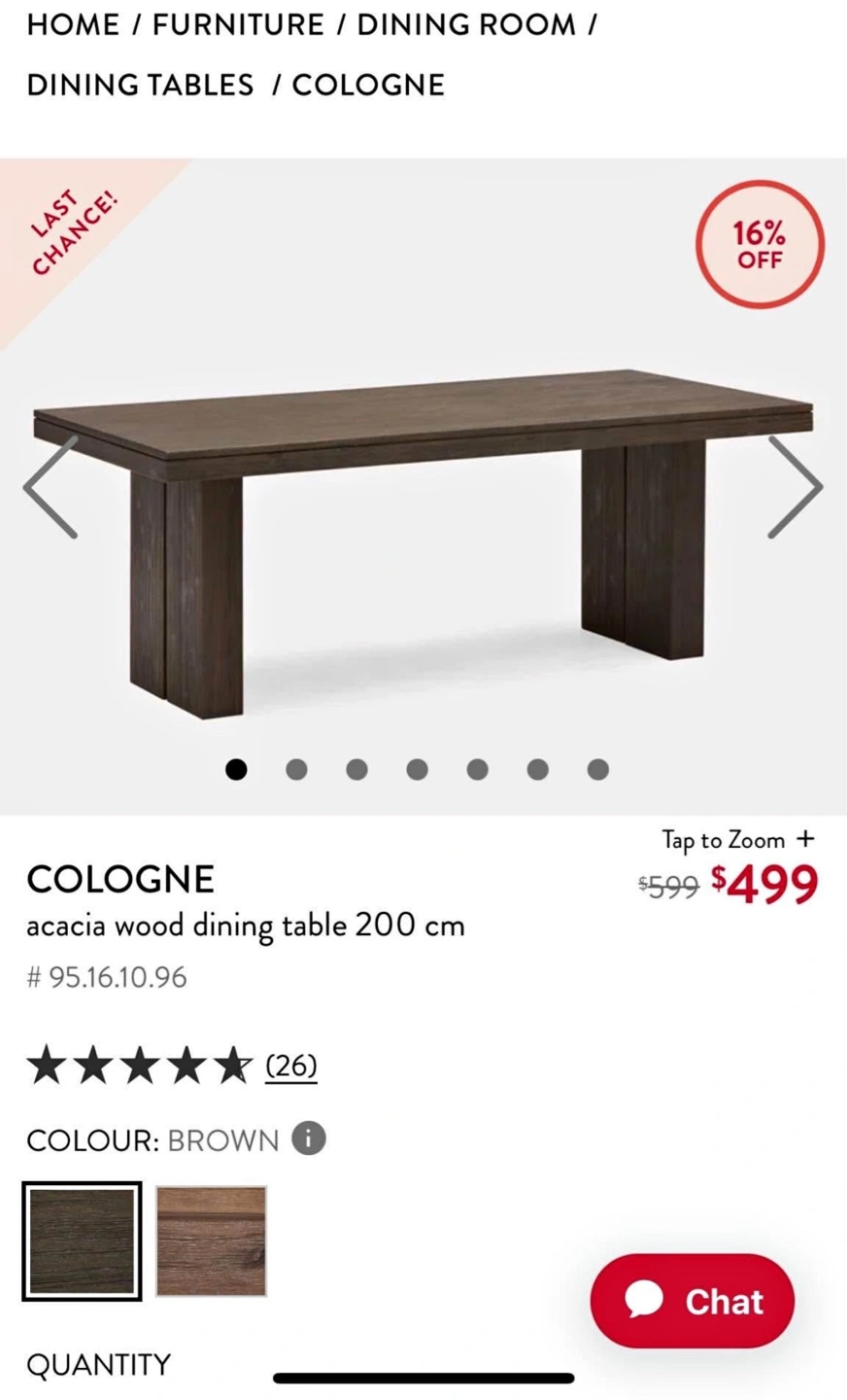 181. Table purchased for $599. Comes from smoke free kids free and pet free home. Selling for $400 Width: 200 cm (79") Height: 76 cm (30") Depth: 100 cm (39") FEATURES 100% acacia wood Seats 6-8 guests https://www.structube.com/en_ca/cologne-acacia-wood-dining-table-200-cm-95-16-10?pid=27271 2. Bridge Velvet fabric chairs with studs - each $50 21.5x24.4x36.6 inches. Note: Bench is not for sale.