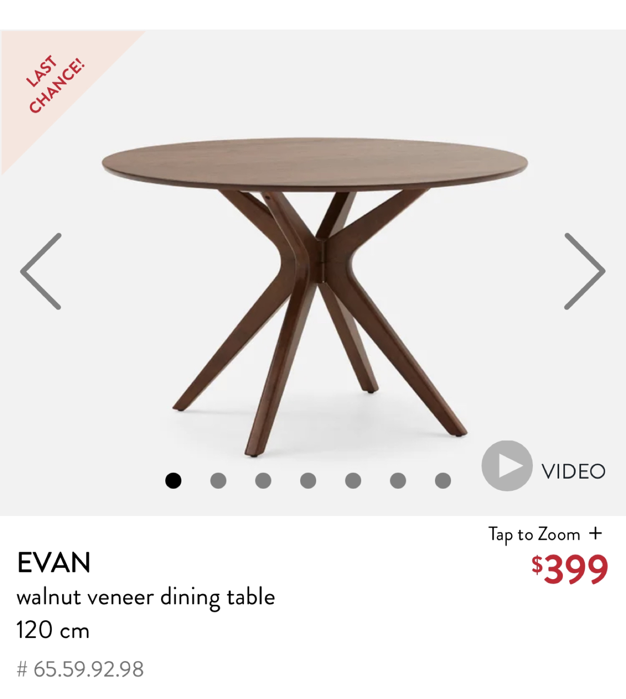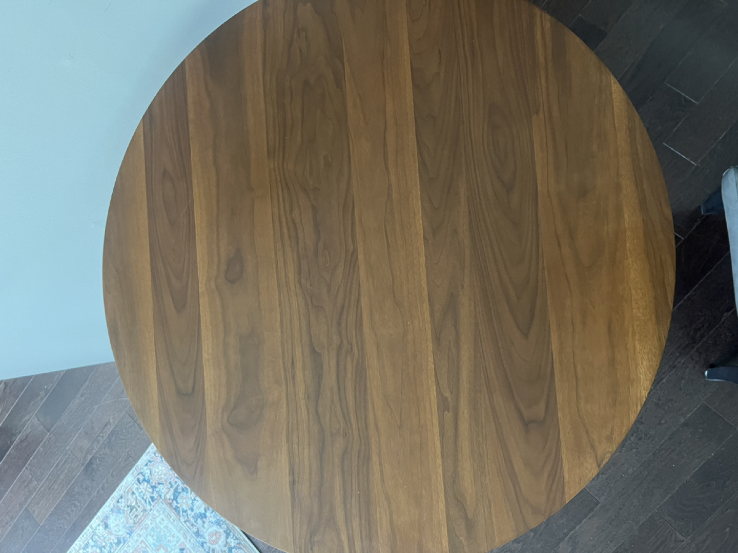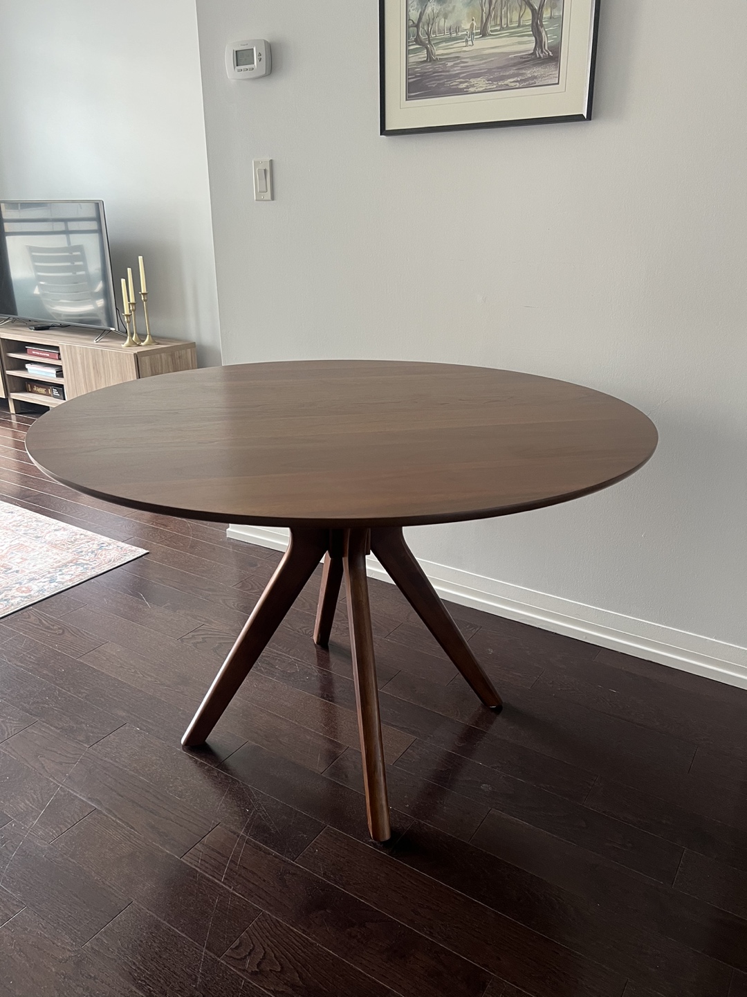 10- Selling for $250 (Retails for $399) - Very good condition, purchased less than a year ago - Seats 4 comfortably - Dimensions Width: 120 cm (47"), Height: 75 cm (30"), Depth: 120 cm (47") - Link to product here: https://www.structube.com/en_ca/evan-walnut-veneer-dining-table-120-cm-65-59-92#product_dimensions - Minor surface marking shown in picture Pickup only, Adelaide/Parliament area DM me if interested!
