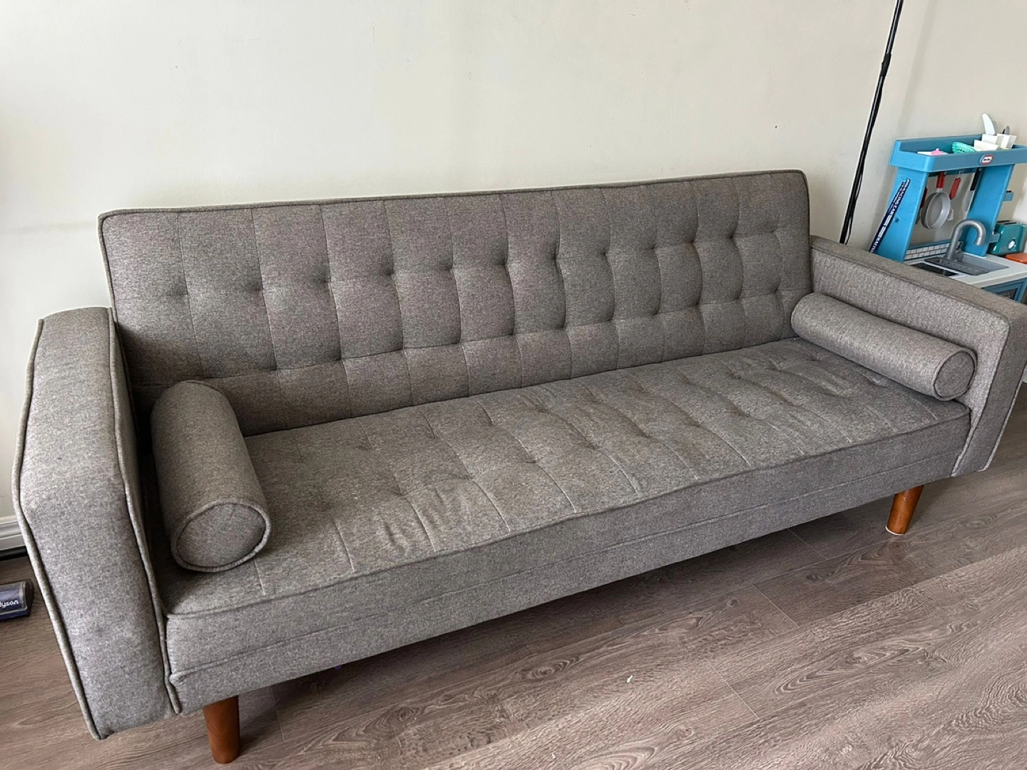 10Grey futon sofa with tufted back and two matching pillows. Wooden legs. Good condition. Sofa opens up into a twin size bed. Smoke free pet free home. Pickup only.