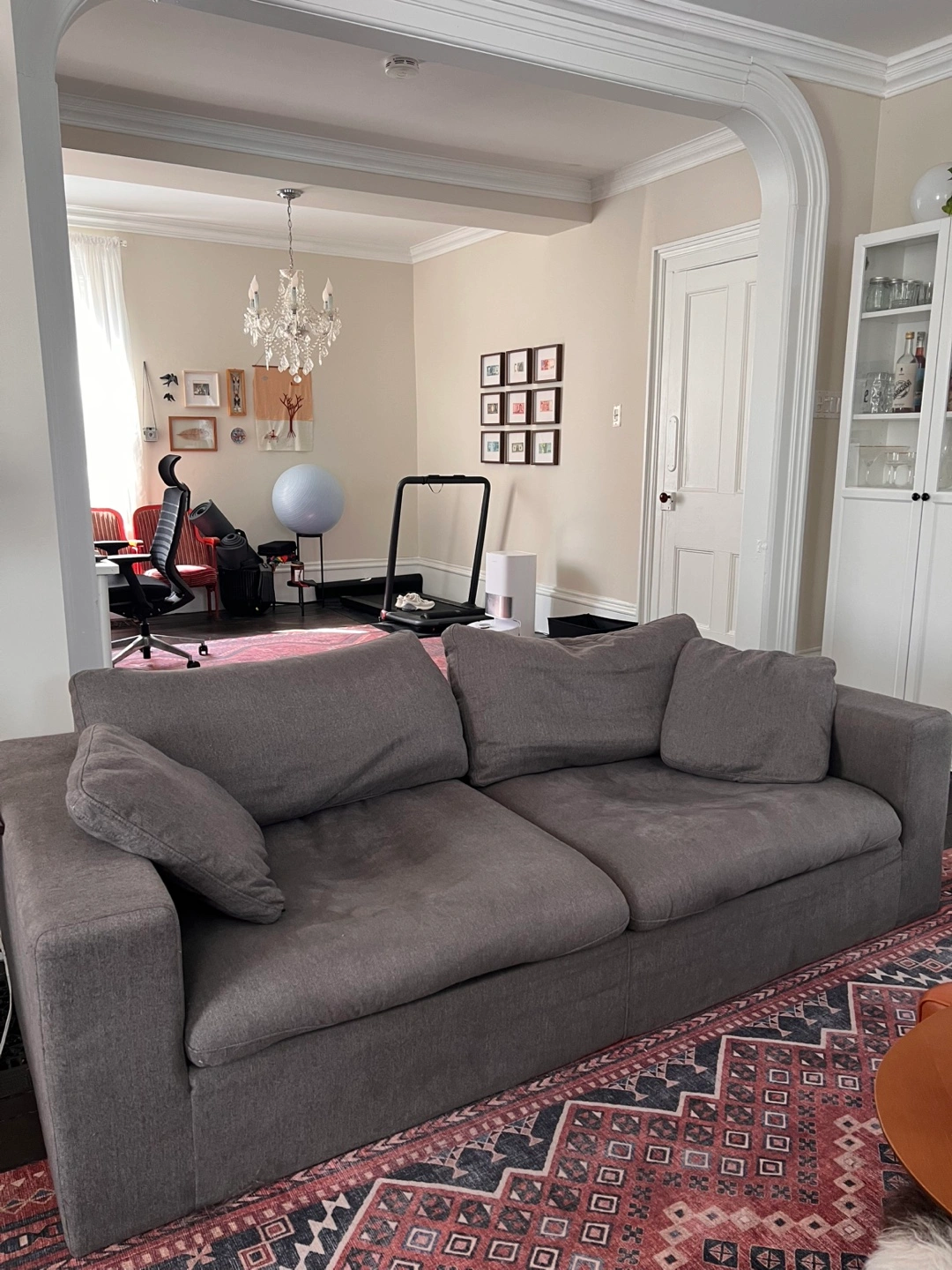 92Comfortable grey sofa, down filling, three seater. Durable fabric. Clean and well-maintained. 2 years of use. Original price was 1,299 CAD. Pick up only.
