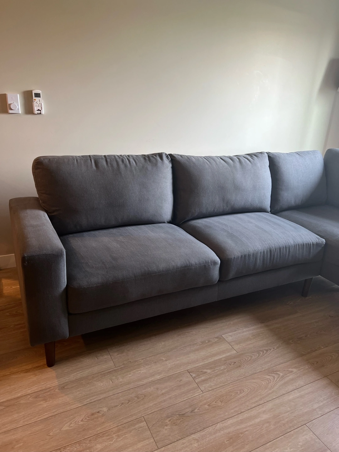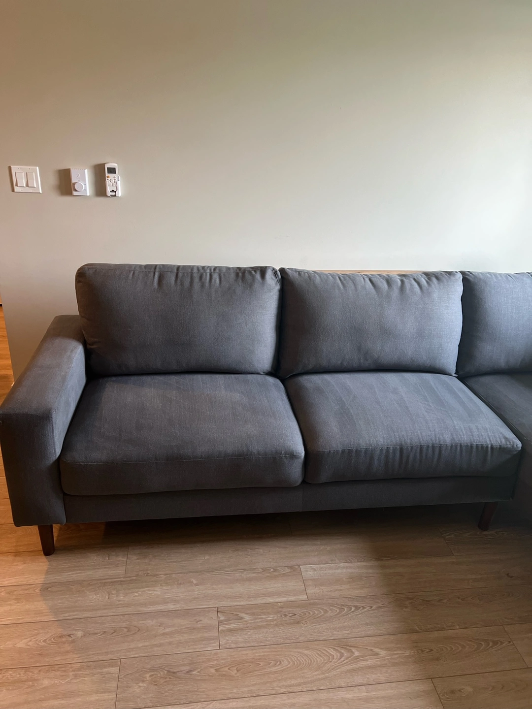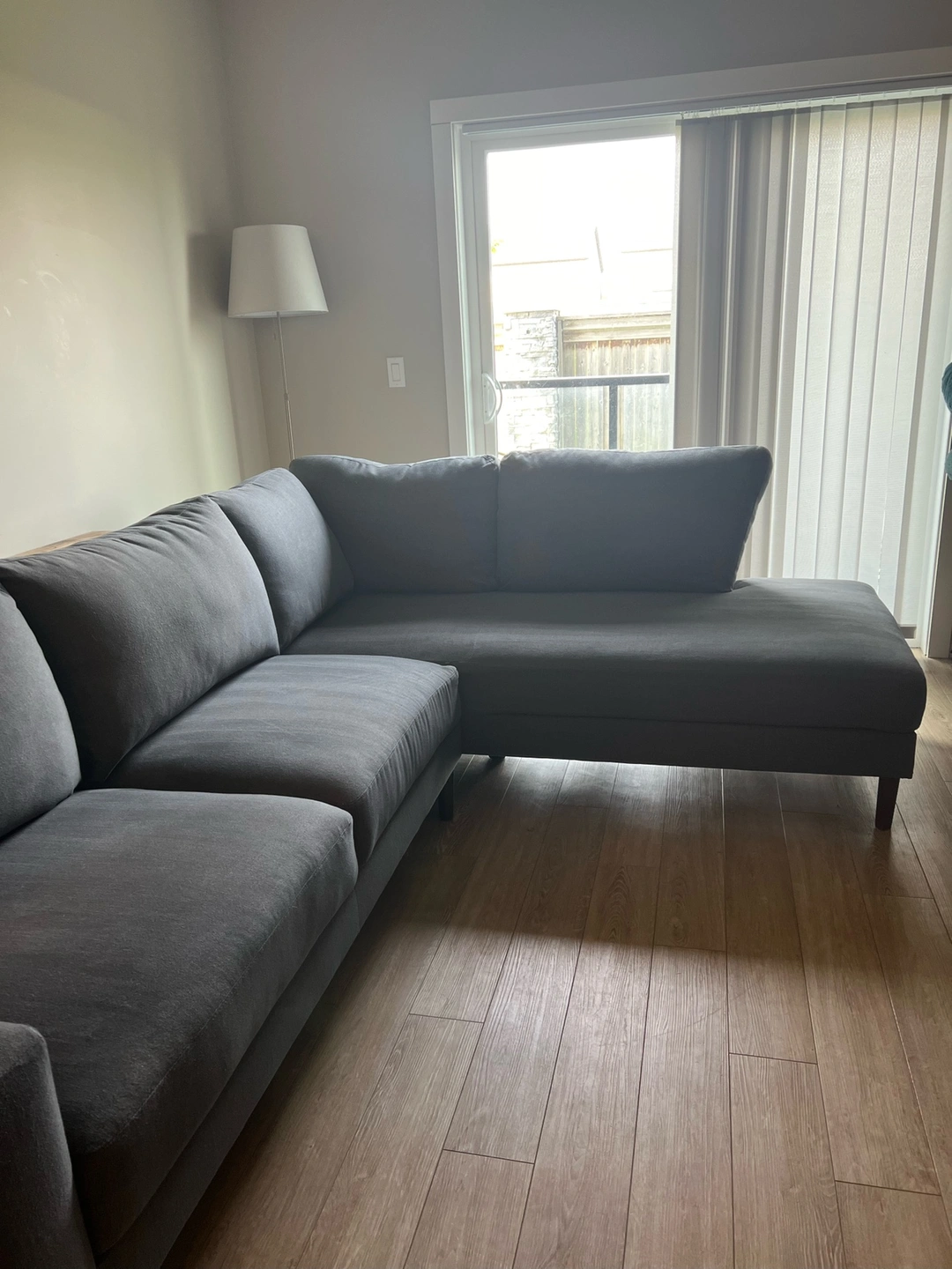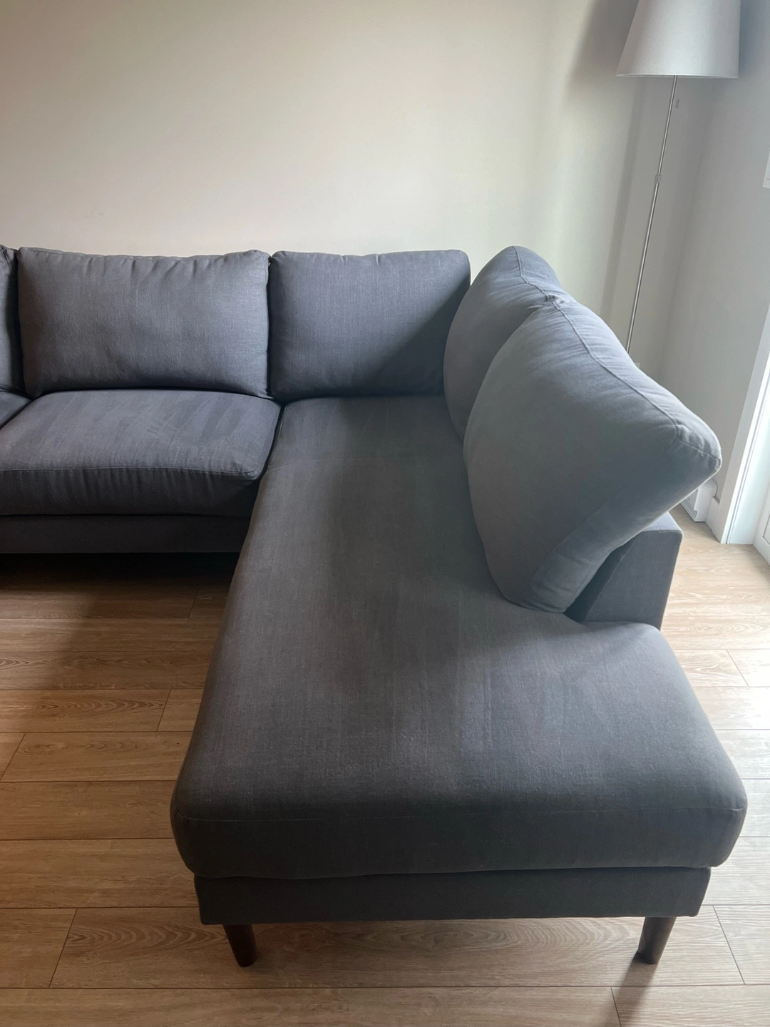 1 year old L shape couch from structube Has a small rip on an arm rest from our dog. Fabric underneath one section is torn from the dog but can’t seen. Pickup only in bridgewater. Couch is already apart as we had a new one get delivered $700 OBO