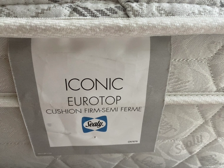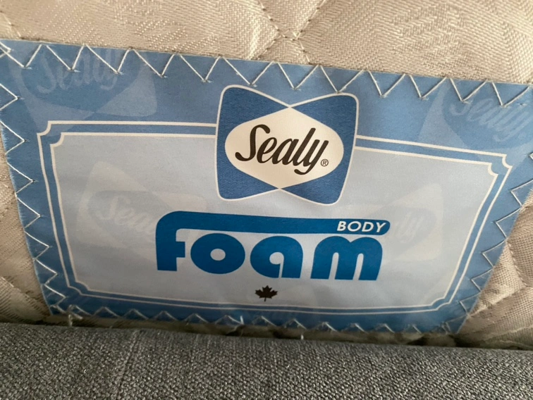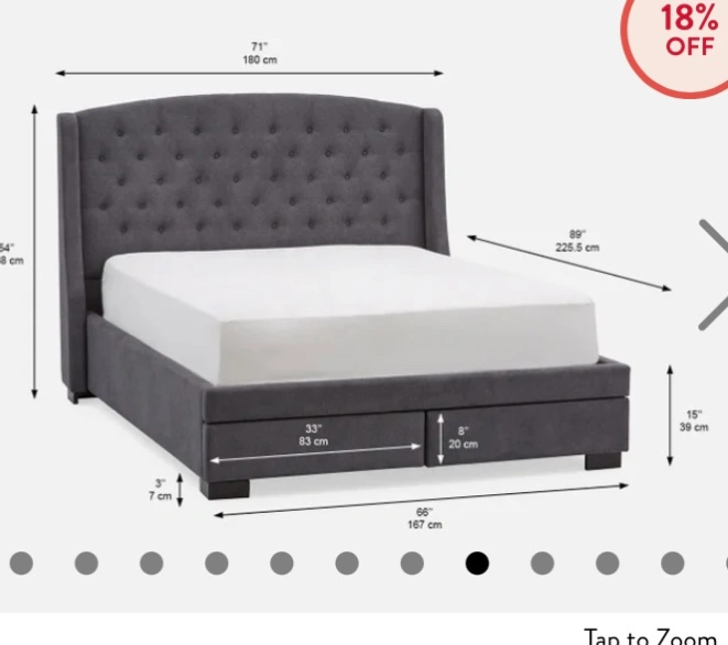 This is a queen-sized bed frame with a tufted headboard and two storage drawers. It is upholstered in a dark grey fabric and has wooden slats for support. A Sealy euro top semi firm foam mattress included. Bed was is second room, hardly used.