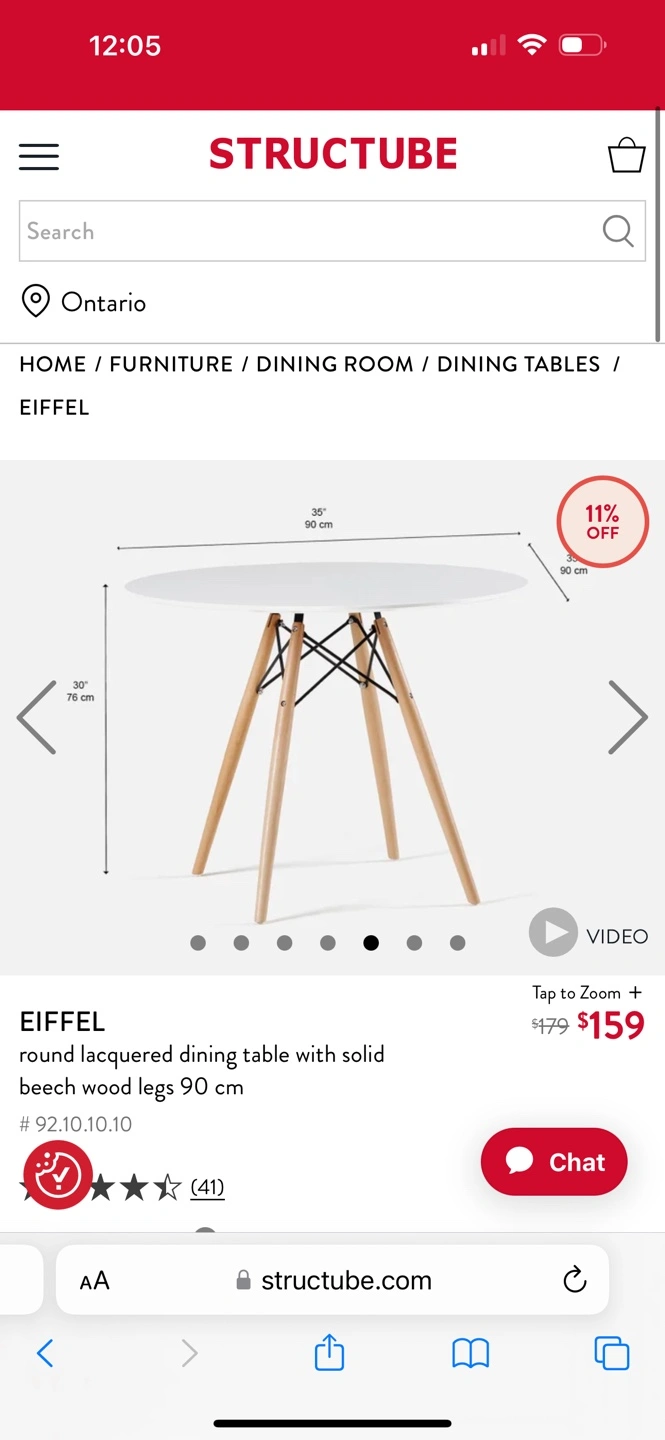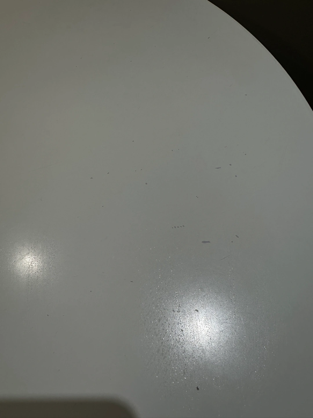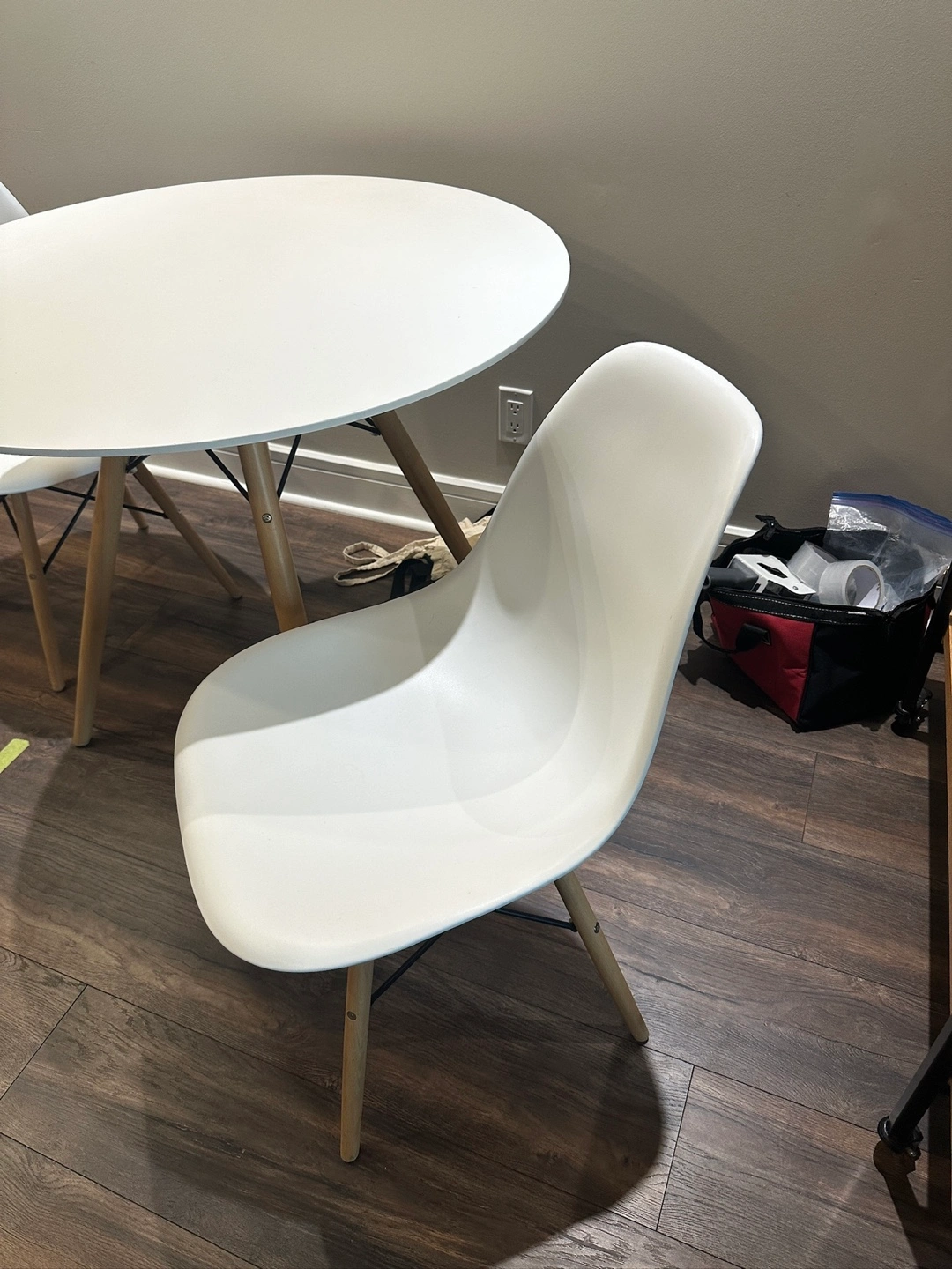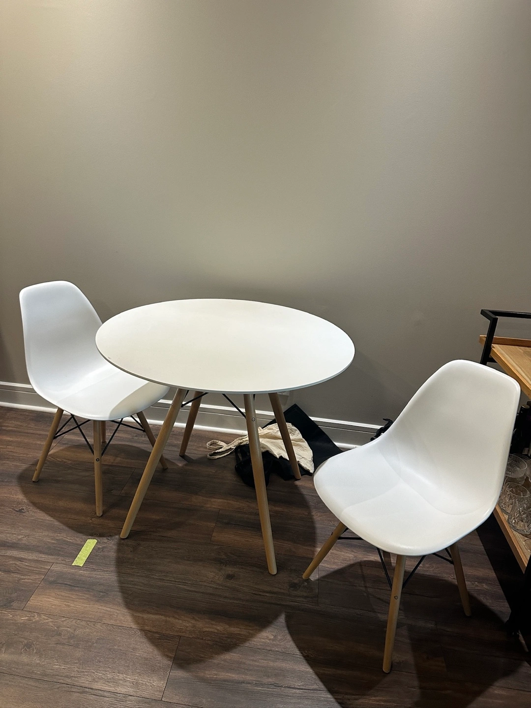 White round dining table with wood legs from Structube. Two matching white chairs included. Minimal wear on dining table that can be covered.