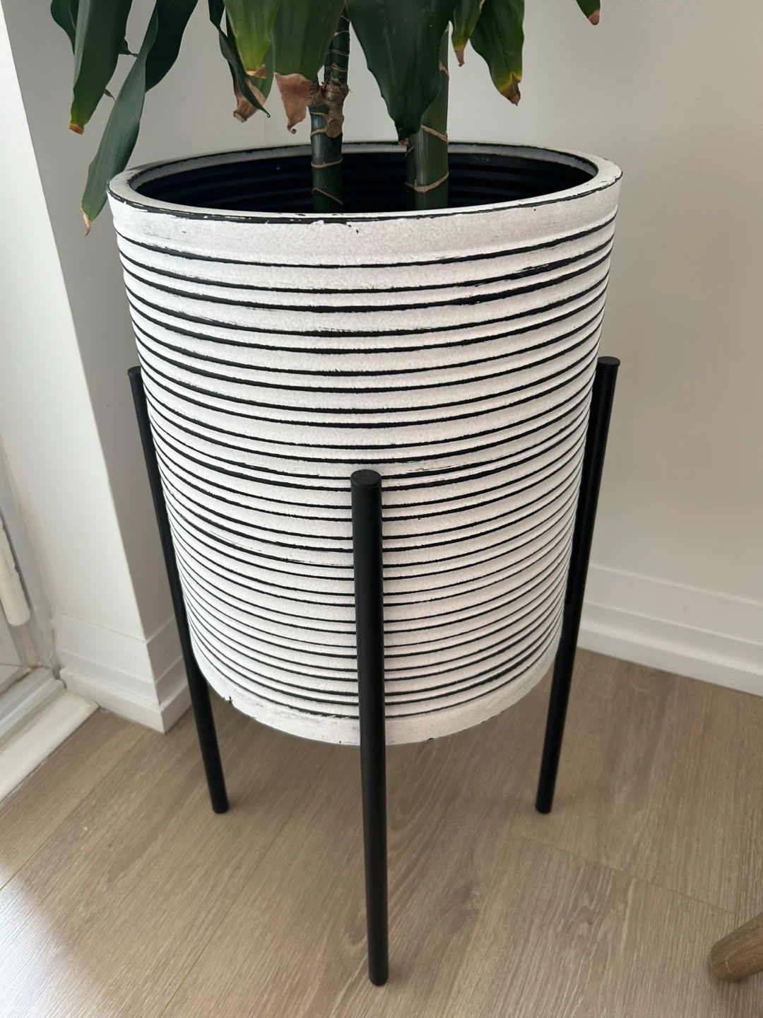 144Selling a textured planter with a stand. It's like new and ready to add some style to your space! The planter features a unique textured design and comes with a sturdy metal stand. PLANTER DIMENSIONS Width: 34 cm (13") Height: 66 cm (26") Depth: 34 cm (13")